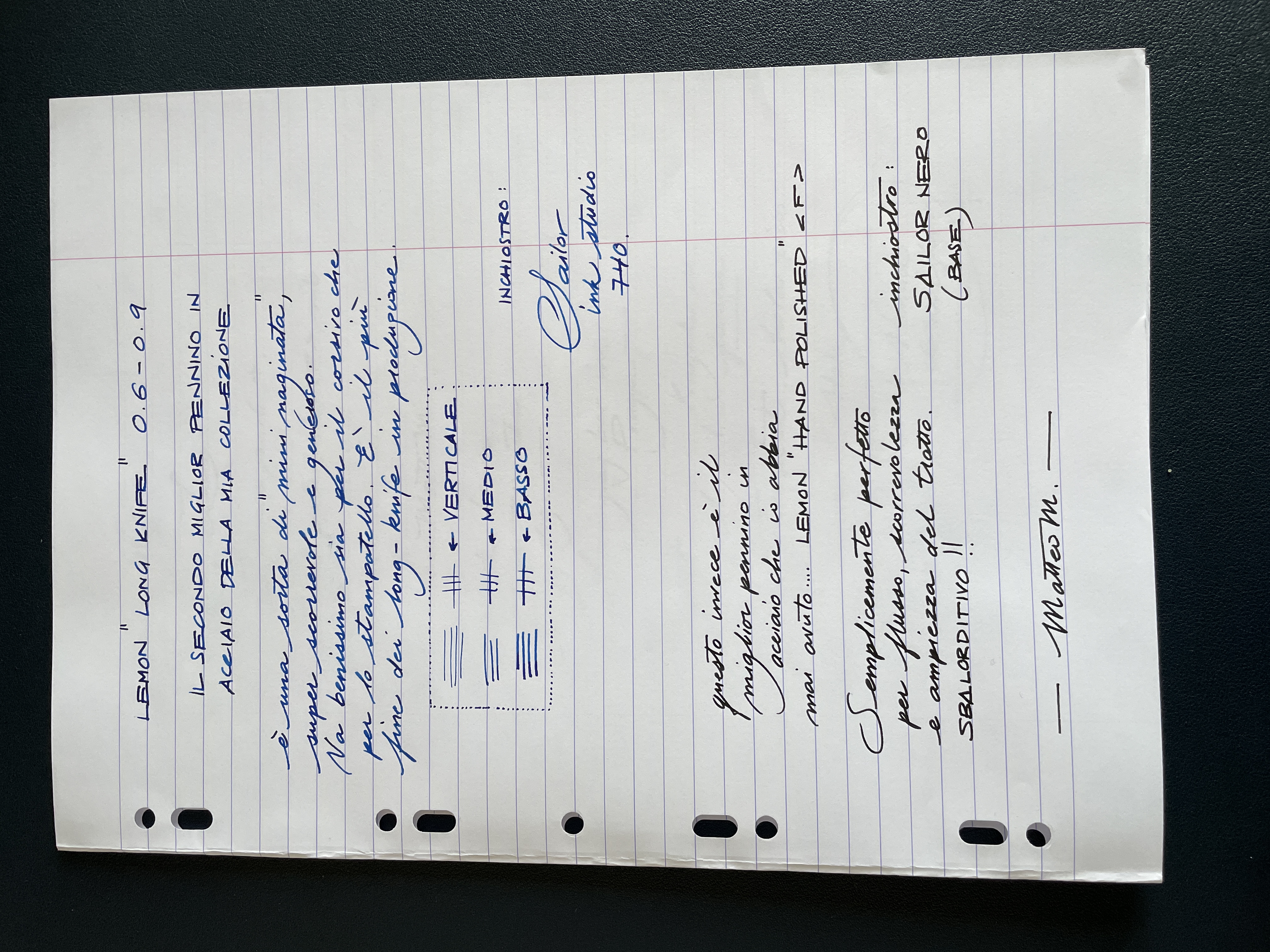 Anch'io mi sono lasciato tentare da questi Lemon, ho preso gli stessi pennini di Matteo, un F e un Long knife 0.6-0.9. Devo ancora provare l'F, il Long knife l'ho invece accasato nella mia Lorem Ipsum e che dire, pennino veramente ben fatto, punta lavorata bene, un po' meglio dei già ottimi Long knife di Hongdian.