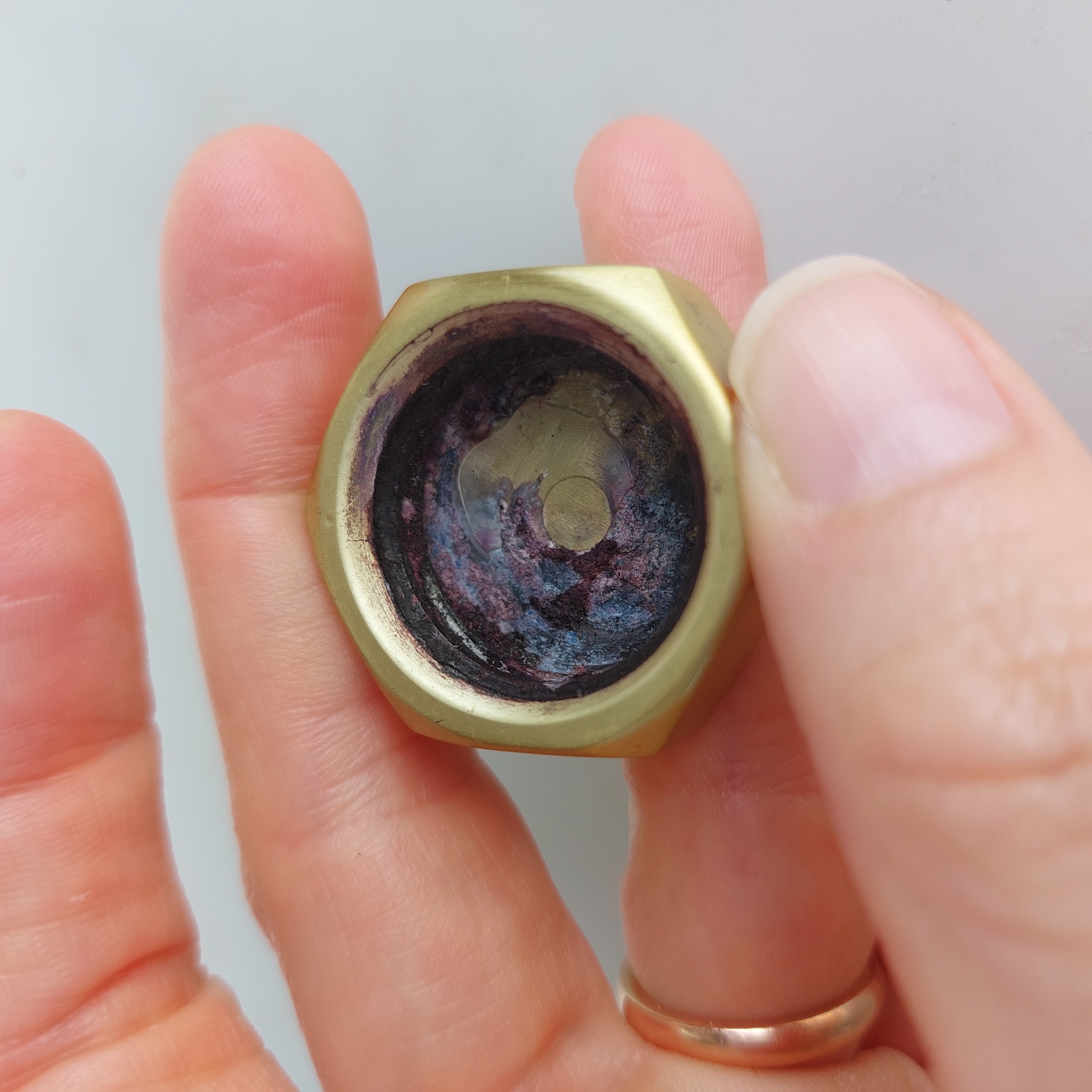 Il cappuccio è effettivamente in ottone, a forma di dado esagonale, già solo per questo motivo sarebbe impossibile che arrugginisca, l'ottone è una lega di metallo che non arrugginisce, lo si usa esattamente per questo per fare maniglie, pomoli, ganci, moschettoni e una miriade di altri oggetti che anche se esposti alle intemperie non arrugginiscono. Quella che vedi quindi non è ruggine.