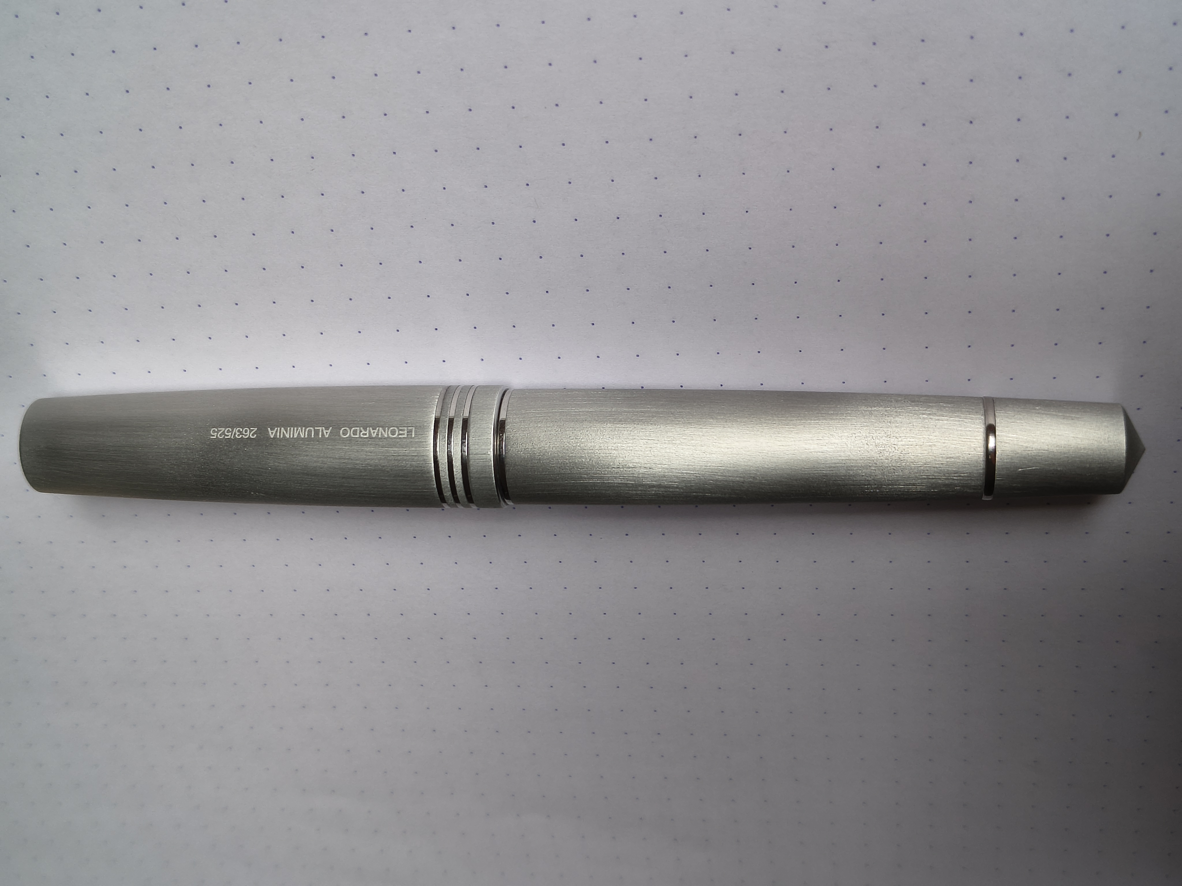 Per fare un paragone con le altre penne in metallo che posseggo, la versione in acciaio della Lamy 2000 pesa 45 grammi scarica, 20grammi il cappuccio e 34 corpo e gruppo scrittura. La Lamy Accent pesa 24 grammi, 10 grammi il cappuccio e 14 il corpo senza converter. La Lamy Safari AL pesa 20 grammi, 10 il cappuccio e 10 il corpo senza converter. L’alluminio al tatto è più bello dell’acciao, è vero anche per le Lamy e ancora di più per la Leonardo che è spazzolata. Certo l’acciaio è una lega eccezionale in molti ambiti, dalla chirurgia alla meccanica ma non in cucina, ad esempio. Il caffè fatto nella moka d’acciaio che va sull’induzione è pessimo e la qualità di cottura in alluminio è superiore a quella dell’acciaio per via della distribuzione del calore. L’acciaio è pur sempre una lega mentre l’alluminio è un elemento della tavola periodica degli elementi, duttile, resistente e ottimo conduttore. Ovviamente come resistenza tra l’acciaio e l’alluminio non c’è paragone ma Leonardo non ha fatto economia sul materiale usato, la penna è tornita da barra piena e posso fornire prova empirica che lo spessore dell’Aluminia la rende resistente. La mia ieri è volata dall’isola della cucina, ha sbattuto contro il poggiapiedi di ferro dello sgabello ed è atterrata, era messa in una di quelle bustine di Franklin Christoph senza imbottitura e non ha riportato nessuna ammaccatura. Con un uso quotidiano sulla penna saranno invece visibili i “graffi”, insomma assumerà un aspetto vissuto e questo deve piacere.