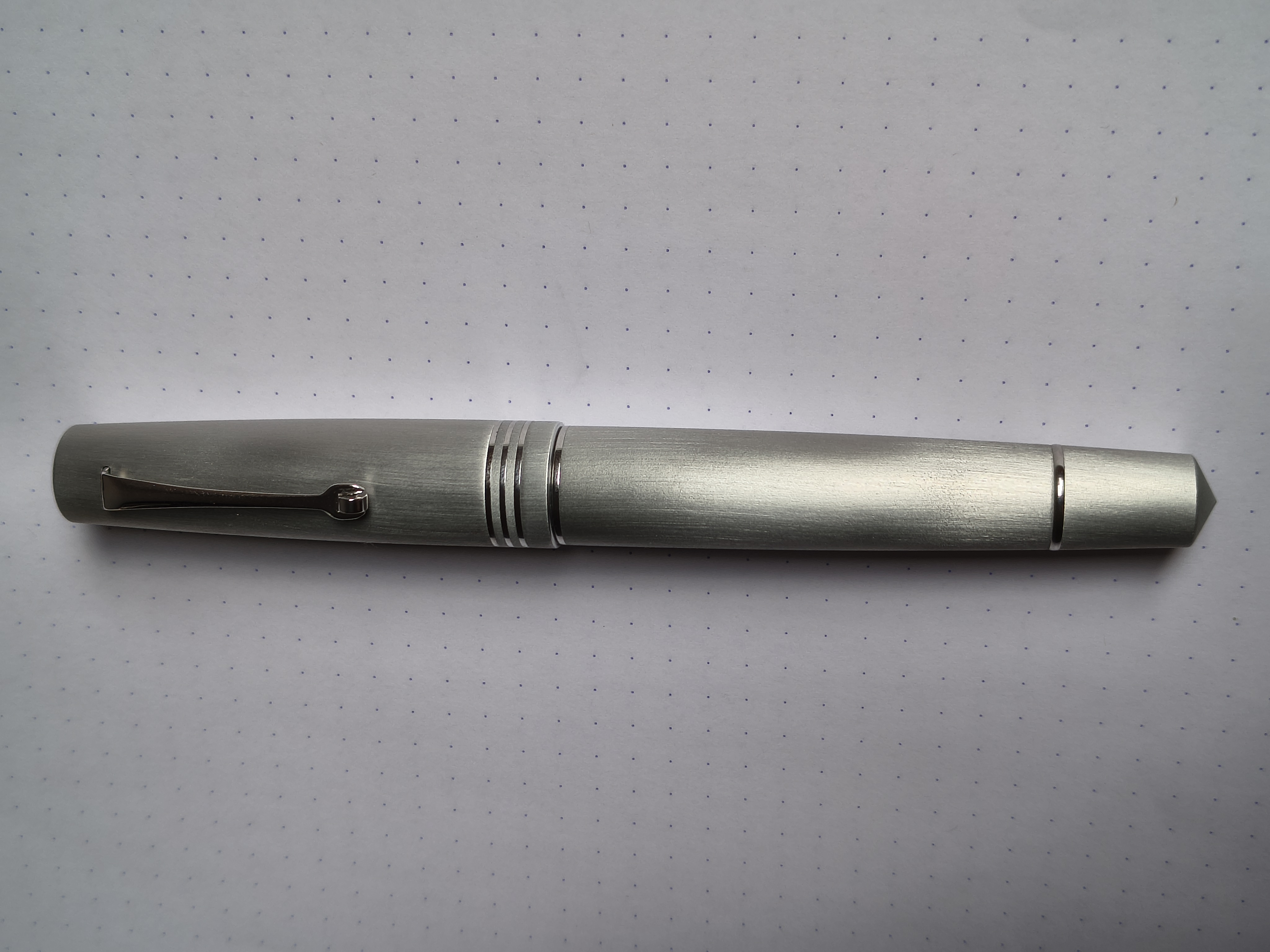 Confermo l'impressione positiva, il materiale è molto bello, la sensazione in mano è tipica dell'alluminio spazzolato, e si scalda subito, quindi non dà la sensazione di freddo di alcune penne in acciaio. La forma tipica della MZ è comoda in mano, non troppo lunga, né corta, ma giusta da poterla tenere in mano, anche senza calzare il cappuccio, e anche il diametro è in quel range da non sentirla né stretta da faticare a stringerla, né così larga da infastidire la presa. A guardarla è proprio bella, lucente. La finitura rodiata la trovo perfetta, in oro il contrasto sarebbe stato secondo me eccessivo.