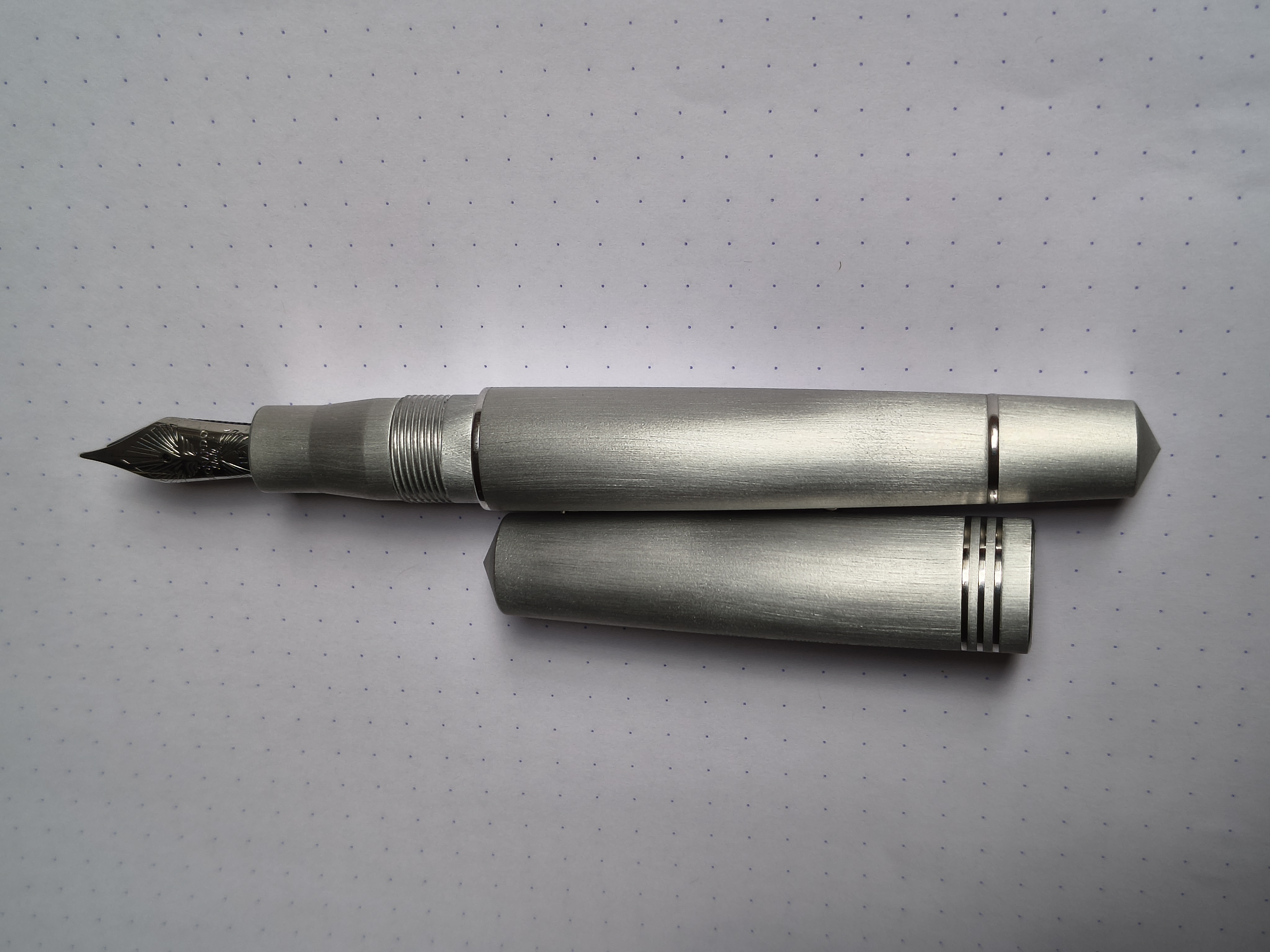 Veniamo ora al gruppo scrittura. La mia monta un pennino acciaio di misura EF e si tratterebbe del solito JoWo se non avessi chiesto in fase di ordine (aspettando di più per la spedizione) un nib tuning in cui ho specificato di gradire un leggero feedback. Come era successo un anno fa con la Poliedrica, anche questo JoWo passato per le mani di qualcuno in Leonardo, questo pennino è magnifico e non solo perché non perde un colpo e il flusso è perfetto, ma proprio per la qualità di scrittura e la bellezza (a mio parere) del tratto. Ho comunque fatto un blind test su un’amica che usa stilo senza avere la malattia in forma grave, e dopo aver provato due JoWo EF presi sfusi, usando la Aluminia pensava si trattasse di un altro scrittura.