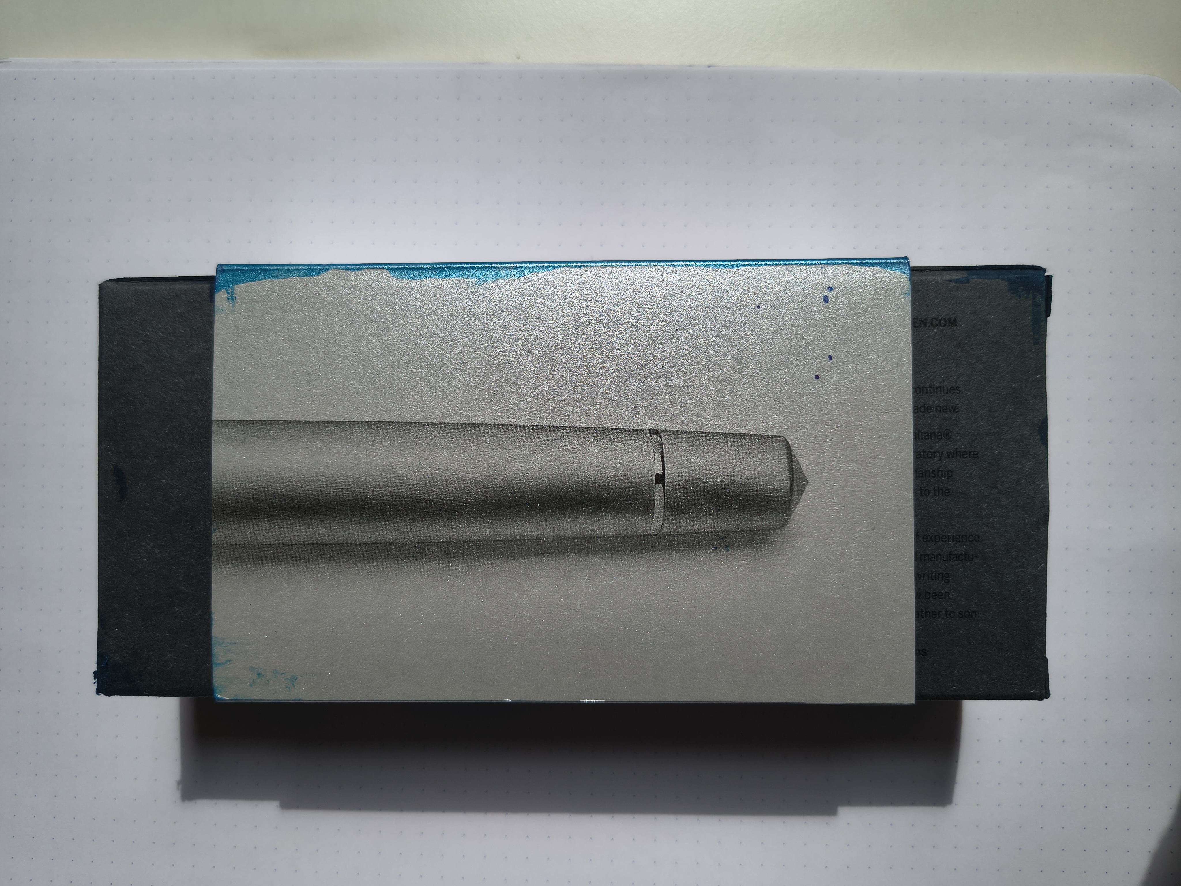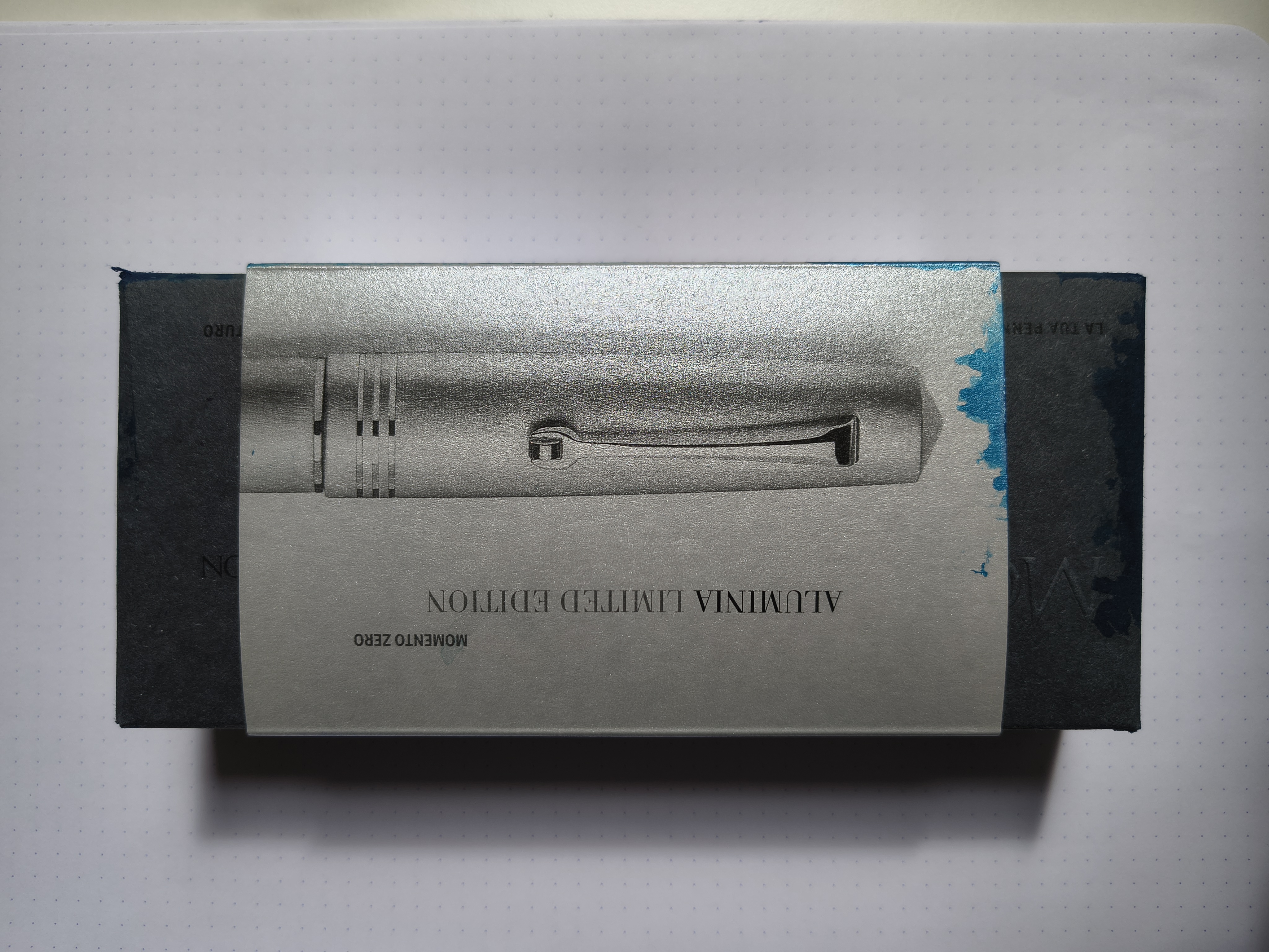 Contrariamente a quanto temessi, la penna non scivola. Ha una finitura spazzolata che la rende setosa e piacevole al tatto. Quando è arrivata l'ho subito usata per una lunga sessione di scrittura e non mi sono affatto stancata, anzi il peso è piacevole perché aiuta a stringere meno la penna e a lasciar scorrere il pennino sul foglio. Sul cappuccio c'è l'incisione “LEONARDO ALUMINIA 263/525.” lo ho scelto la versione con le metallerie rodiate, quindi tono su tono, tranne per il fatto che le finiture sono lucide e non spazzolate. Il packaging è molto bello, anche se la mia controscatola è arrivata sporca di inchiostro perche il corriere ha lanciato così bene il collo che si è spaccata una boccetta da 100 ml di Asa Blue, nonostante il pluribal e l’imballaggio a prova di partita baseball, tanto che il pacco grazie allo scotch ha tenuto nonostante il cartone si fosse inzuppato. La prima delle due controscatole è molto bella perché la carta simula la fattura del metallo spazzolato della penna.