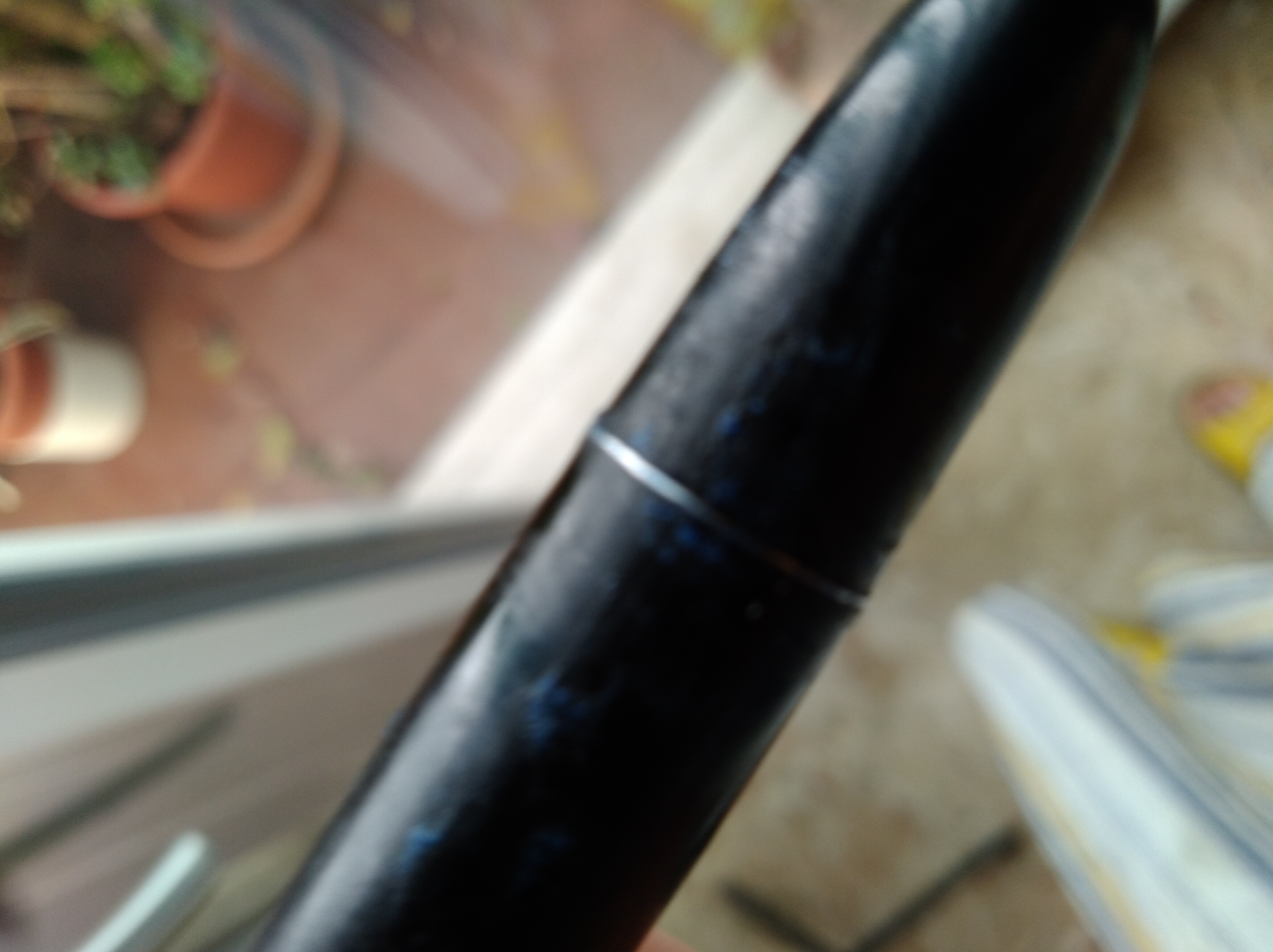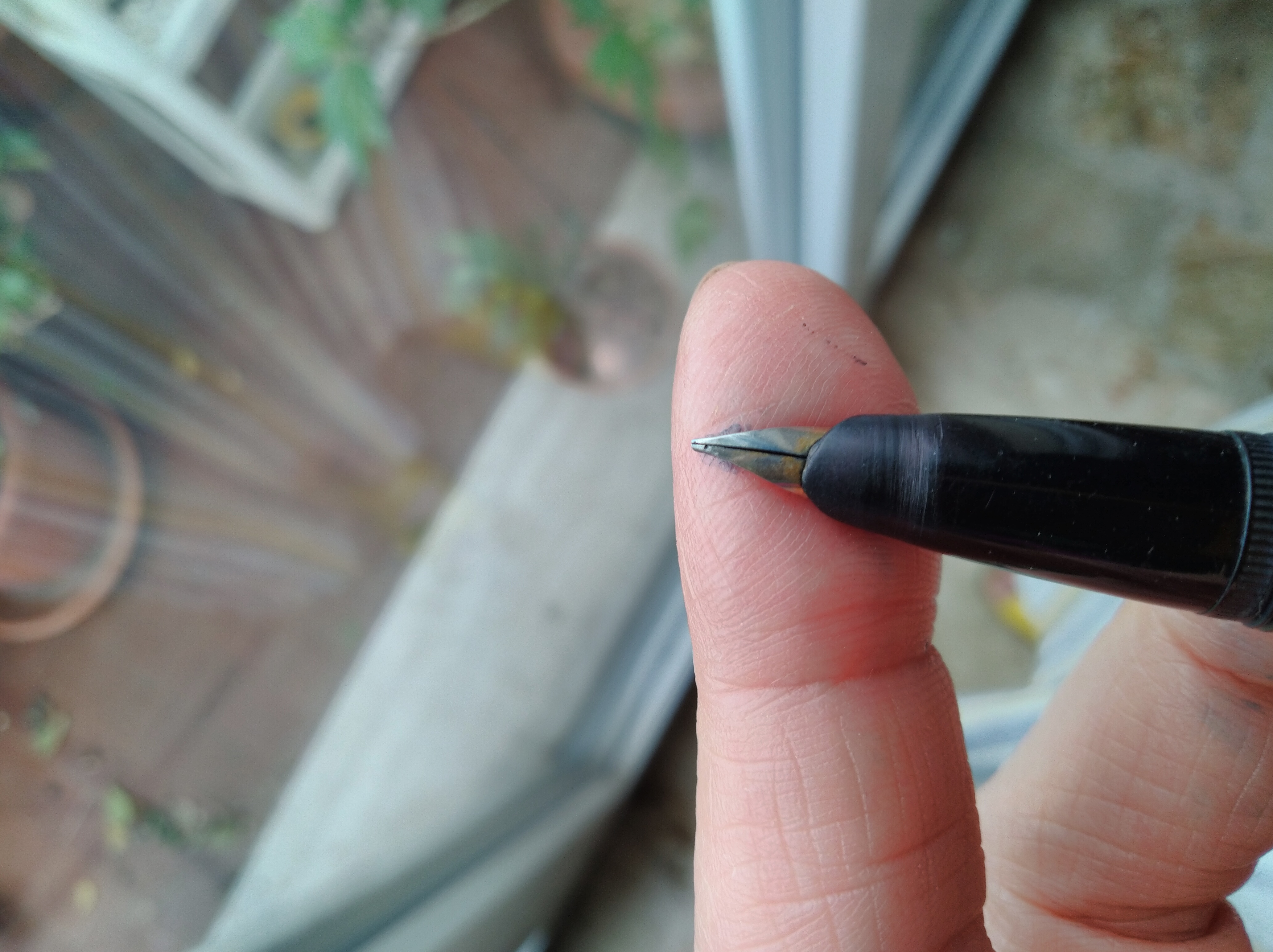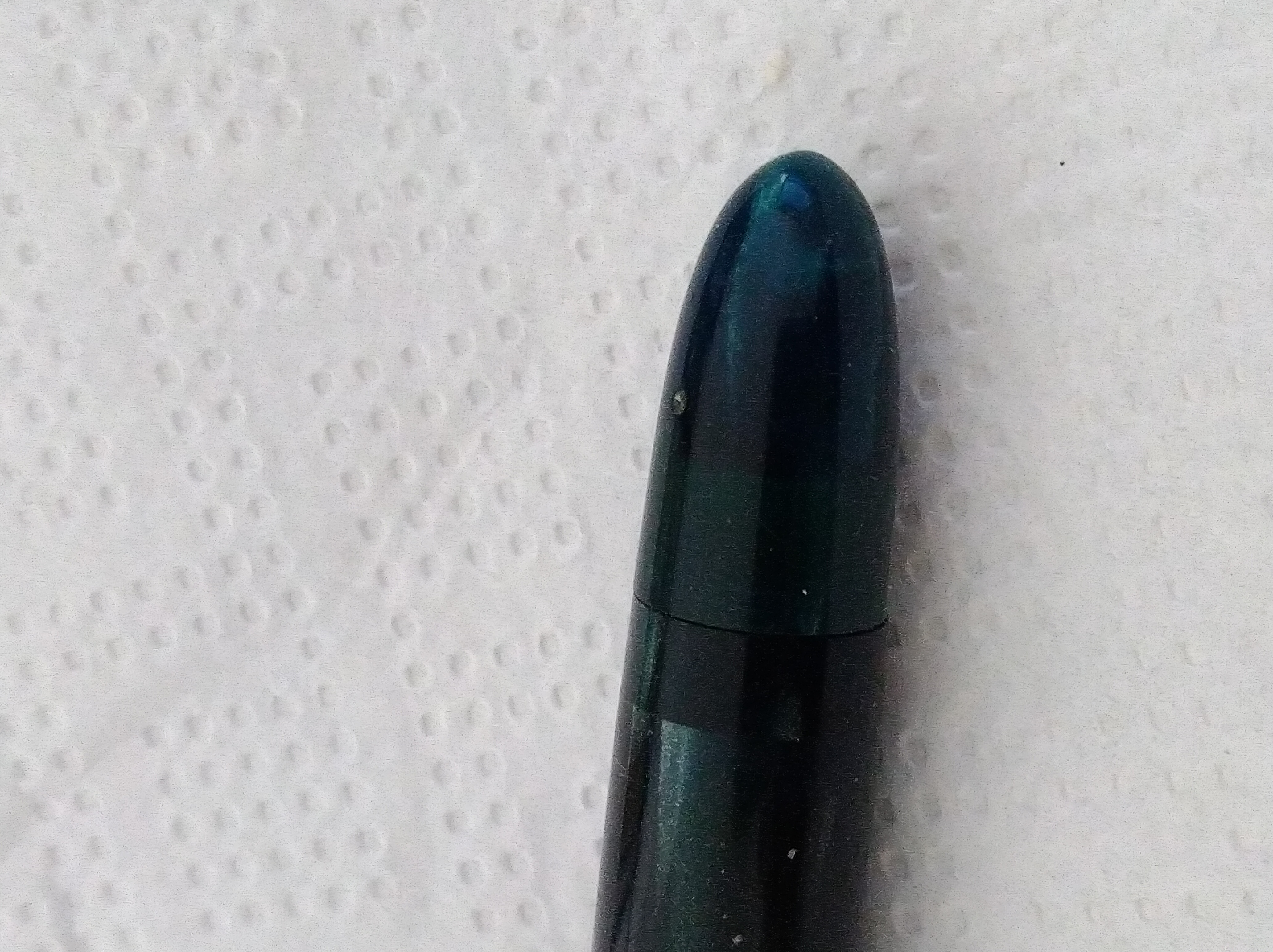 L'Aurora invece ha caricato l'acqua più volte, ma caricando in fretta l'ha fatta fuoriuscire dal fusto, un forellino microscopico sotto a il pasticcio di colla. Vado a studiarmi quel che c'è qui sopra, ma potrebbe essere lo sfiato? Quando ho ricaricato lentamente non è uscito nulla. Adesso la lascio a pennino in su con l'acqua e domani la scarico. Poi provo con l'inchiostro. Magari il pasticcio è un tentativo di chiudere il forellino con della colla. Boh.