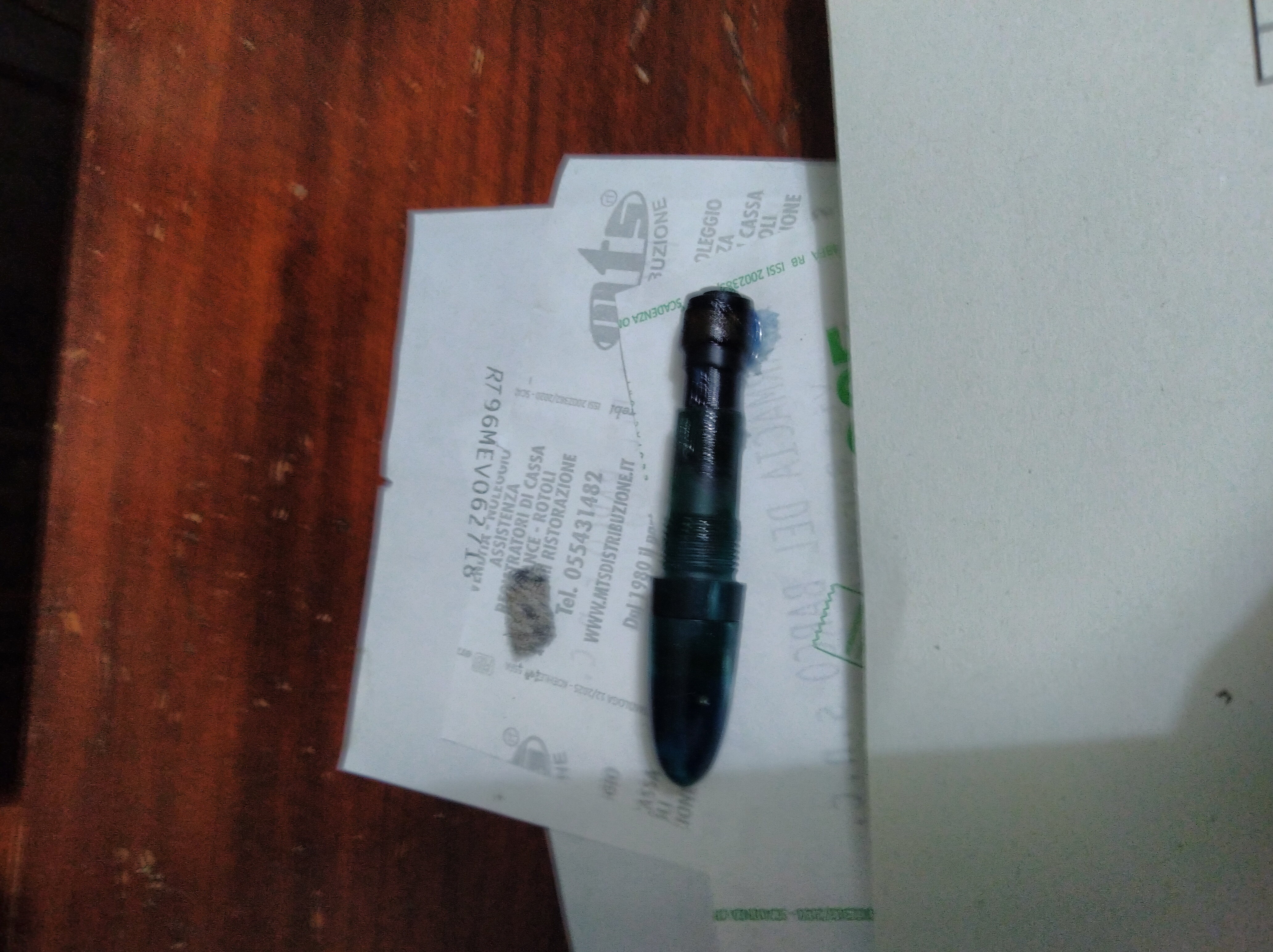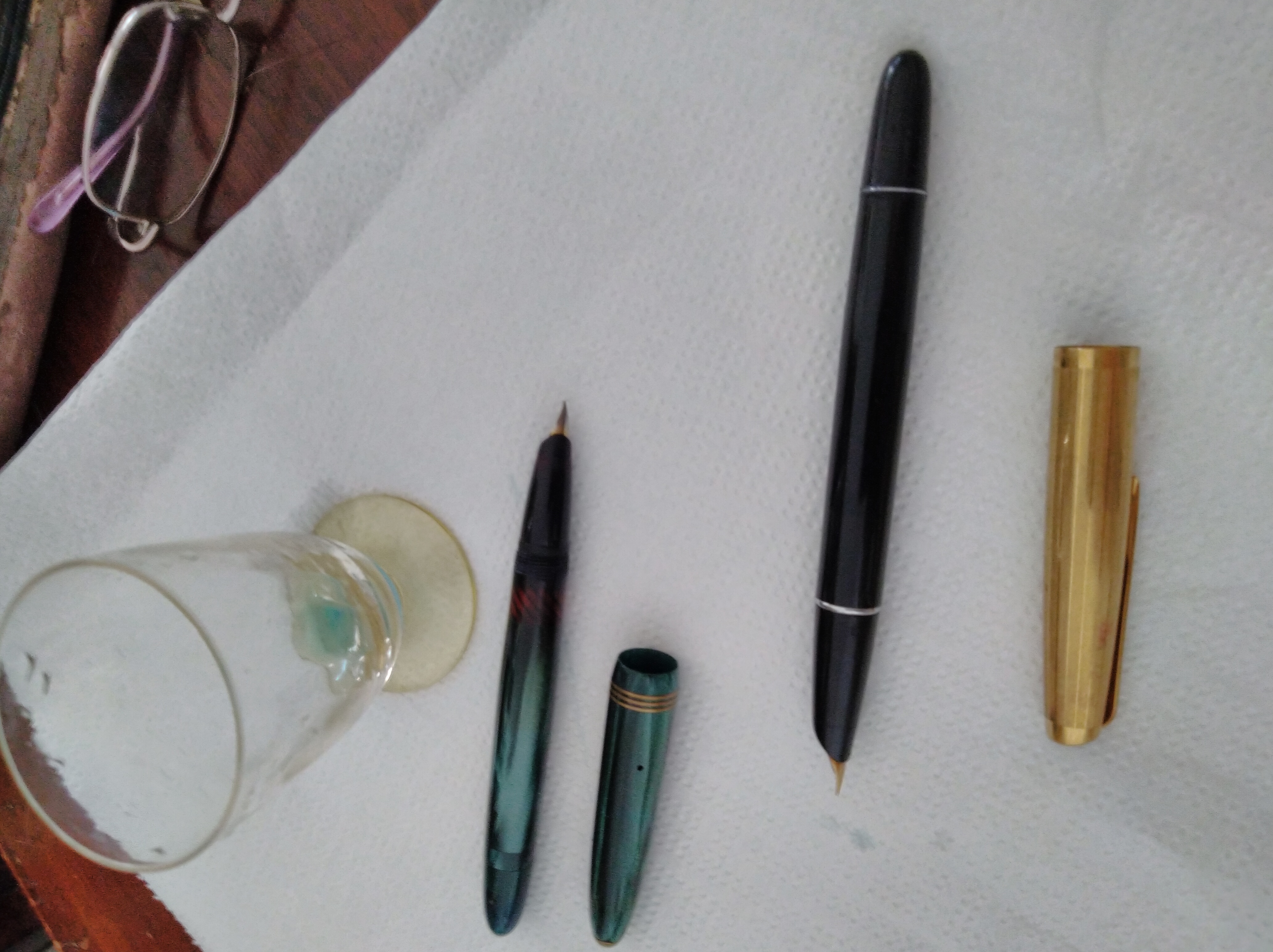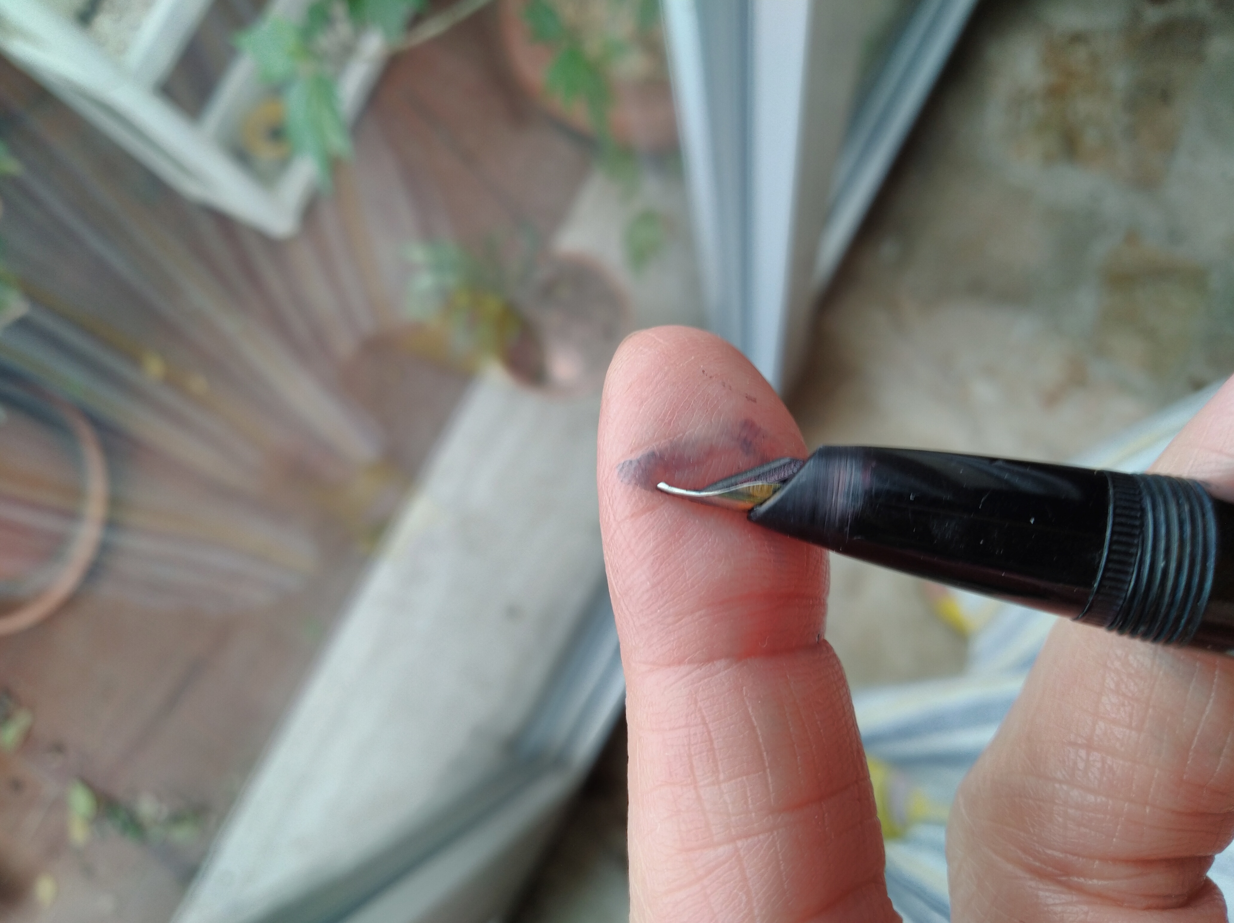 L'Aurora invece ha caricato l'acqua più volte, ma caricando in fretta l'ha fatta fuoriuscire dal fusto, un forellino microscopico sotto a il pasticcio di colla. Vado a studiarmi quel che c'è qui sopra, ma potrebbe essere lo sfiato? Quando ho ricaricato lentamente non è uscito nulla. Adesso la lascio a pennino in su con l'acqua e domani la scarico. Poi provo con l'inchiostro. Magari il pasticcio è un tentativo di chiudere il forellino con della colla. Boh.