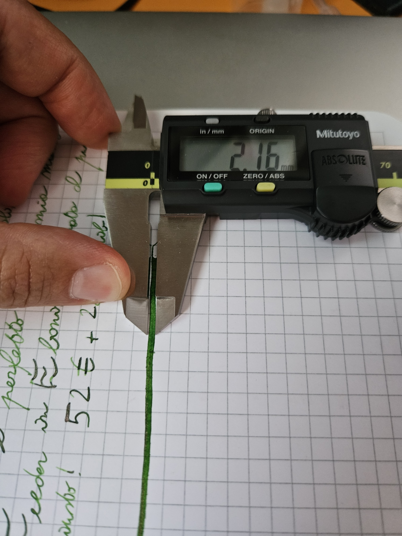 2) Quello che ho acquistato io è EF 0,5 con il cut type (così come lo descrivono loro) Ultra Flex. Premendo il massimo ragionevole pima che il flusso si interrompa, per eccessiva distanza tra i rebbi del pennino, sono arrivato a 2,16mm. (vedi foto)
