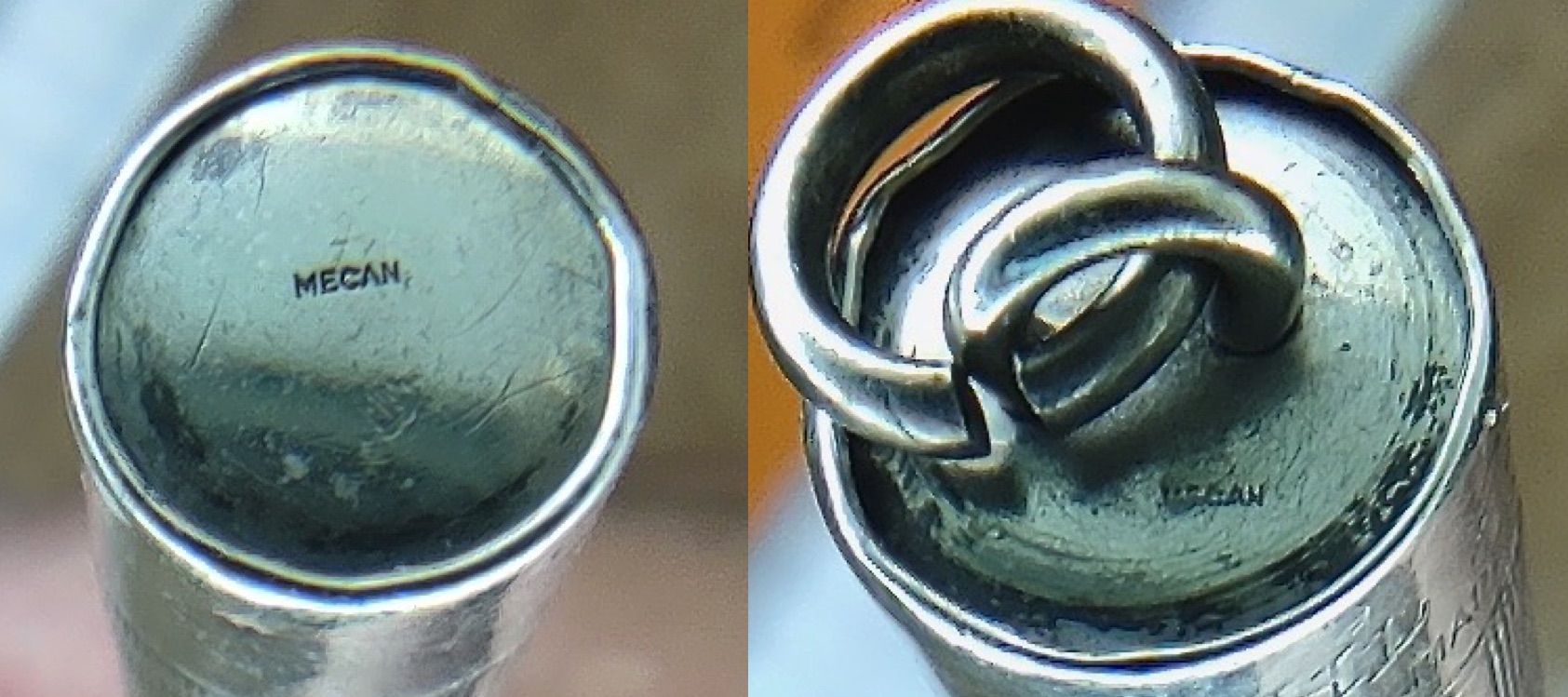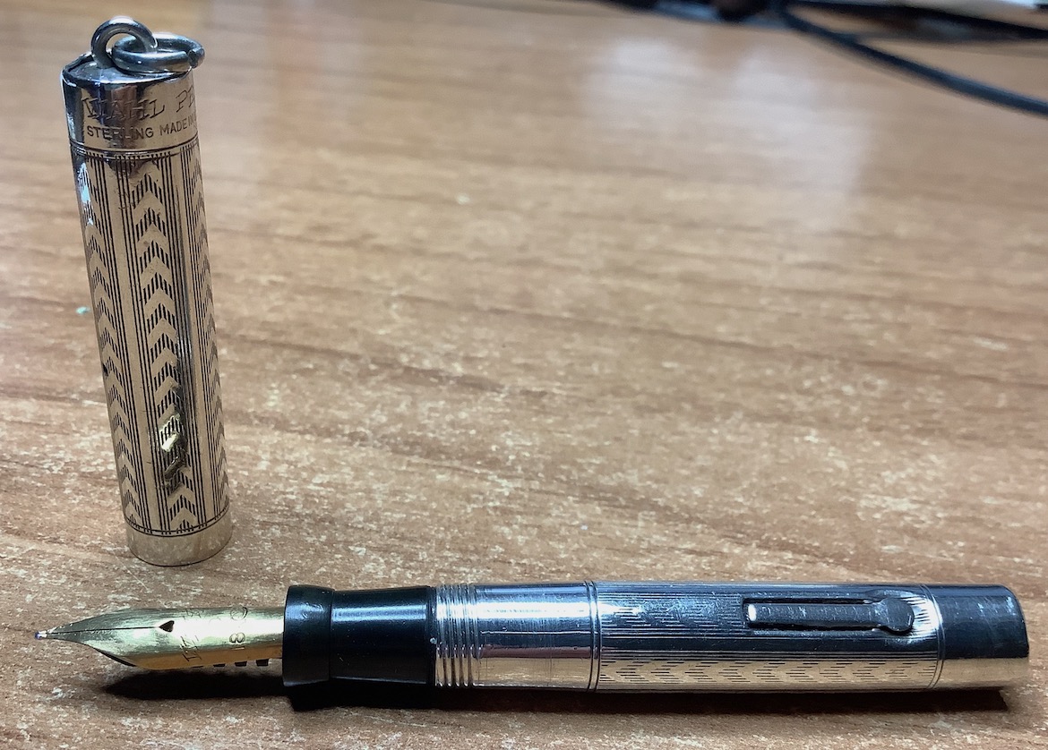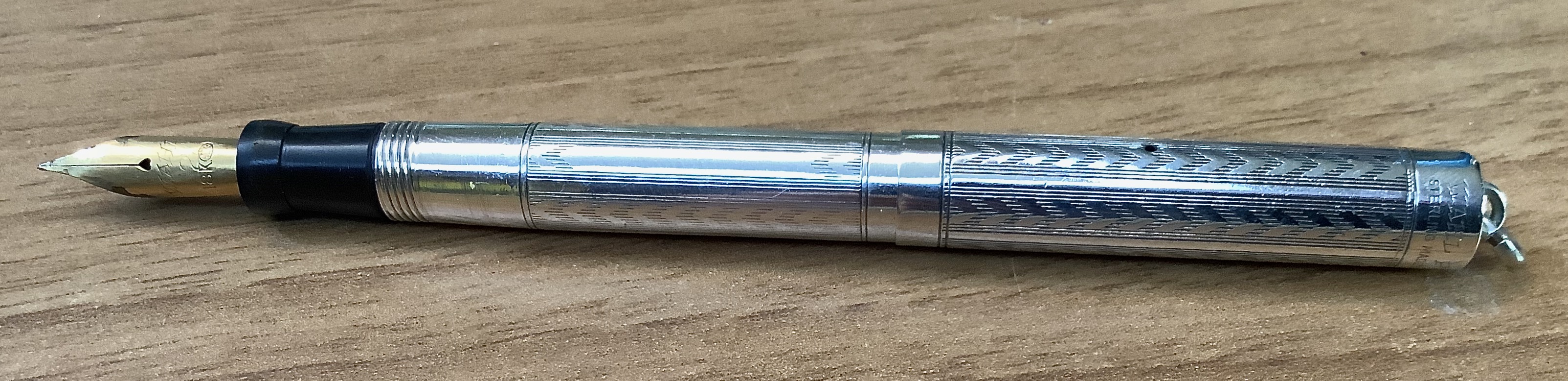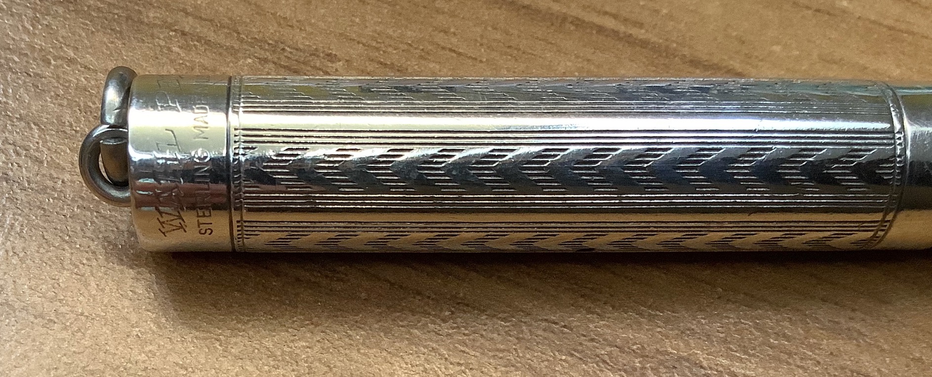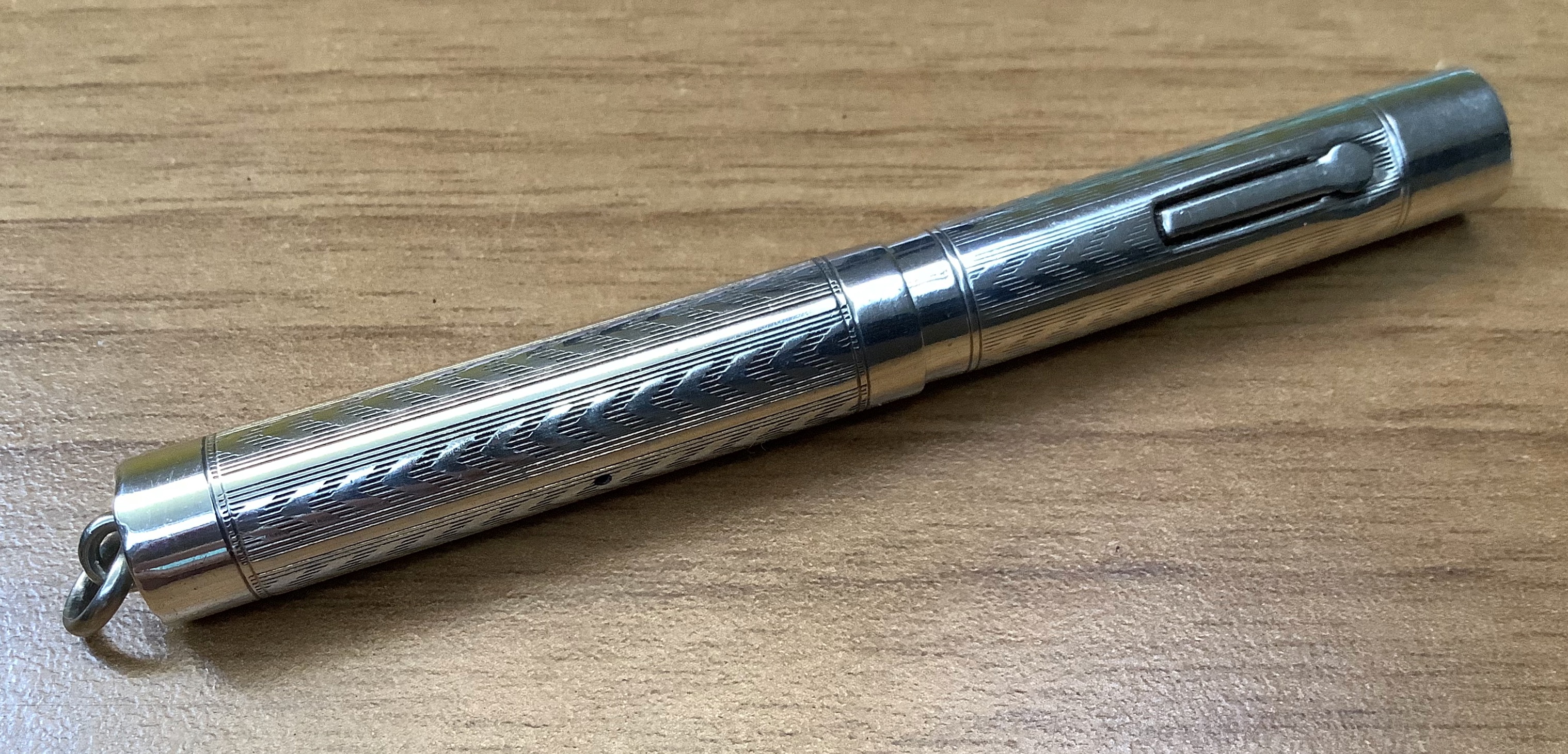 Questa è una piccola stilografica con disegno Check , conosciuto anche come Chevron e abbastanza comune. Realizzata in argento massiccio, probabilmente prodotta a metà anni venti.