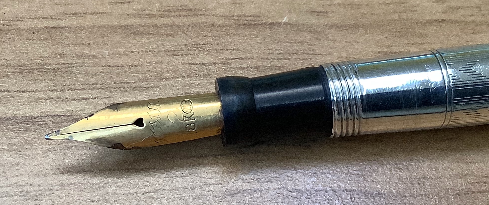 Pennino WAHL misura 2 a diciotto carati (probabilmente per il mercato francese); sopra la filettatura, a ridosso della lavorazione sul fusto, è possibile intravedere l'incisione STERLING.