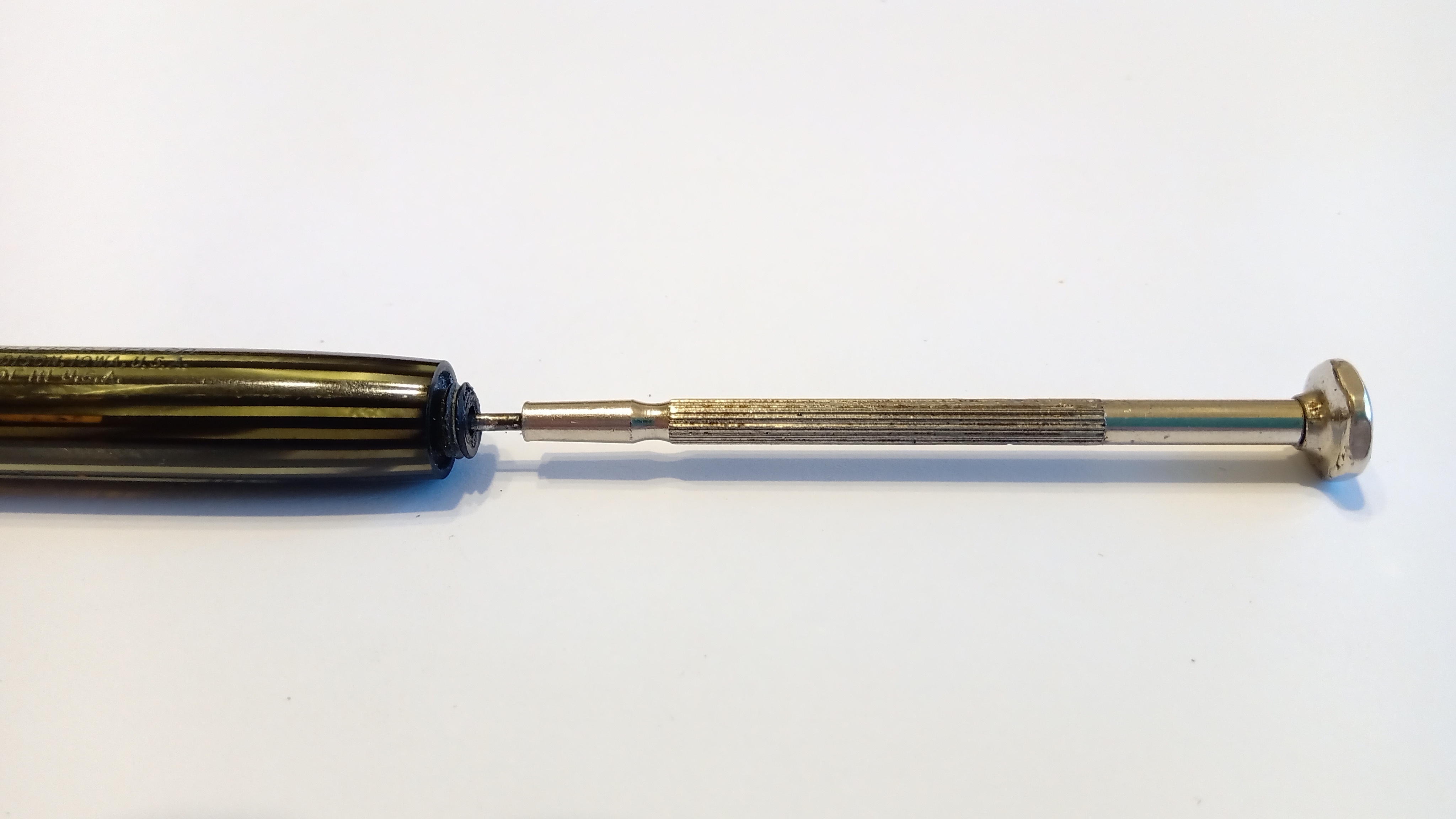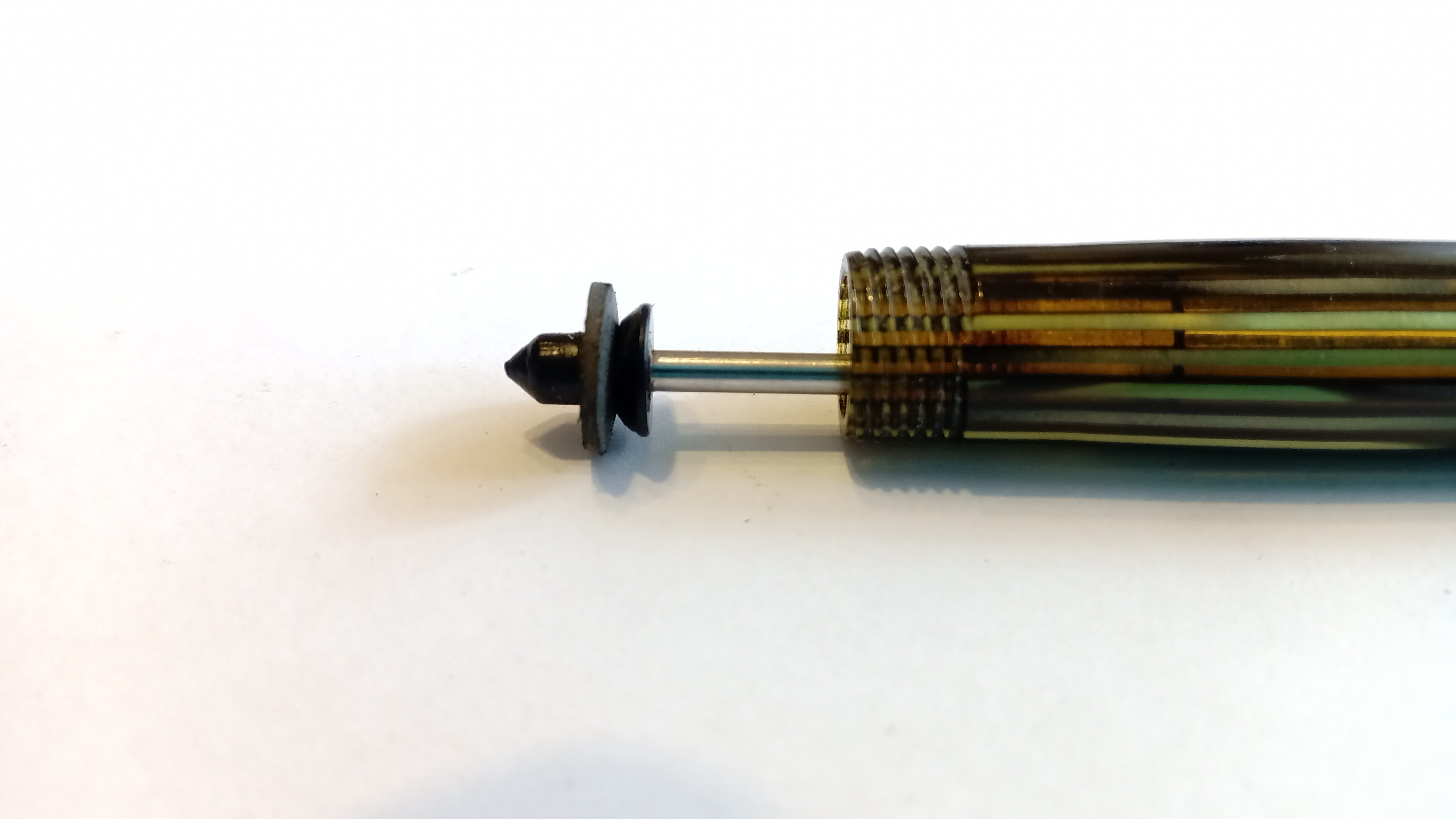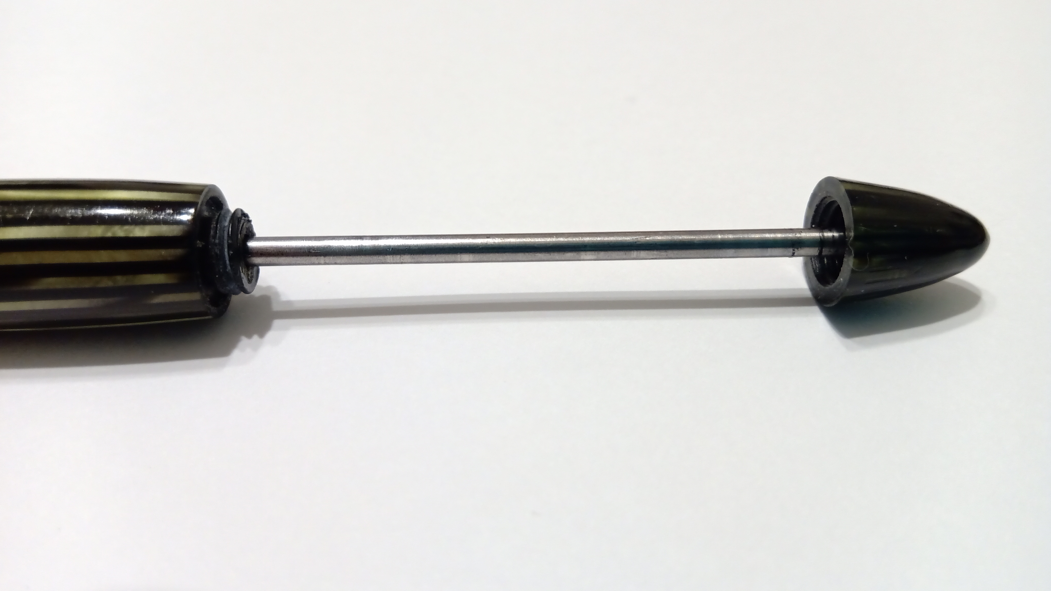 in questo modo e con un piccolo bastoncino di acciaio con estremità piatta, come nel caso precedente, daremo dei colpetti secchi spingendo l'alimentatore insieme alla penna fino a estrarlo dall'impugnatura...