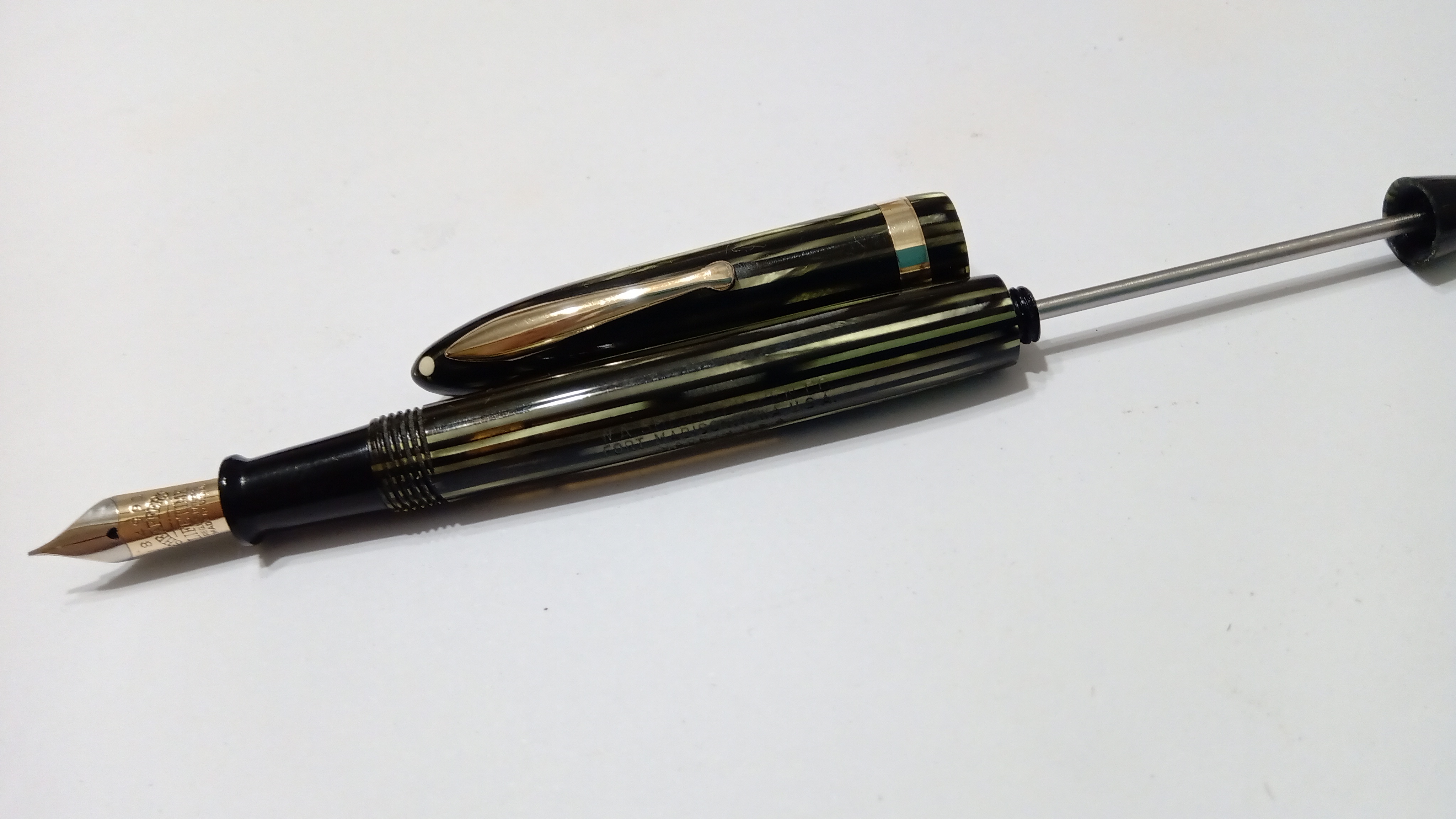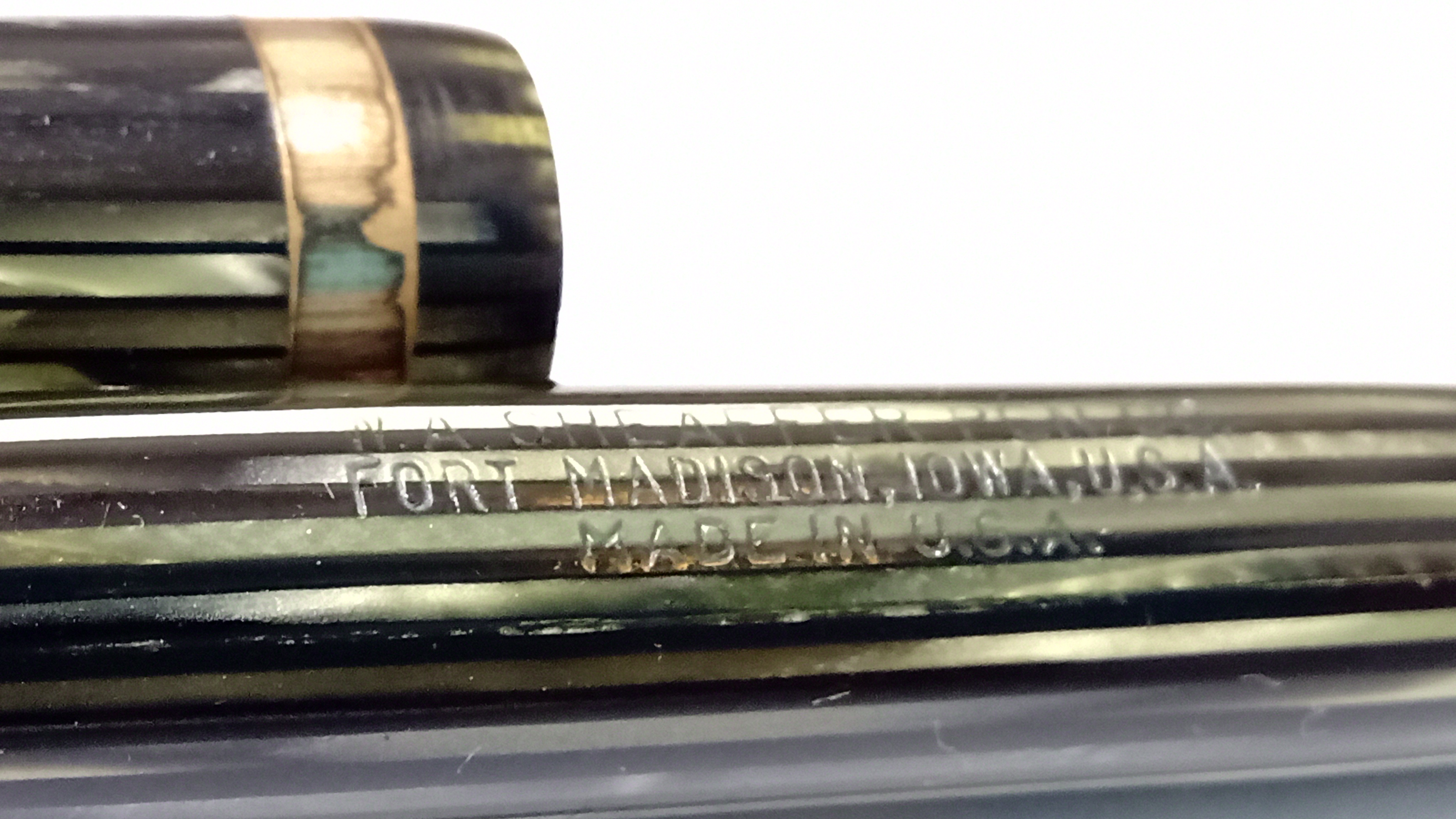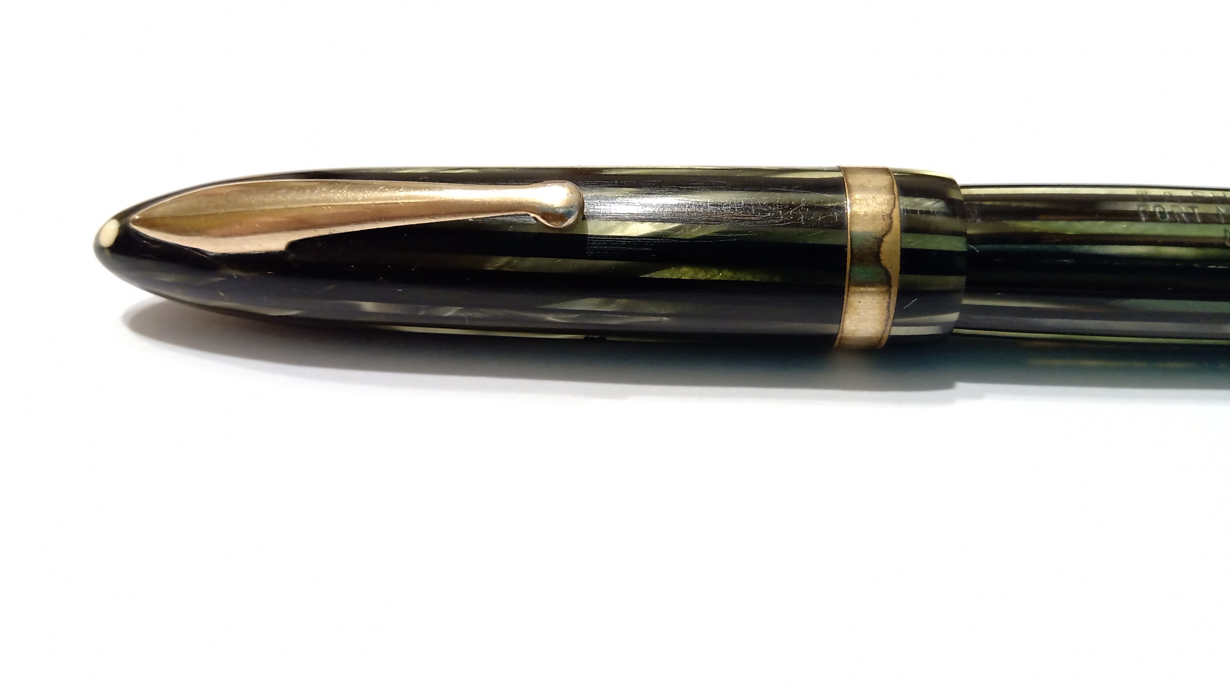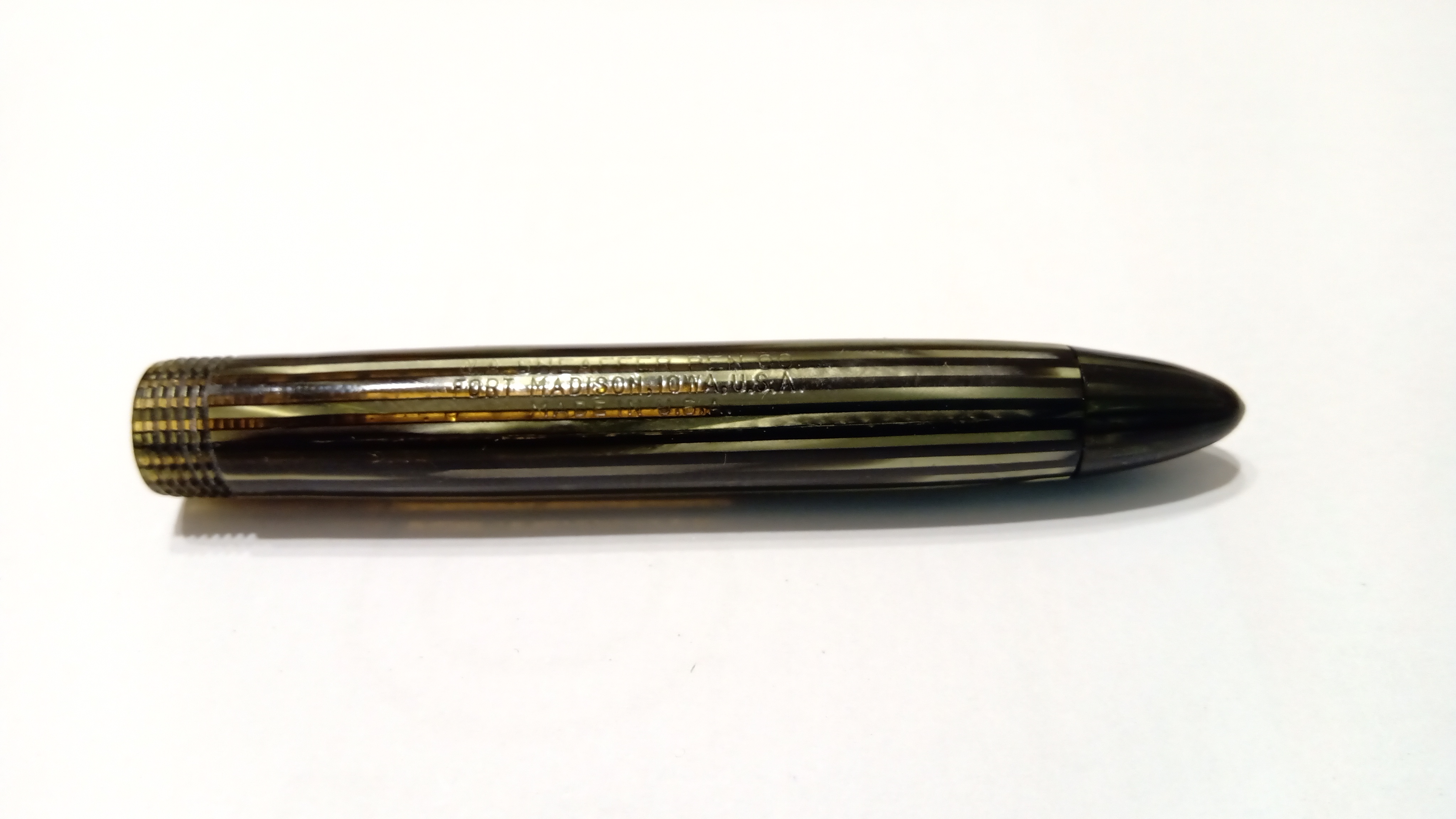 La pieza en cuestión es una maravillosa Lady Sheaffer Lifetime de 1938, fabricada en celuloide estriado perlado, con sistema de carga Vacuum Fill de primera generación, y cuya denominación es E73WS (E=Marine Green, 73=Lady, W=One-stroke, S = short), la cual adquirí por medio de eBay a un vendedor de Francia en bastantes buenas condiciones. El vástago de acero se encontraba sin corrosión alguna y el imprint perfecto...