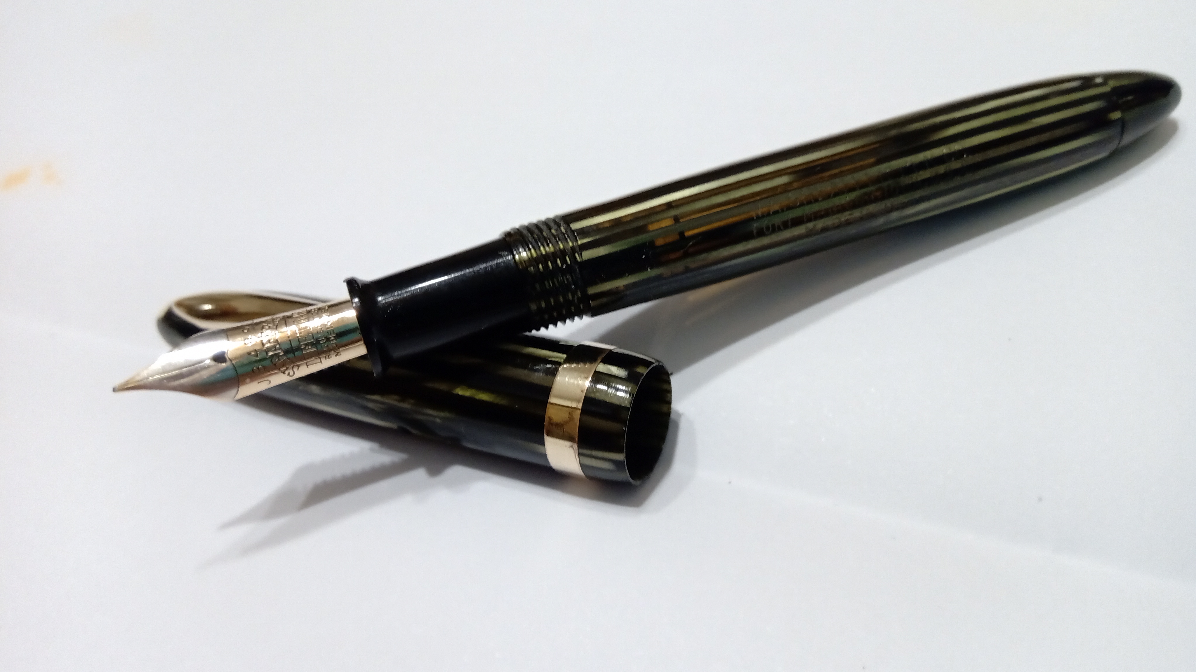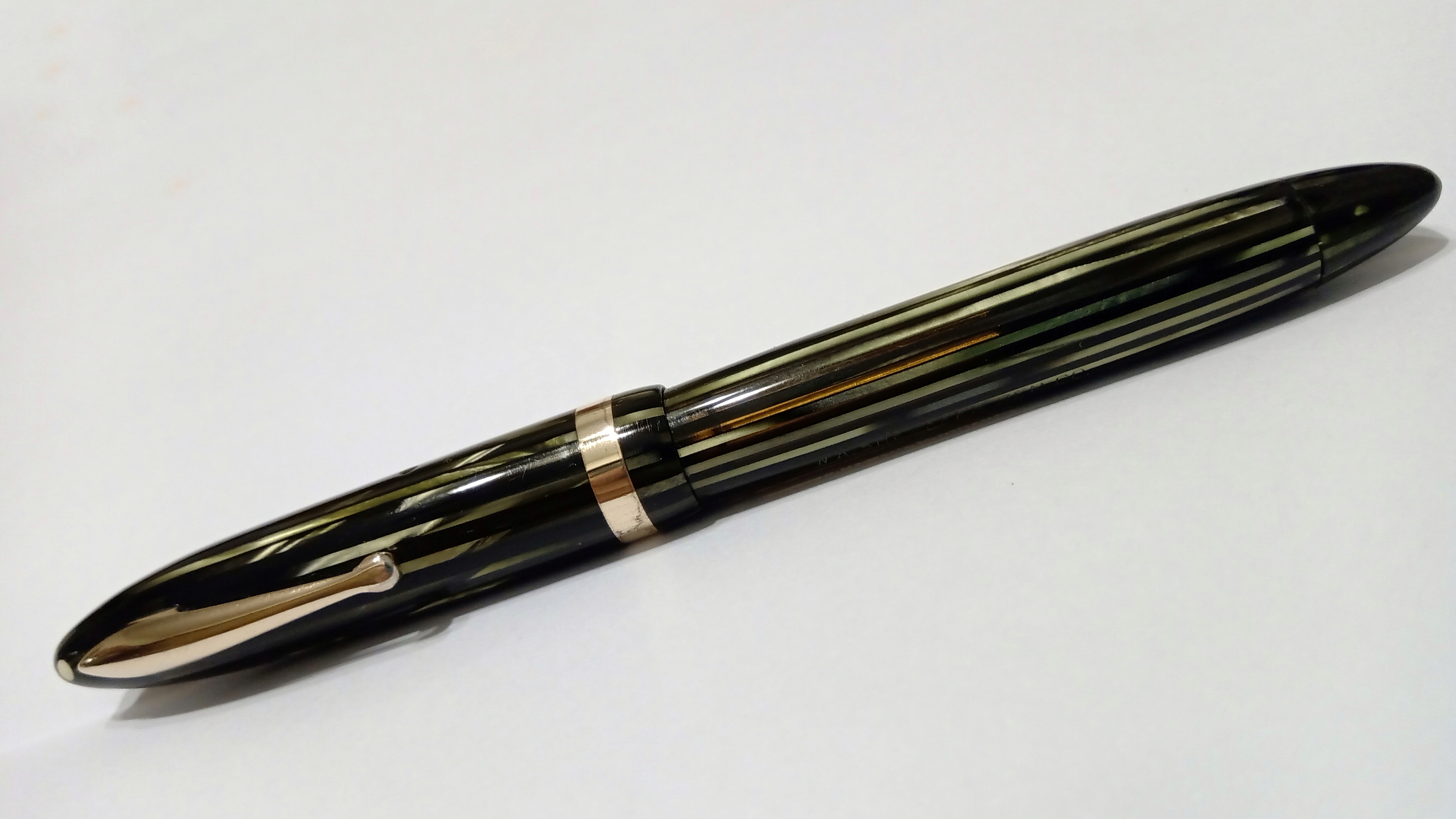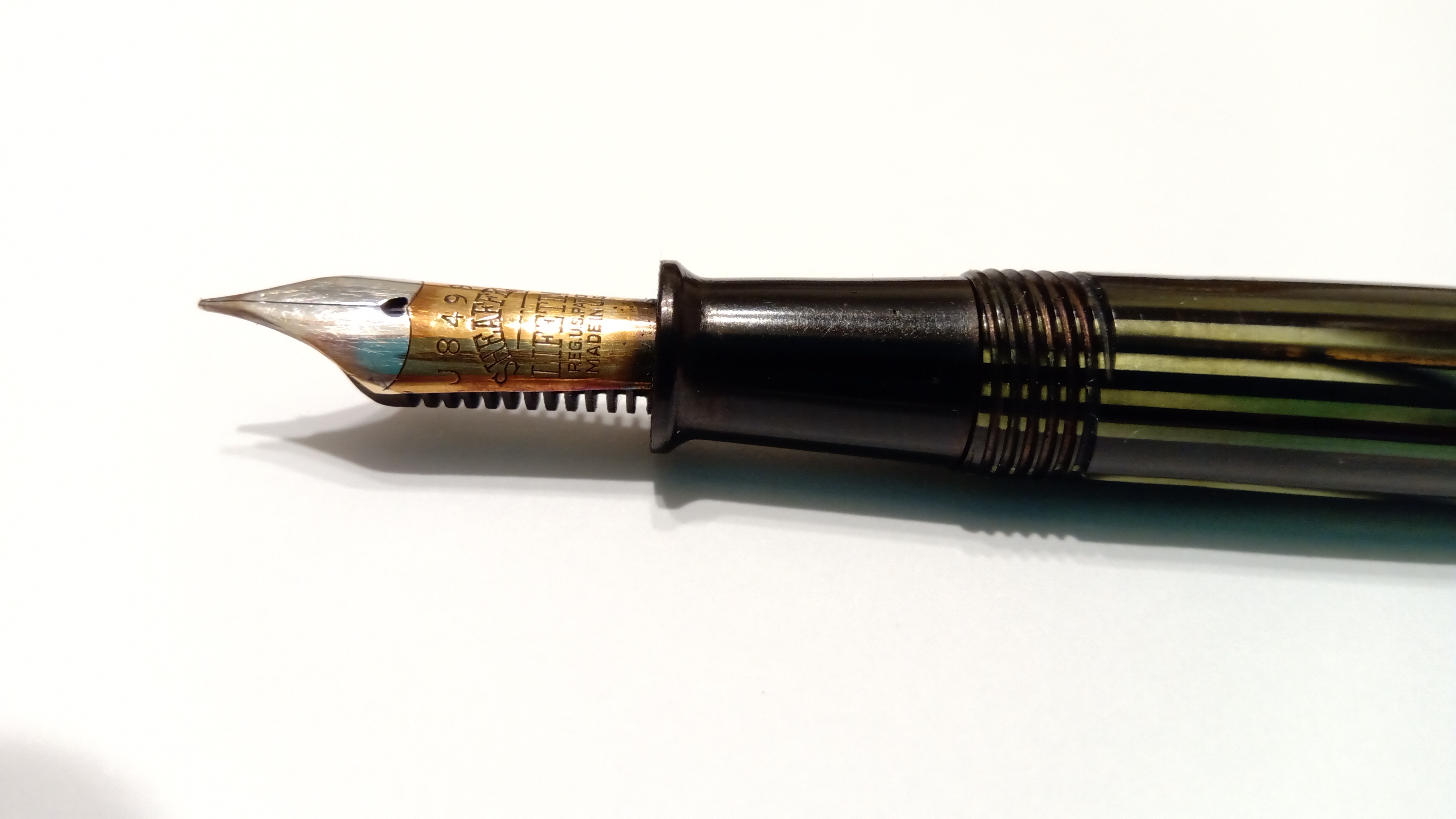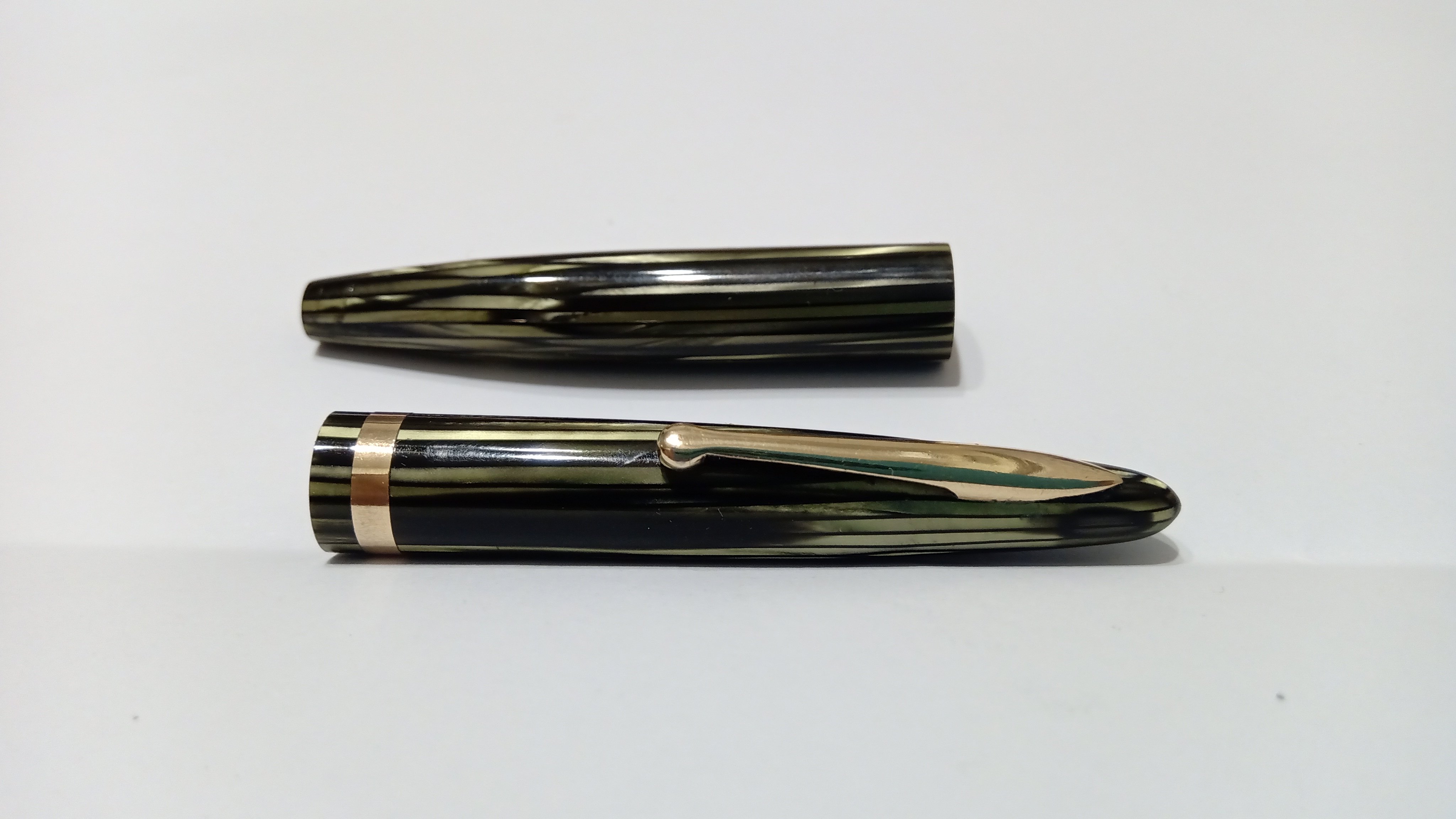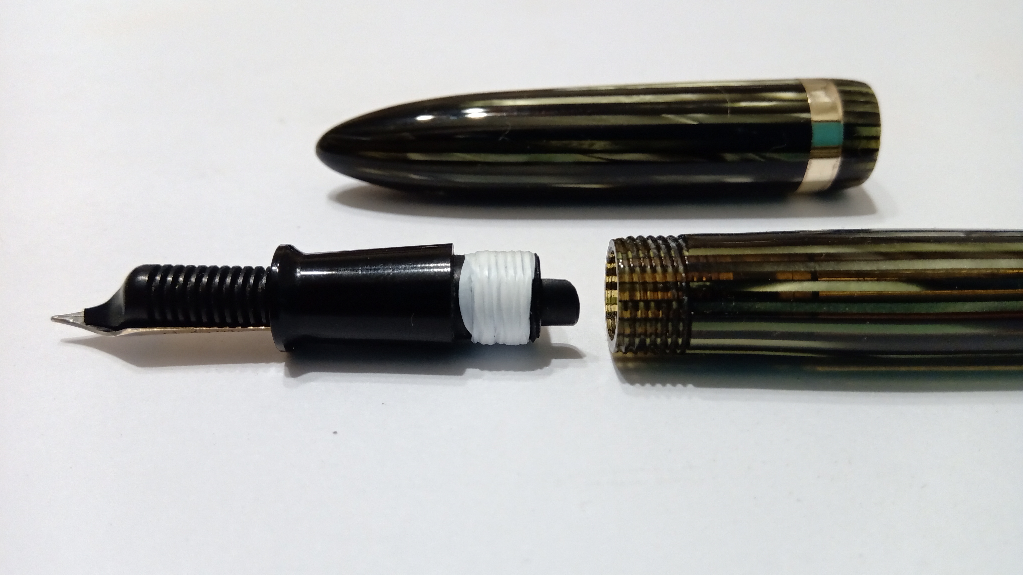 La pieza en cuestión es una maravillosa Lady Sheaffer Lifetime de 1938, fabricada en celuloide estriado perlado, con sistema de carga Vacuum Fill de primera generación, y cuya denominación es E73WS (E=Marine Green, 73=Lady, W=One-stroke, S = short), la cual adquirí por medio de eBay a un vendedor de Francia en bastantes buenas condiciones. El vástago de acero se encontraba sin corrosión alguna y el imprint perfecto...