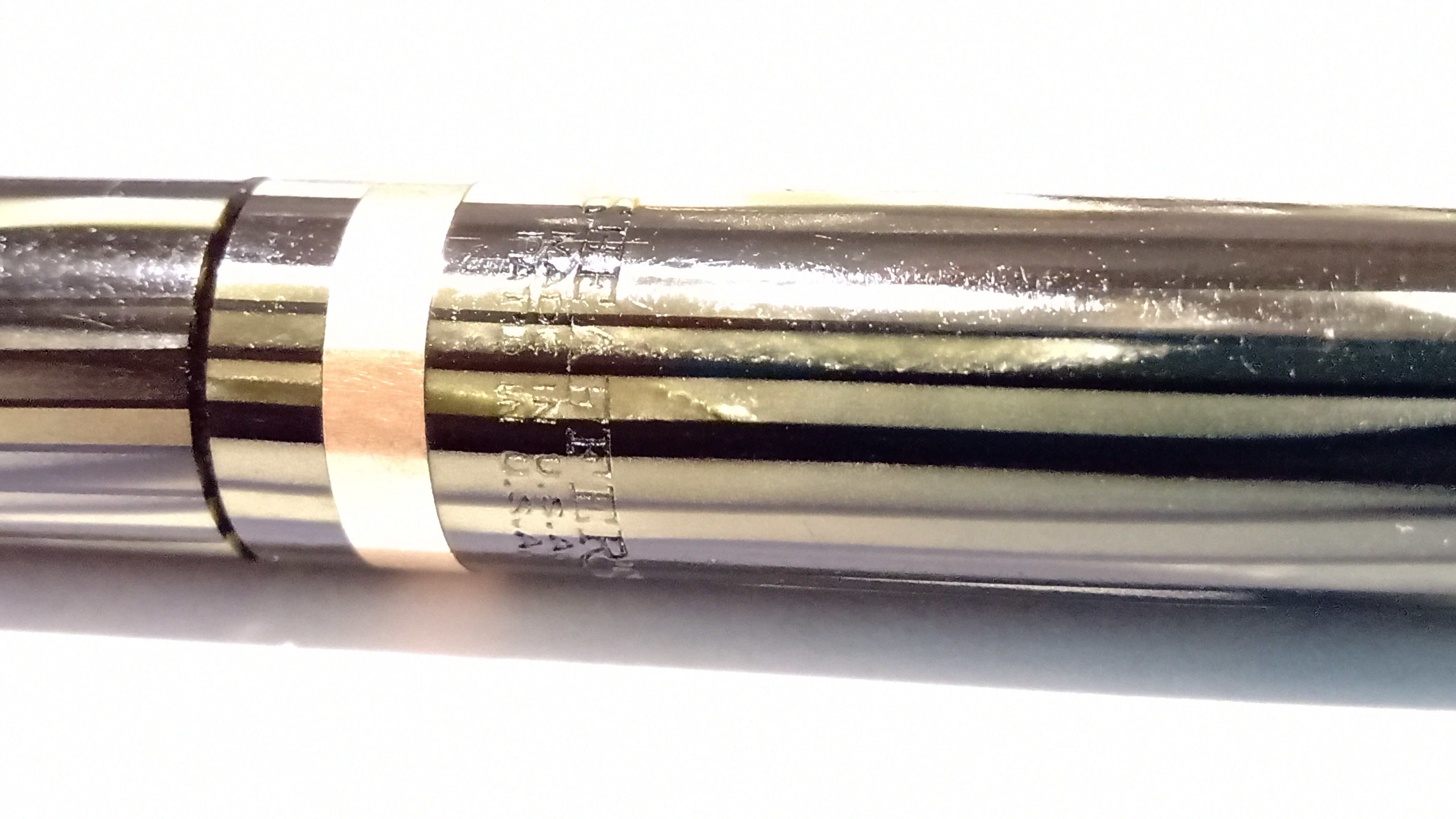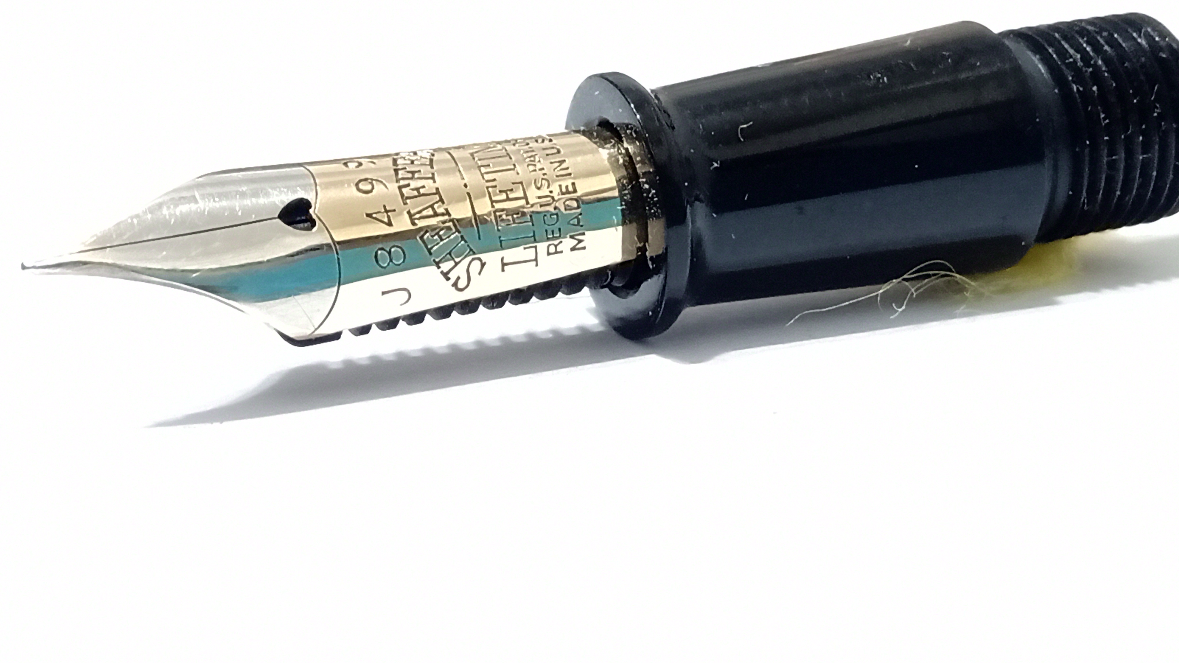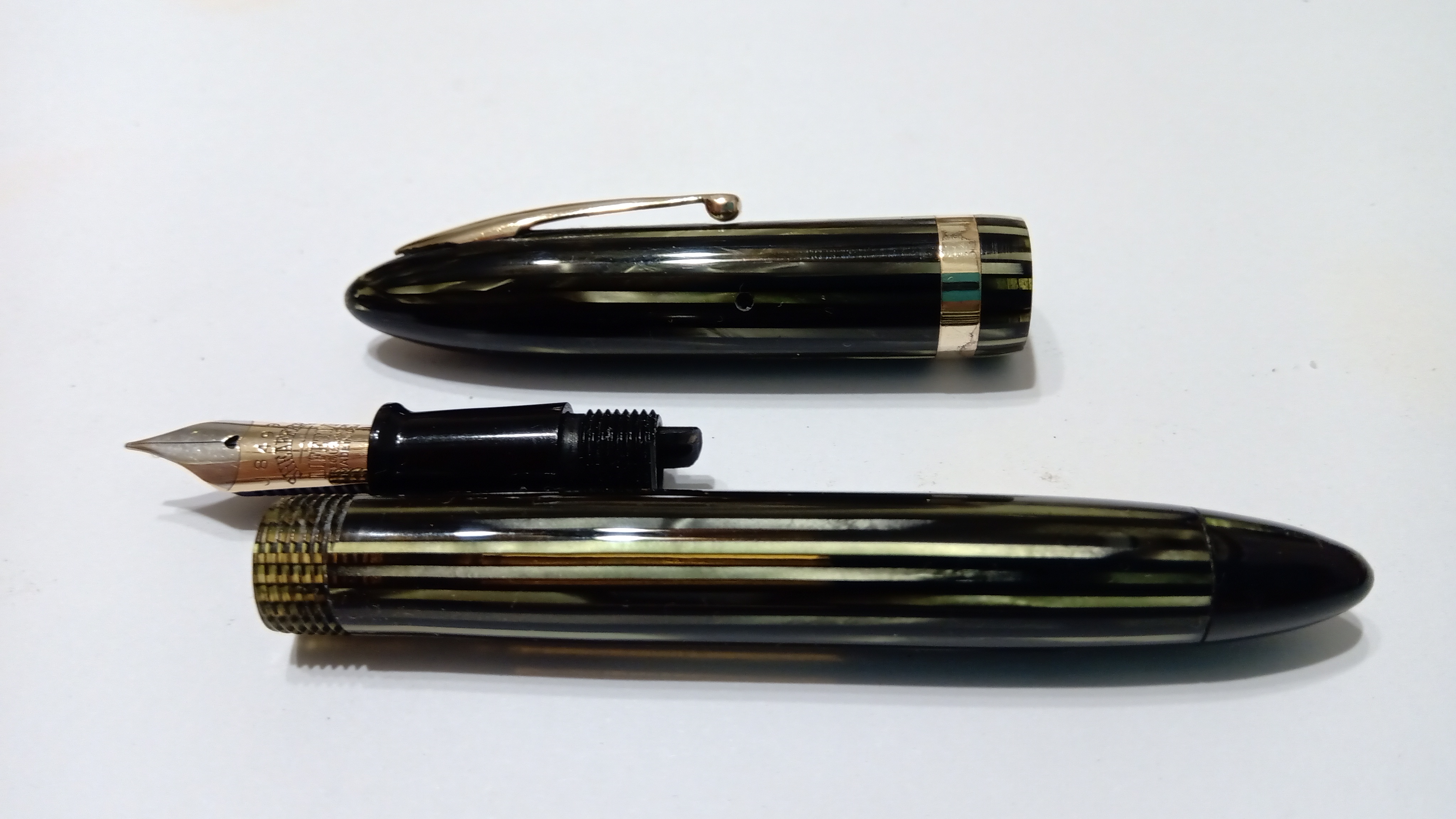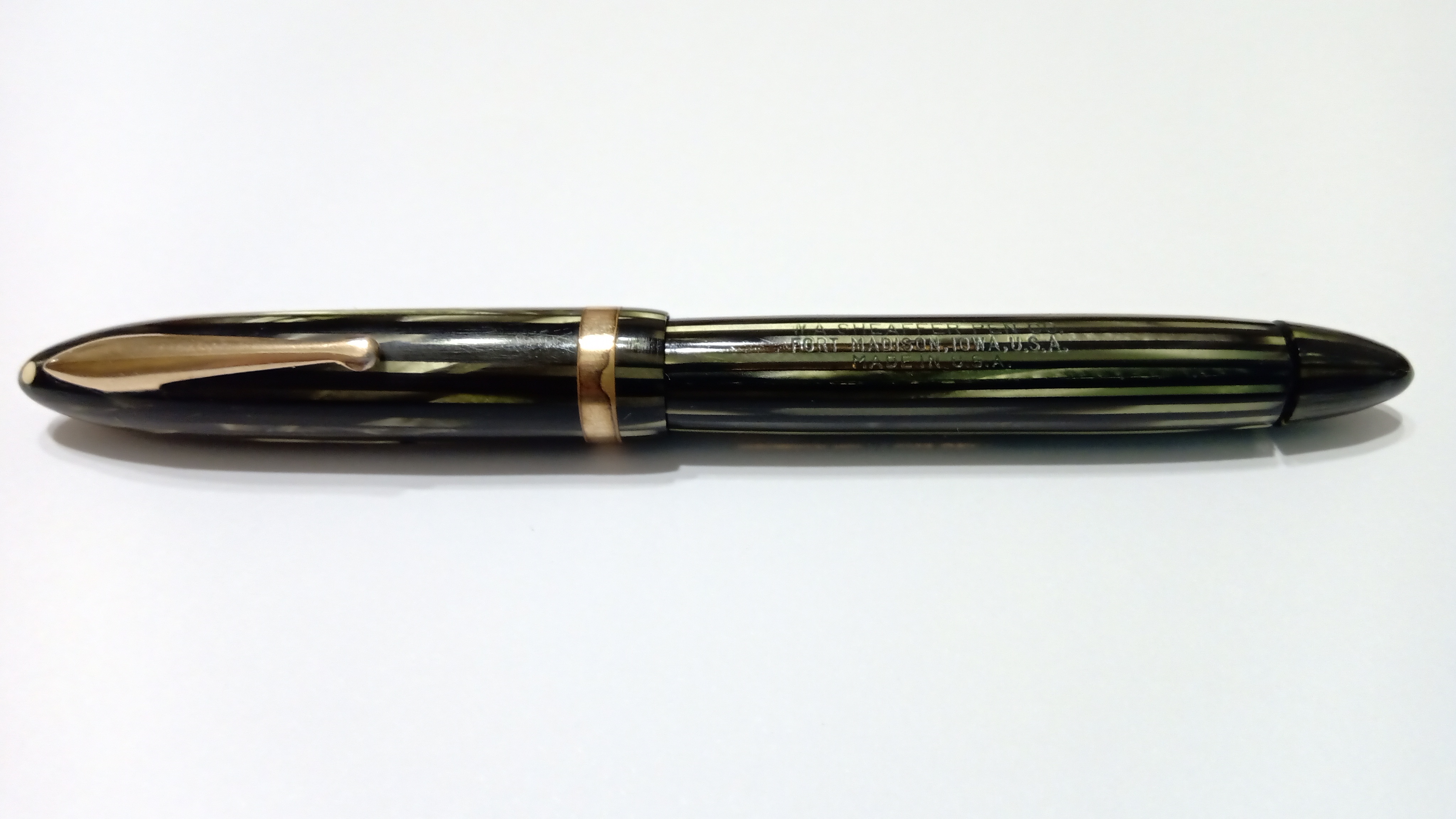 La pieza en cuestión es una maravillosa Lady Sheaffer Lifetime de 1938, fabricada en celuloide estriado perlado, con sistema de carga Vacuum Fill de primera generación, y cuya denominación es E73WS (E=Marine Green, 73=Lady, W=One-stroke, S = short), la cual adquirí por medio de eBay a un vendedor de Francia en bastantes buenas condiciones. El vástago de acero se encontraba sin corrosión alguna y el imprint perfecto...