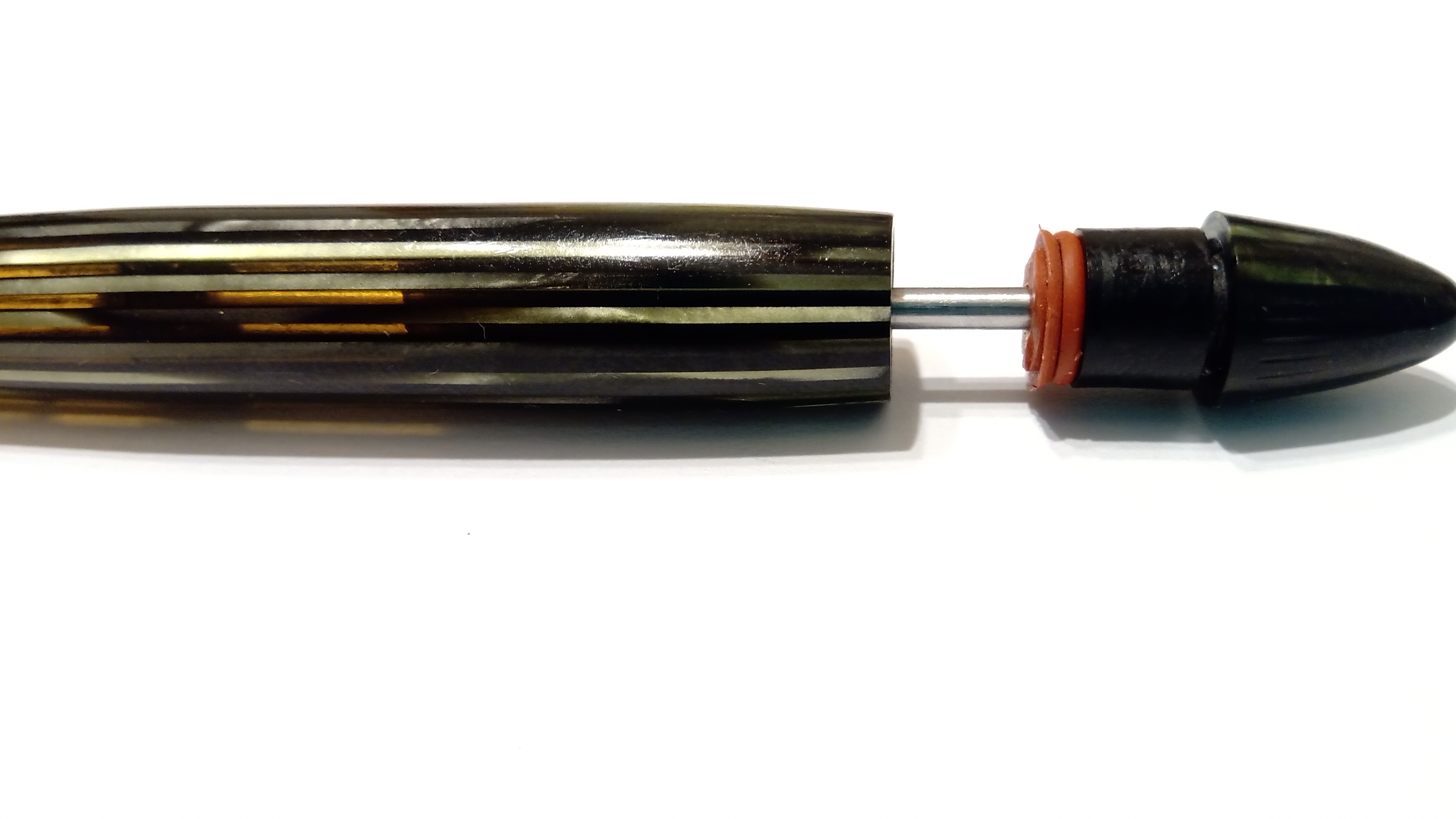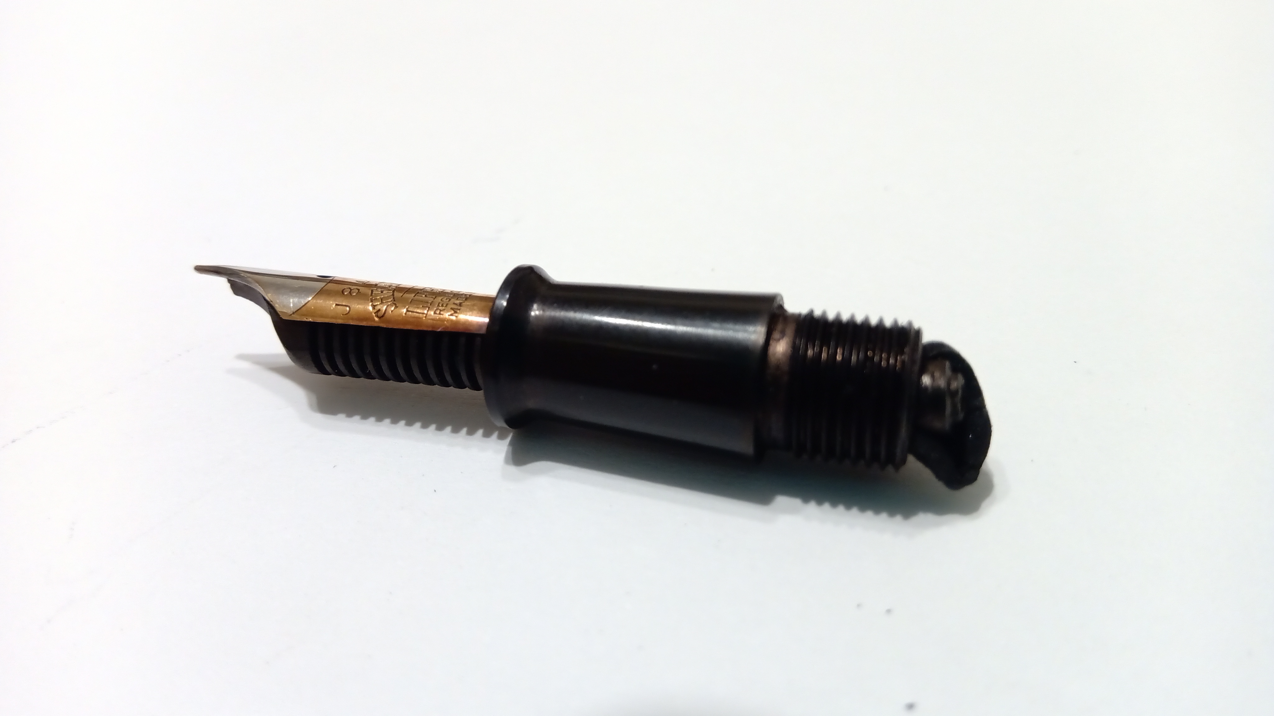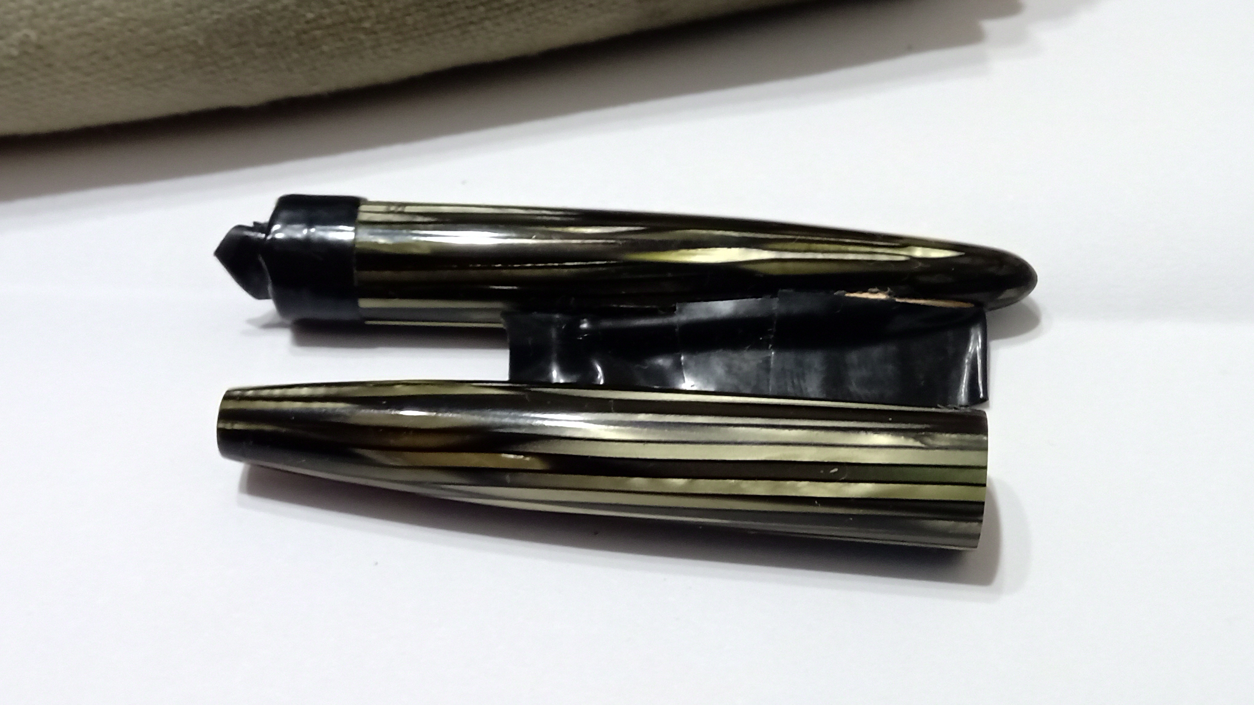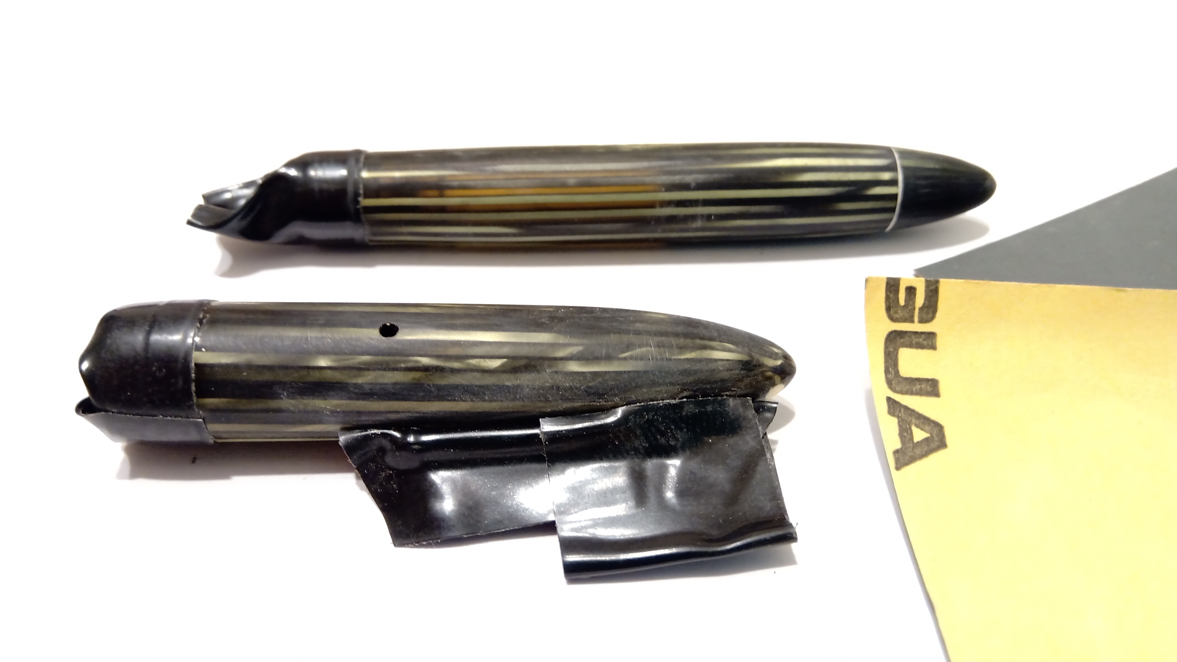 anche se, logicamente, dopo oltre 80 anni il sistema di caricamento era mal riparato e completamente inutilizzabile, alcune parti dorate erano deteriorate, il pennino, sebbene intatto, aveva i becchi completamente chiusi e le superfici avevano perso completamente la loro lucentezza originale...