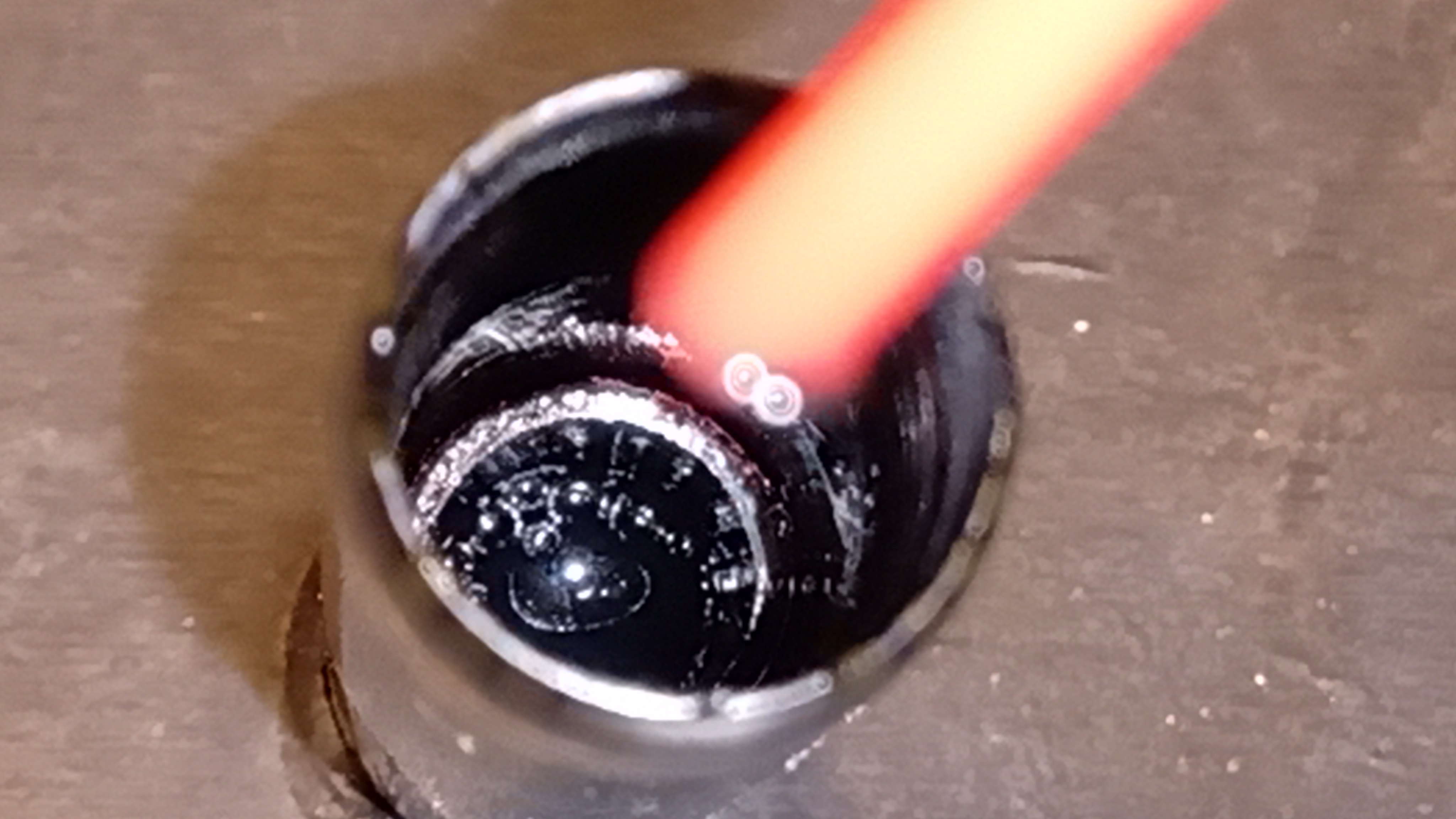 Cuando la última mano ha secado completamente, realizamos el flameado con llama azul de la superficie, produciéndose el cromado deseado.