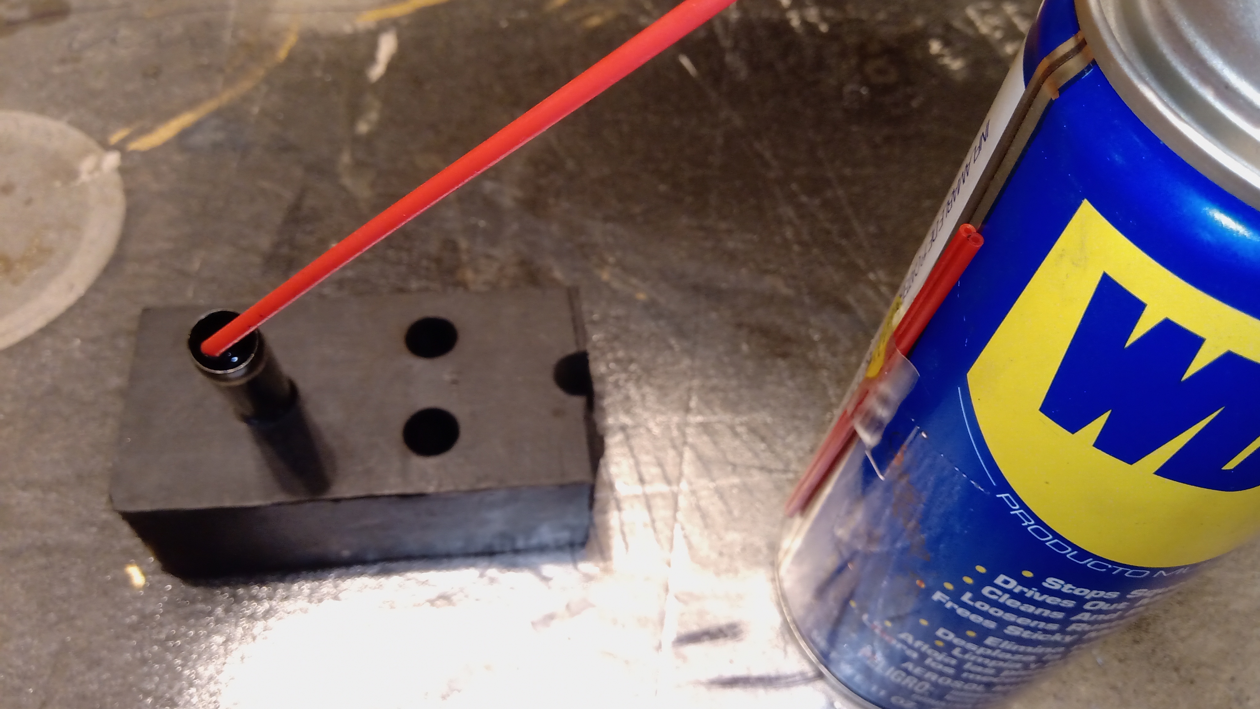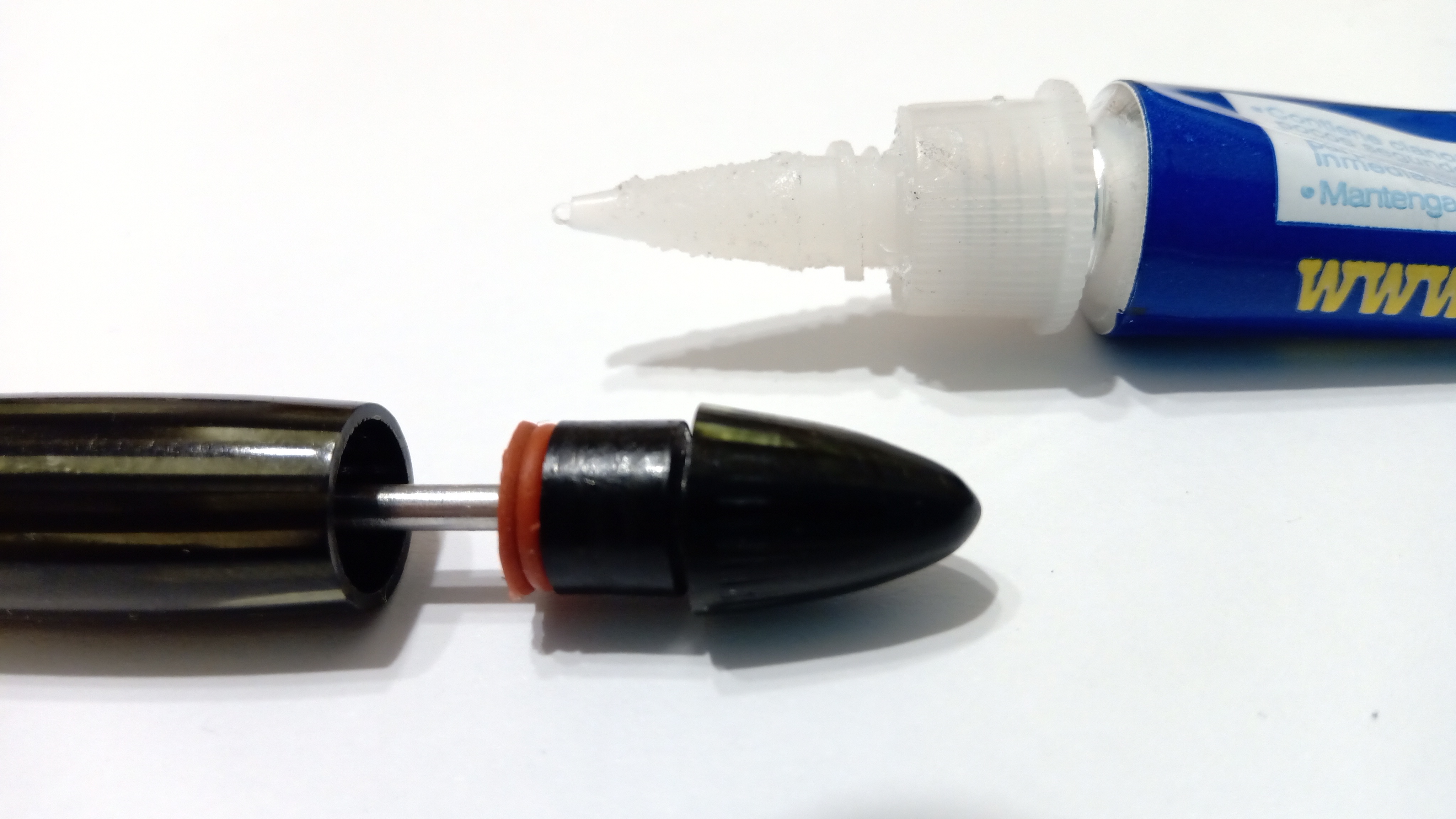 Quindi torniamo al gruppo grip-penna-alimentatore, spruzziamo nuovamente un po' di WD40 sulla parte interna dove si trova l'alimentatore e fissiamo saldamente il grip con un pezzo di gomma dura e il nostro piccolo morsetto a sedi cilindriche...