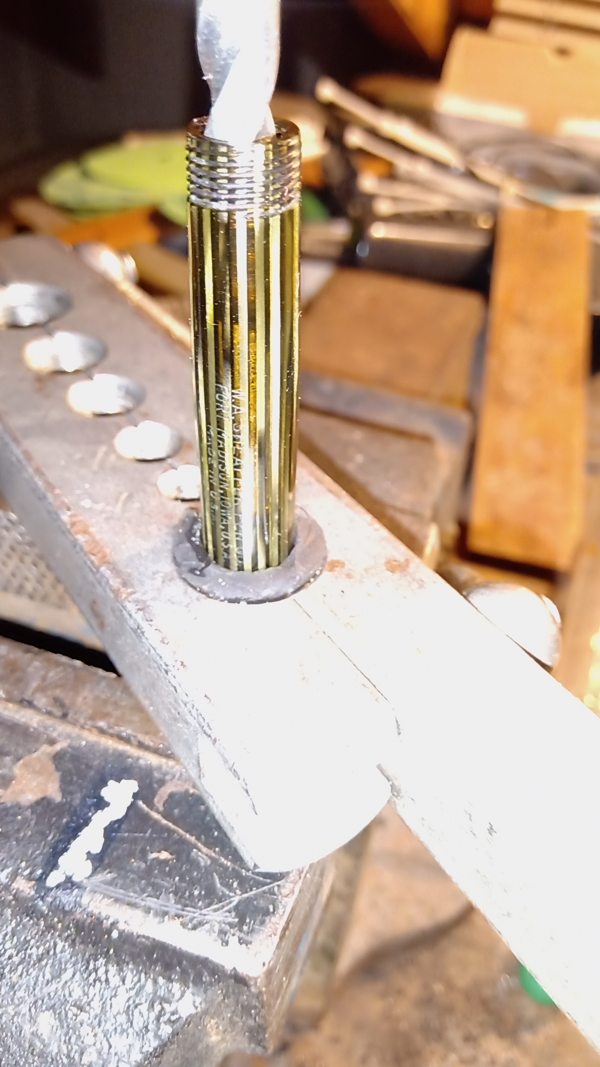 Para retirar este cartucho, rociamos con un poco de WD40 la parte interna donde asienta el cartucho, y aseguramos firmemente el extremo trasero del barril con una pieza de goma dura y una pequeña morsa de asientos cilíndricos...