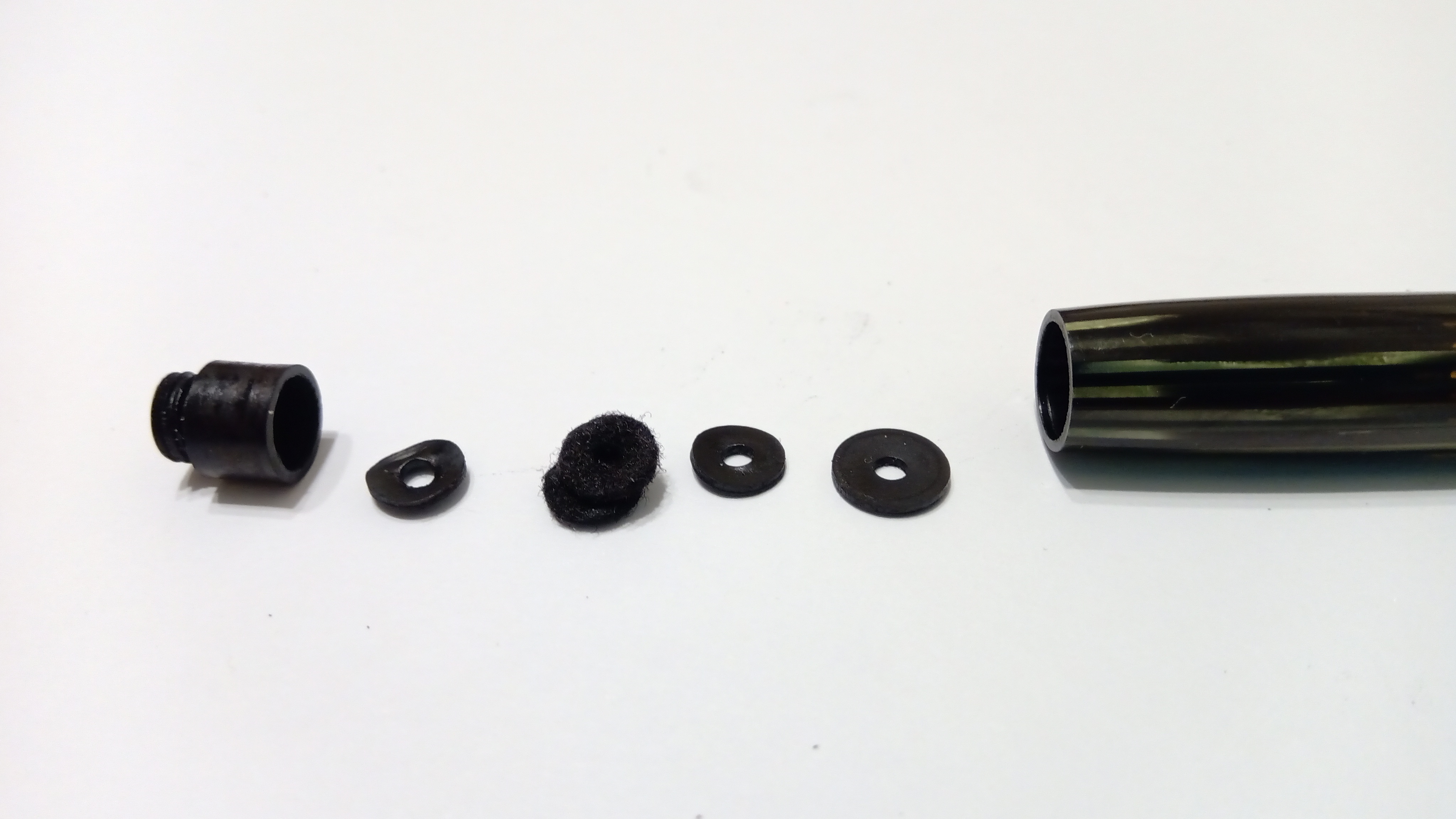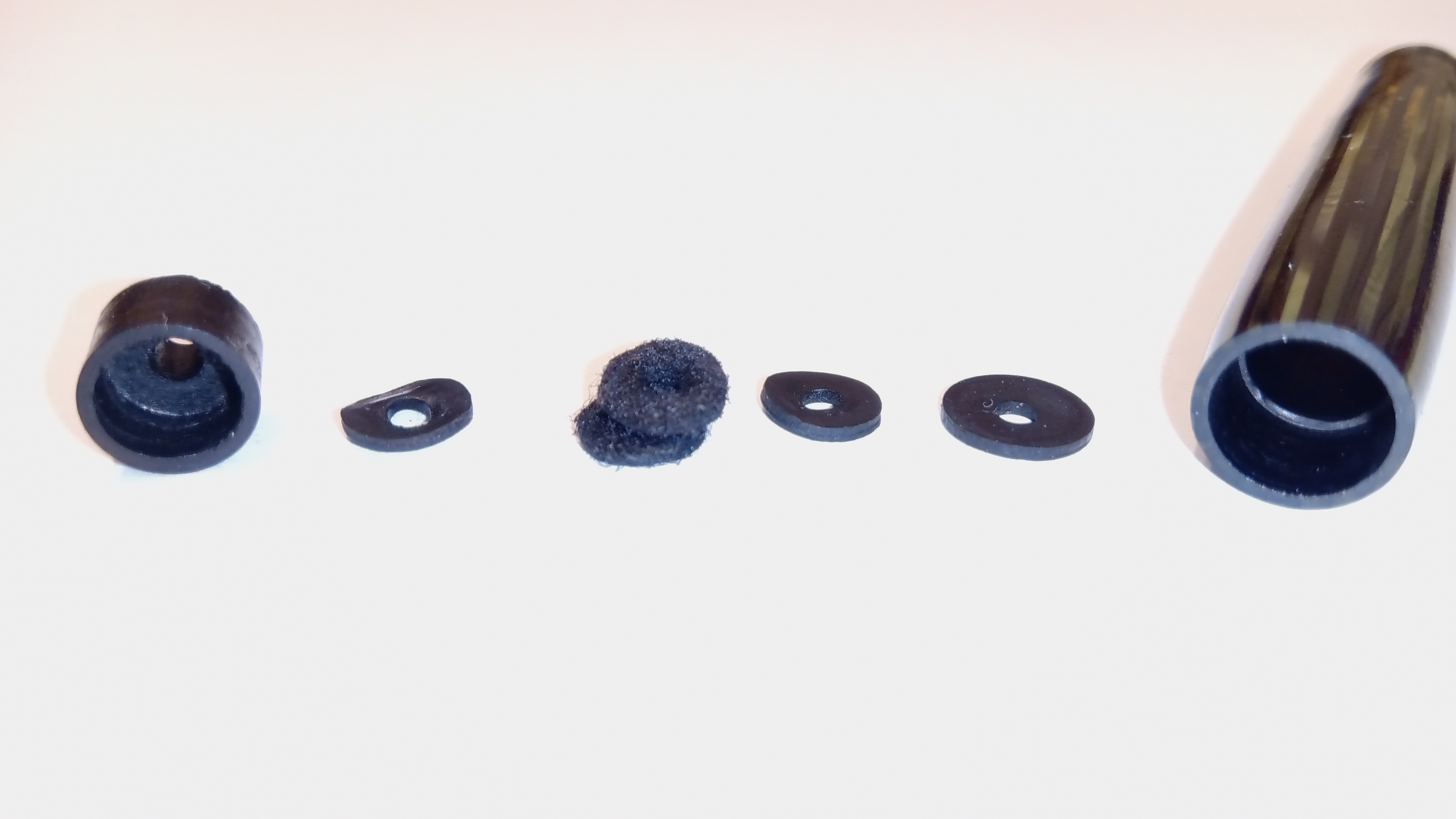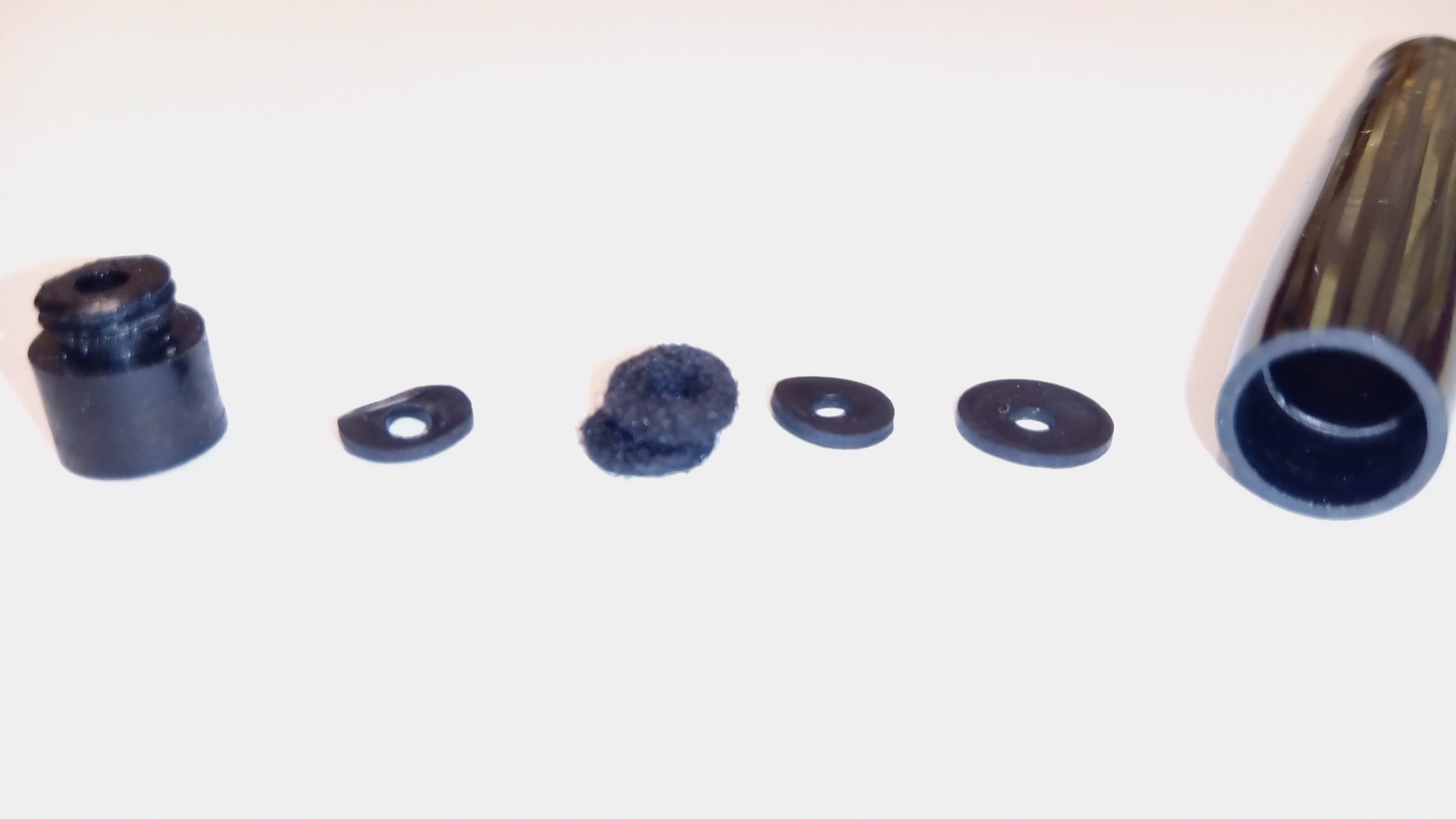 Una volta staccata la cartuccia dalla canna, osserveremo i seguenti pezzi: una rondella di ritenzione, due guarnizioni in gomma che garantiscono la tenuta, ma che sono invecchiate e dure, due rondelle in feltro per la lubrificazione dello stelo e infine la cartuccia stessa...