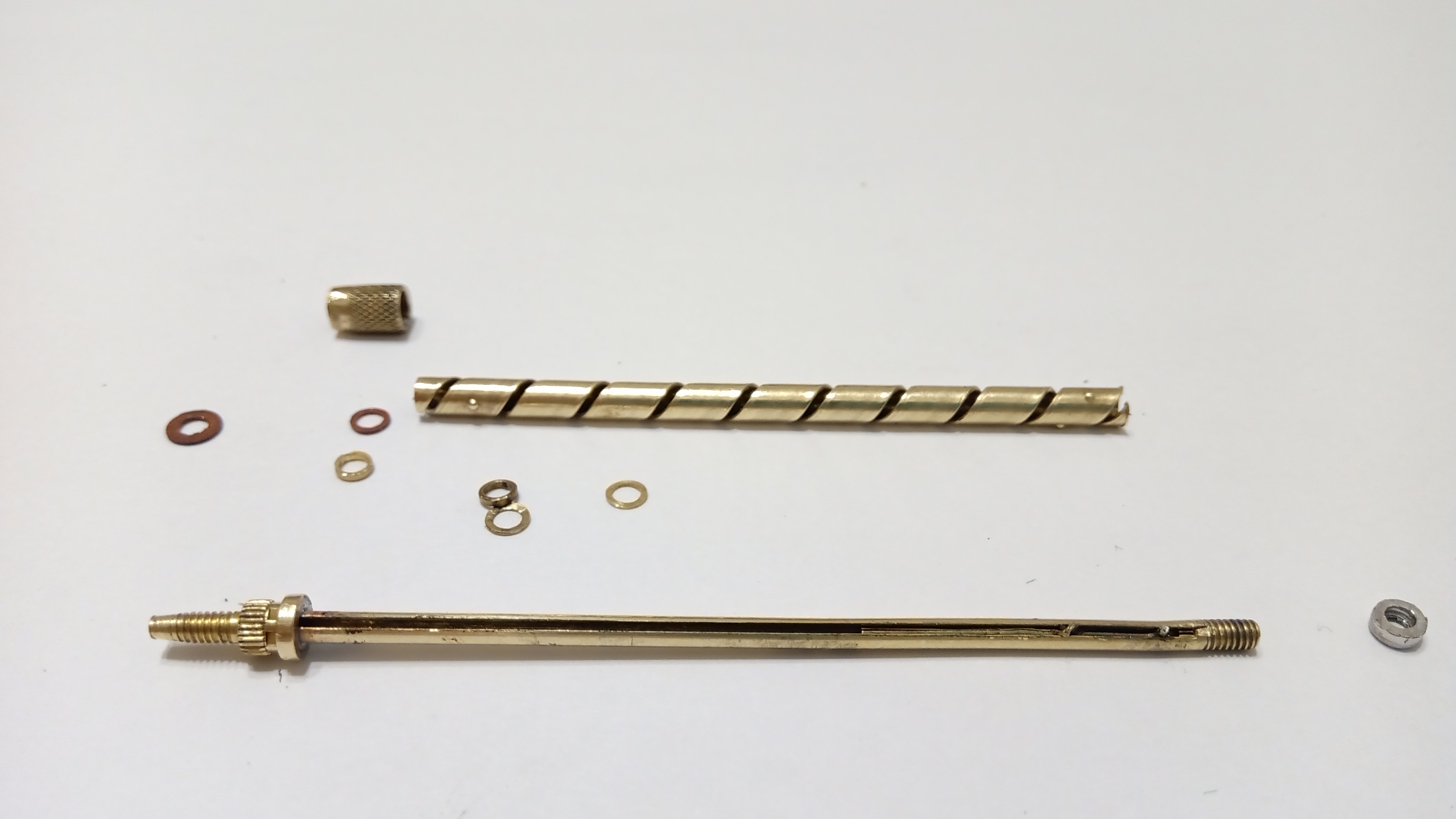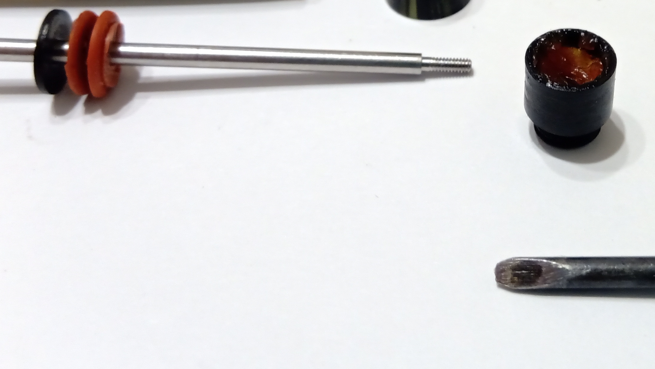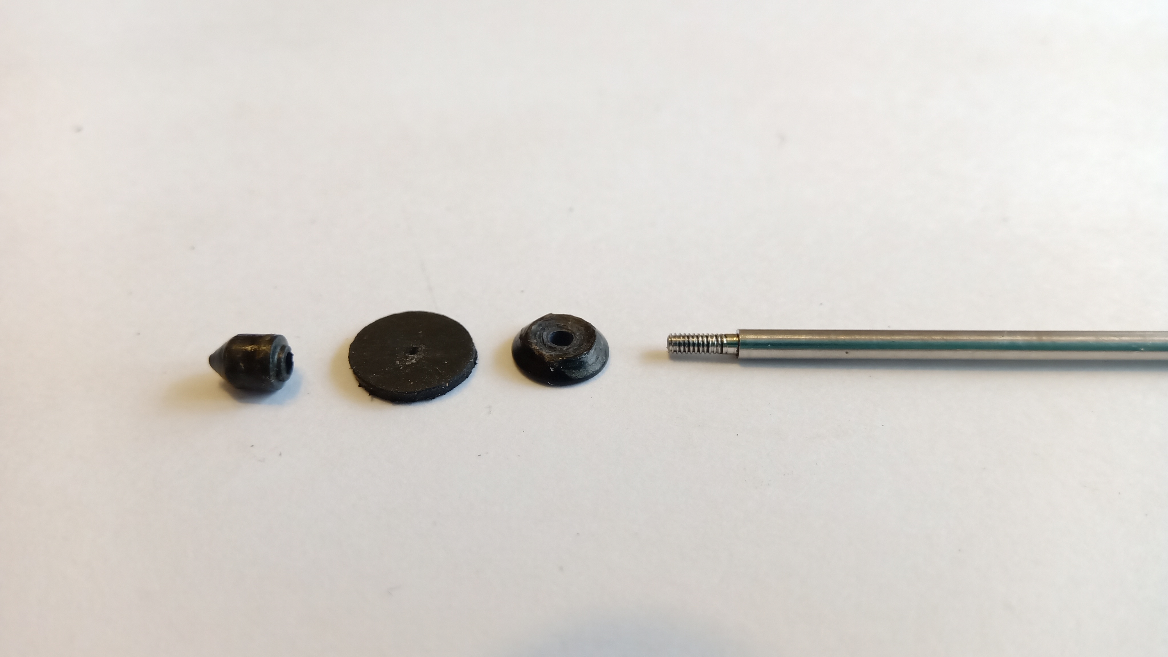 Una volta staccata la cartuccia dalla canna, osserveremo i seguenti pezzi: una rondella di ritenzione, due guarnizioni in gomma che garantiscono la tenuta, ma che sono invecchiate e dure, due rondelle in feltro per la lubrificazione dello stelo e infine la cartuccia stessa...