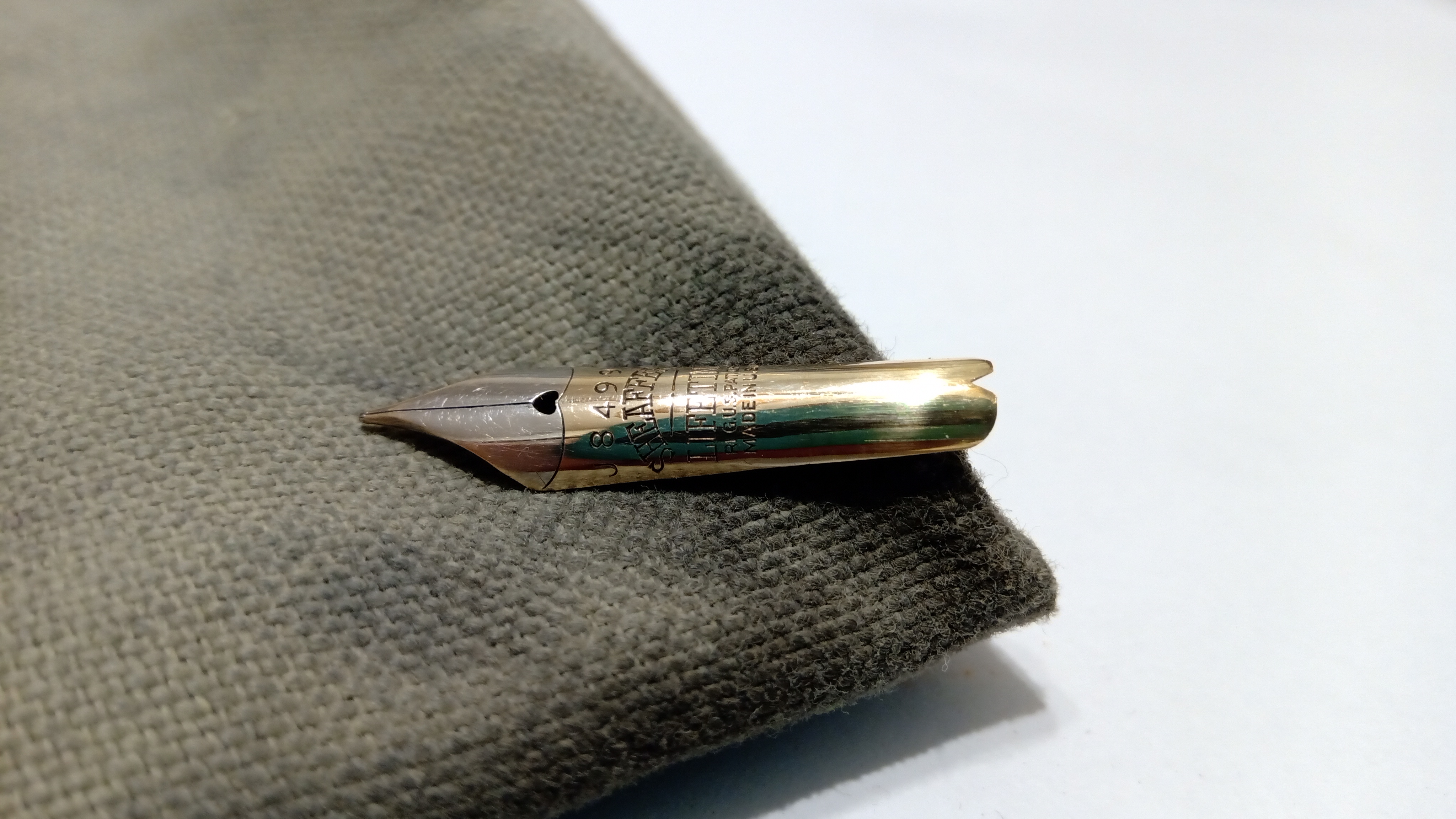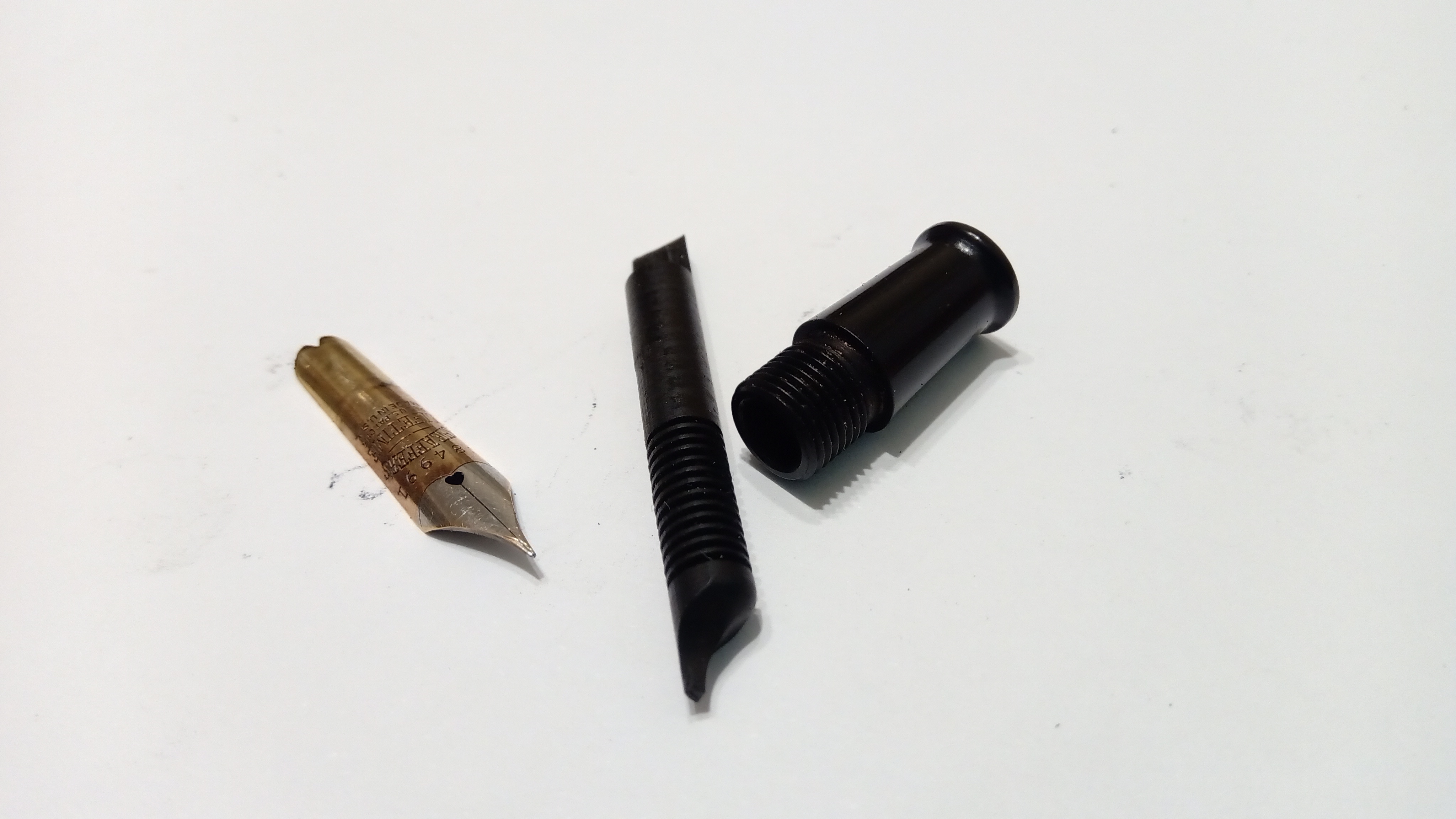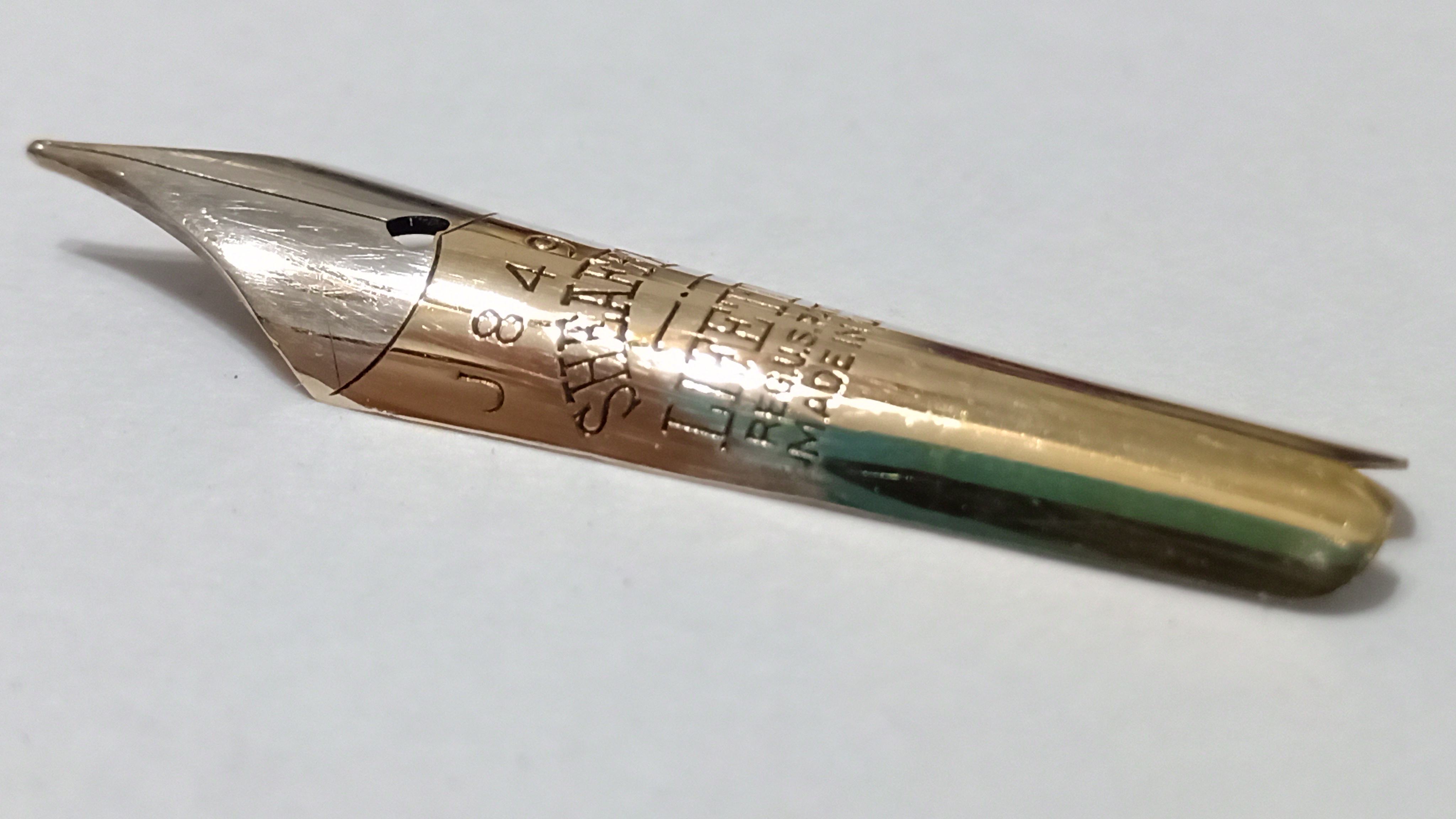 aunque lógicamente después de más de 80 años el sistema de carga estaba mal reparado y totalmente inutilizado, algunos dorados deteriorados, el plumín aunque intacto tenía completamente cerrados sus gavilanes y las superficies totalmente carentes de su brillo original...