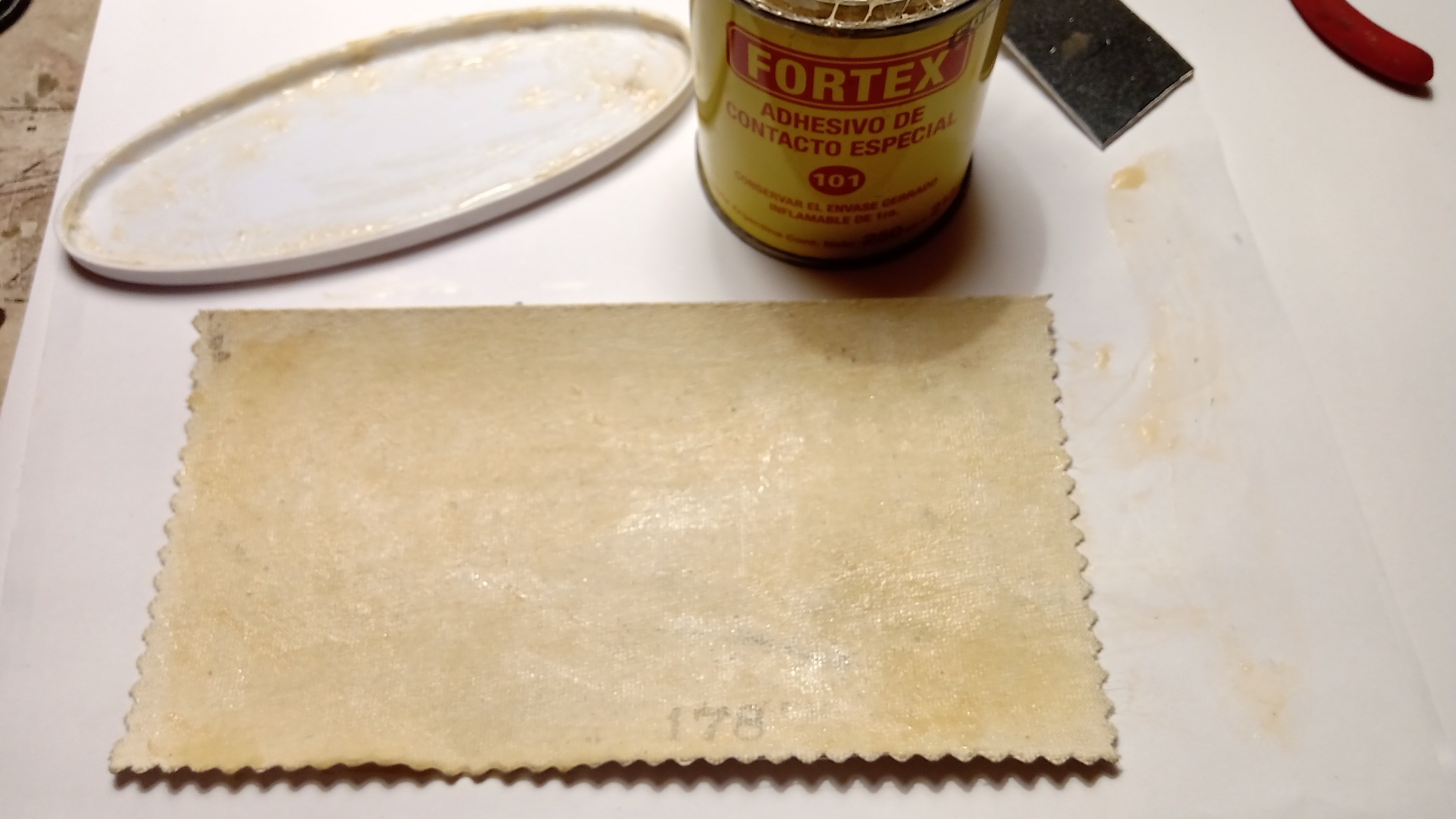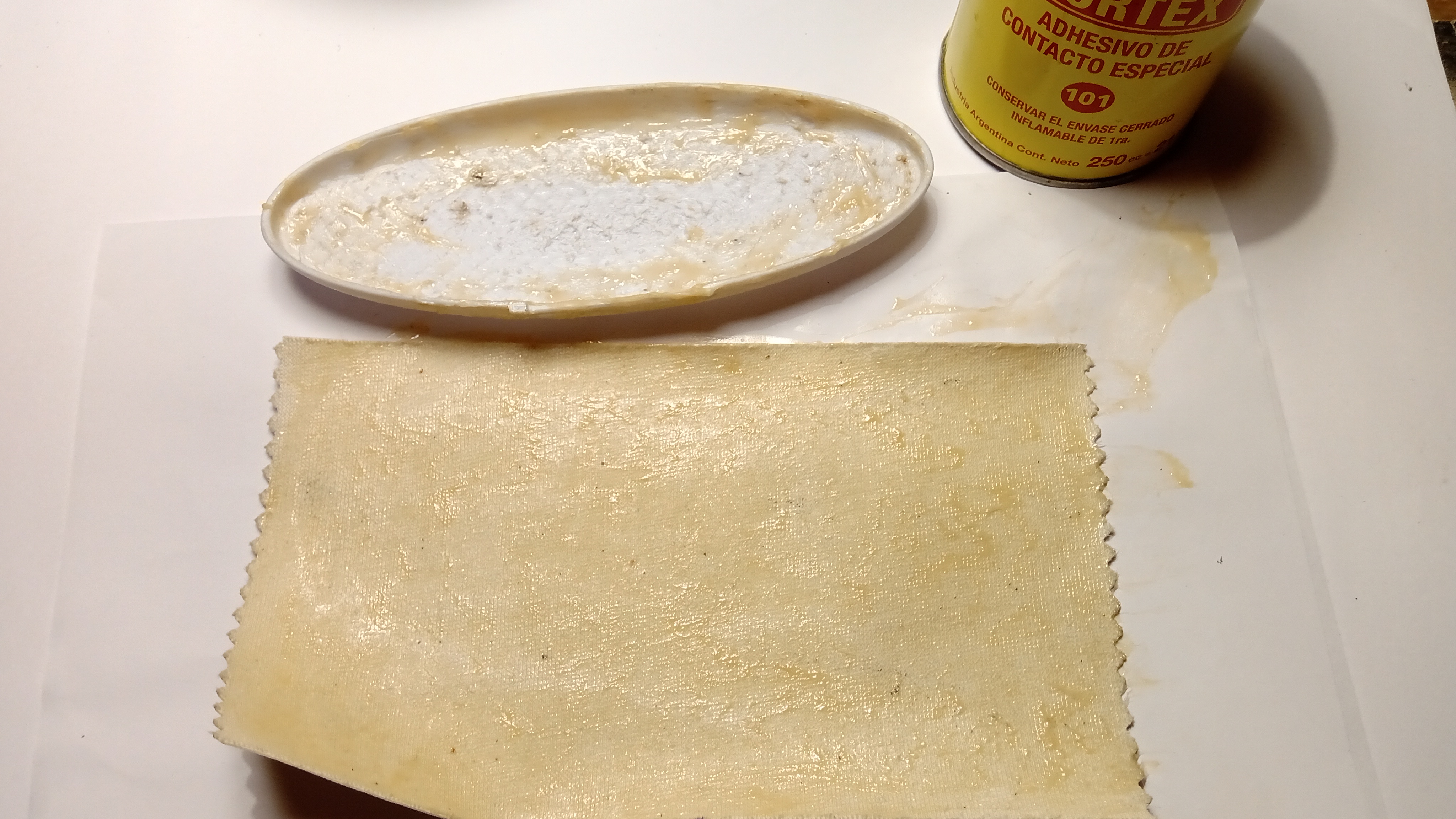 Como de costumbre, encolamos bien con cemento de contacto base tolueno, tanto el anverso de la cuerina como los bordes internos de la base...
