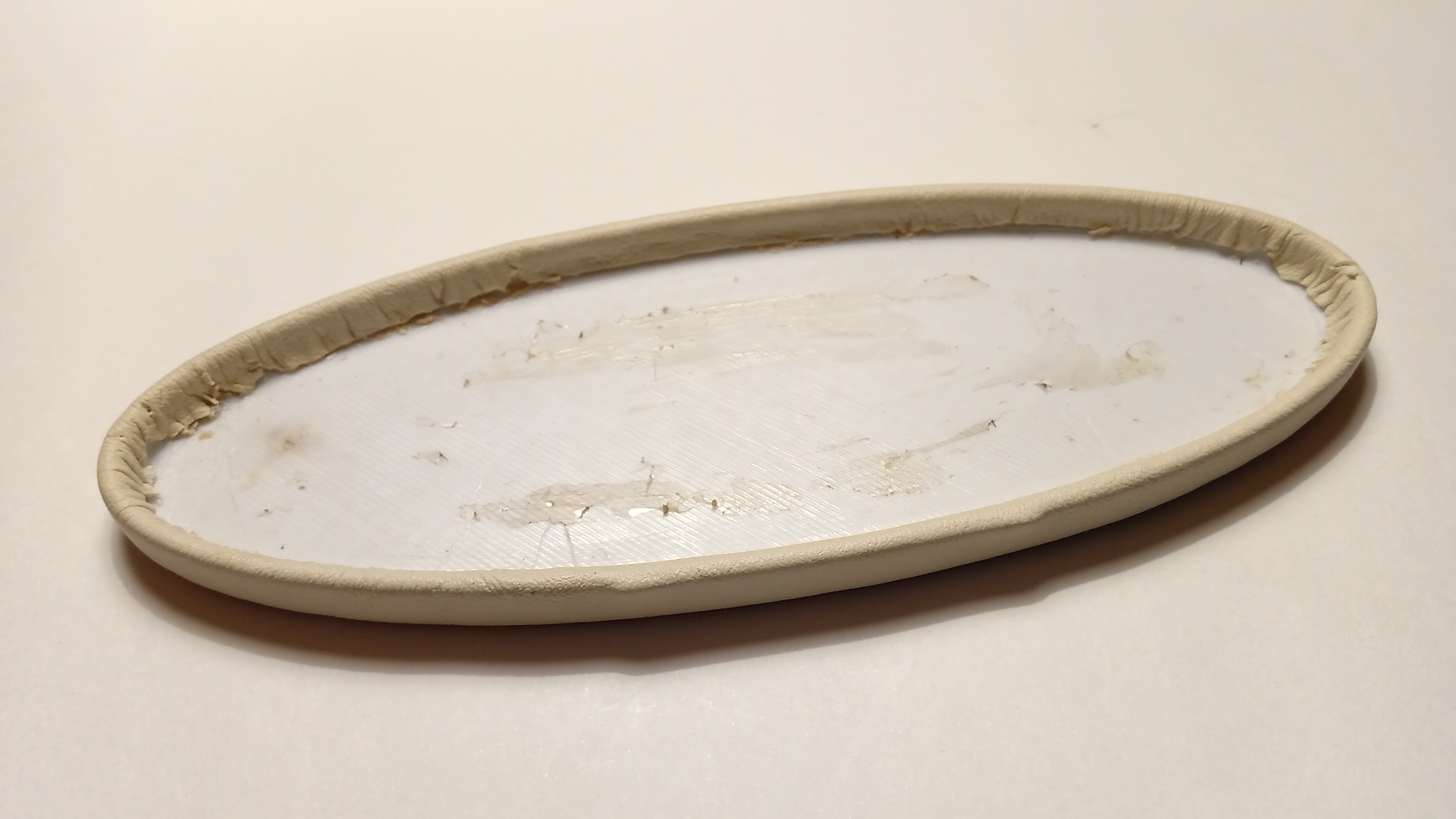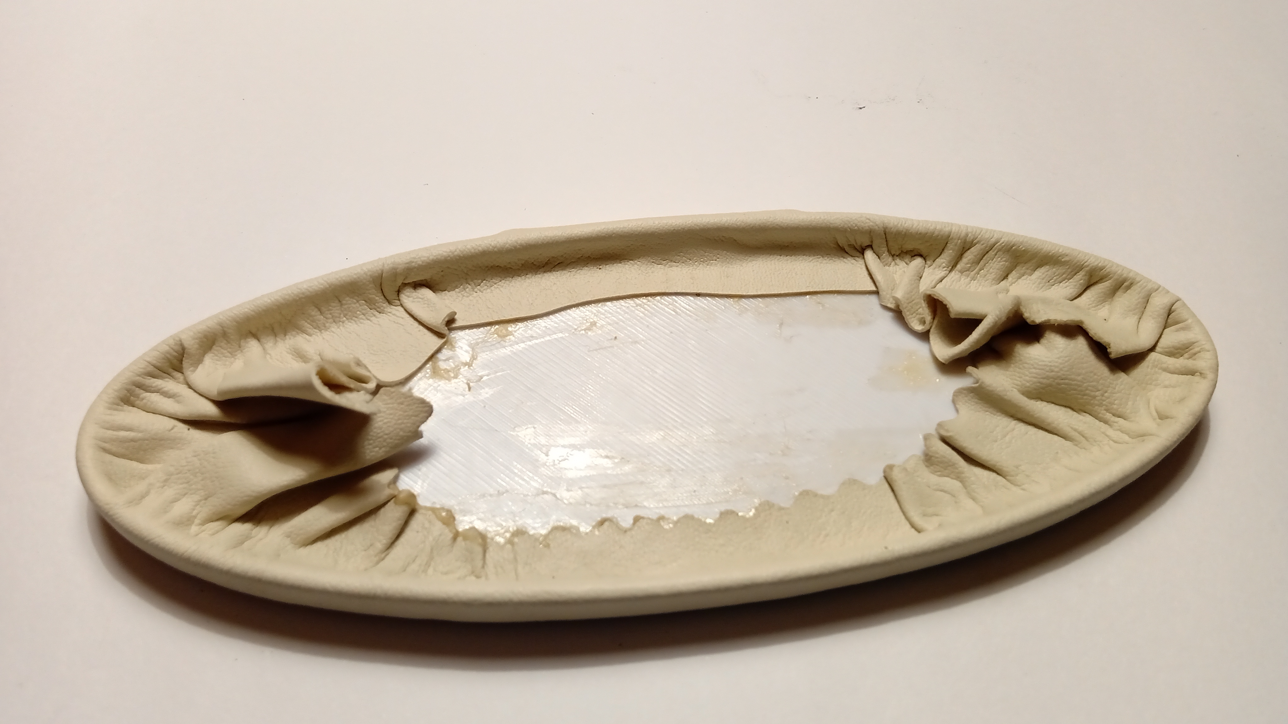 come di consueto, incolliamo bene con cemento a base di toluene sia il lato anteriore della pelle sintetica che i bordi interni della base...