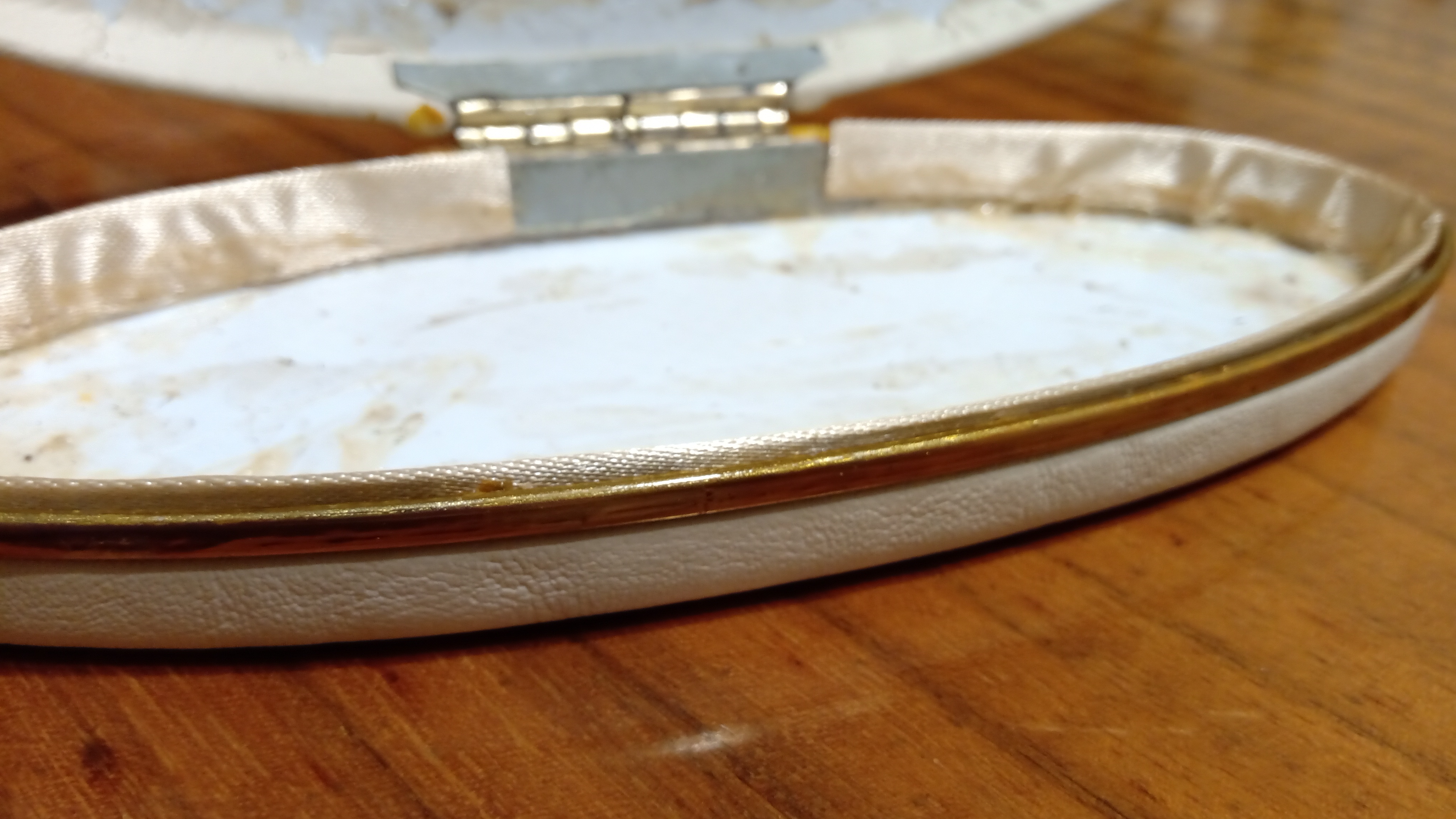 La parte interna della cerniera sarà ricoperta da una striscia piegata dello stesso tessuto di raso dorato, tenendo conto di lasciare lo spazio necessario per l'apertura e la chiusura del coperchio...