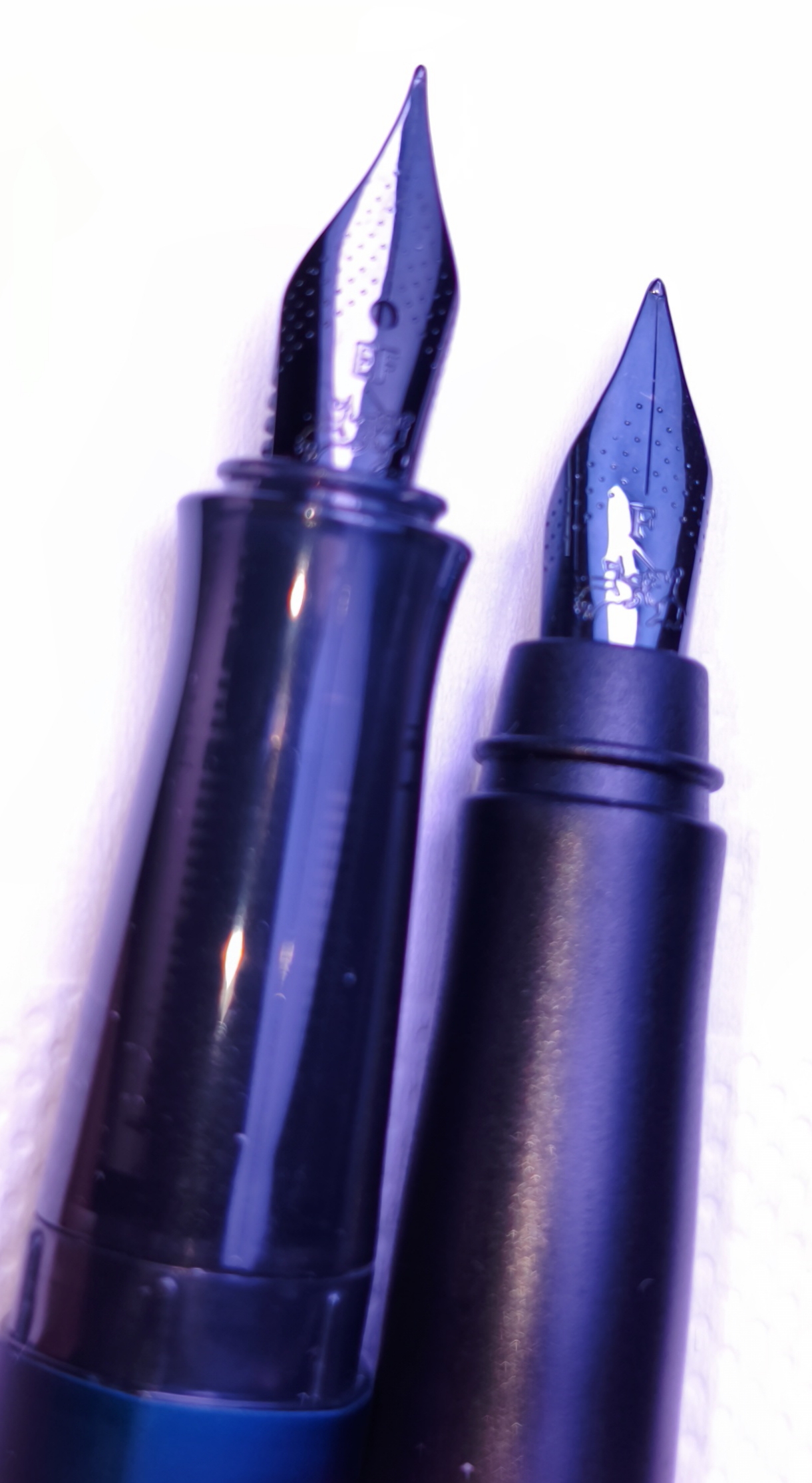 Uno è utilizzato sulle penne scolastiche (e non ha il collare, è solo il pennino inserito nel grip), l'altro è il classico gruppo scrittura con il feed e pennino messi nel collare svitabile. Il pennino è compatibile con entrambi i modelli, in teoria dovrebbe esserci solo maggiore qualità e cura in quello con il foro, visto che è usato nella loro linea di penne non scolastiche