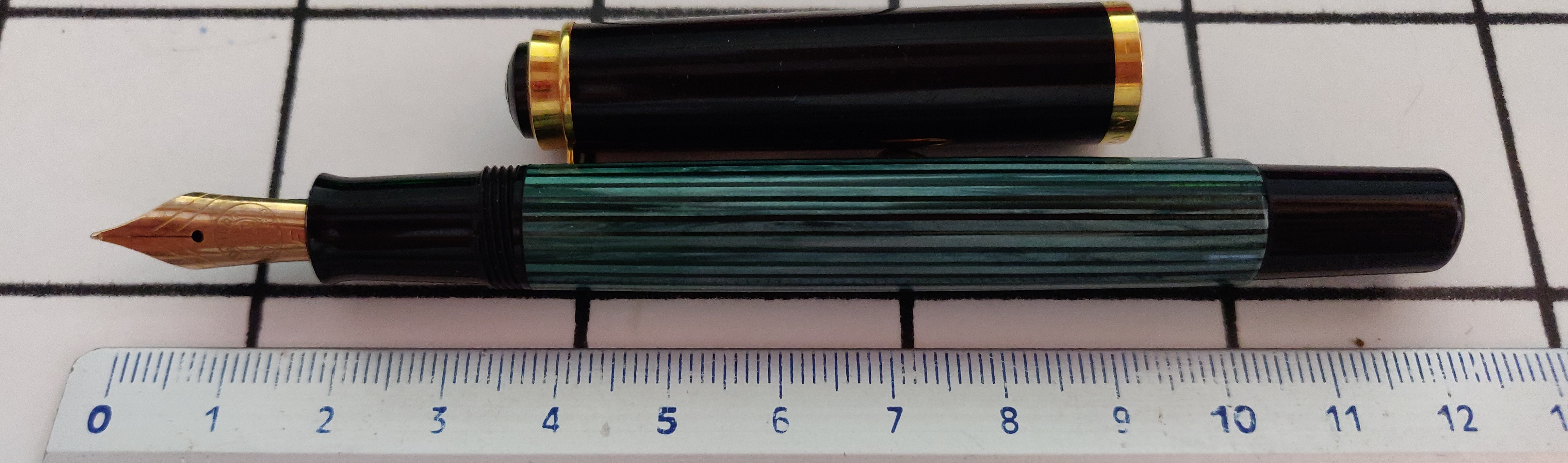 Vorrei chiedervi cortesemente aiuto per chiarirmi se effettivamente questo modello è quello, che mi è stato indicato. Il dubbio mi nasce anche per via della foto presente nella wiki di una Pelikan 400, che effettivamente gli assomiglia molto nelle forme e nella lunghezza della penna, pari a 12,6 cm: https://www.fountainpen.it/Pelikan_400 Tuttavia non ho trovato una pagina nella wiki dedicata alla produzione più recente (M400) con relative informazioni tecniche e fotografiche. Il pennino non sembra comunque essere quello di una 400, ma di un modello più recente. Insomma, ho più dubbi, che certezze!