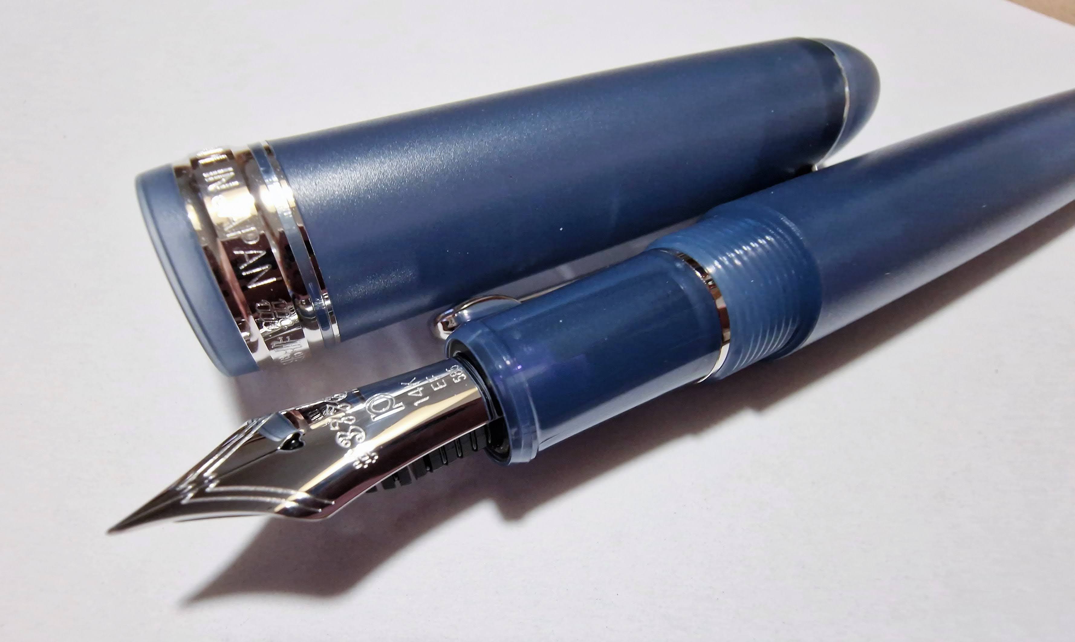 Questa penna si presenta di colore blu medio neutro, leggermente desaturato. La resina è sabbiata e traslucida. I trim sono in rodio. Ho scelto il pennino EF