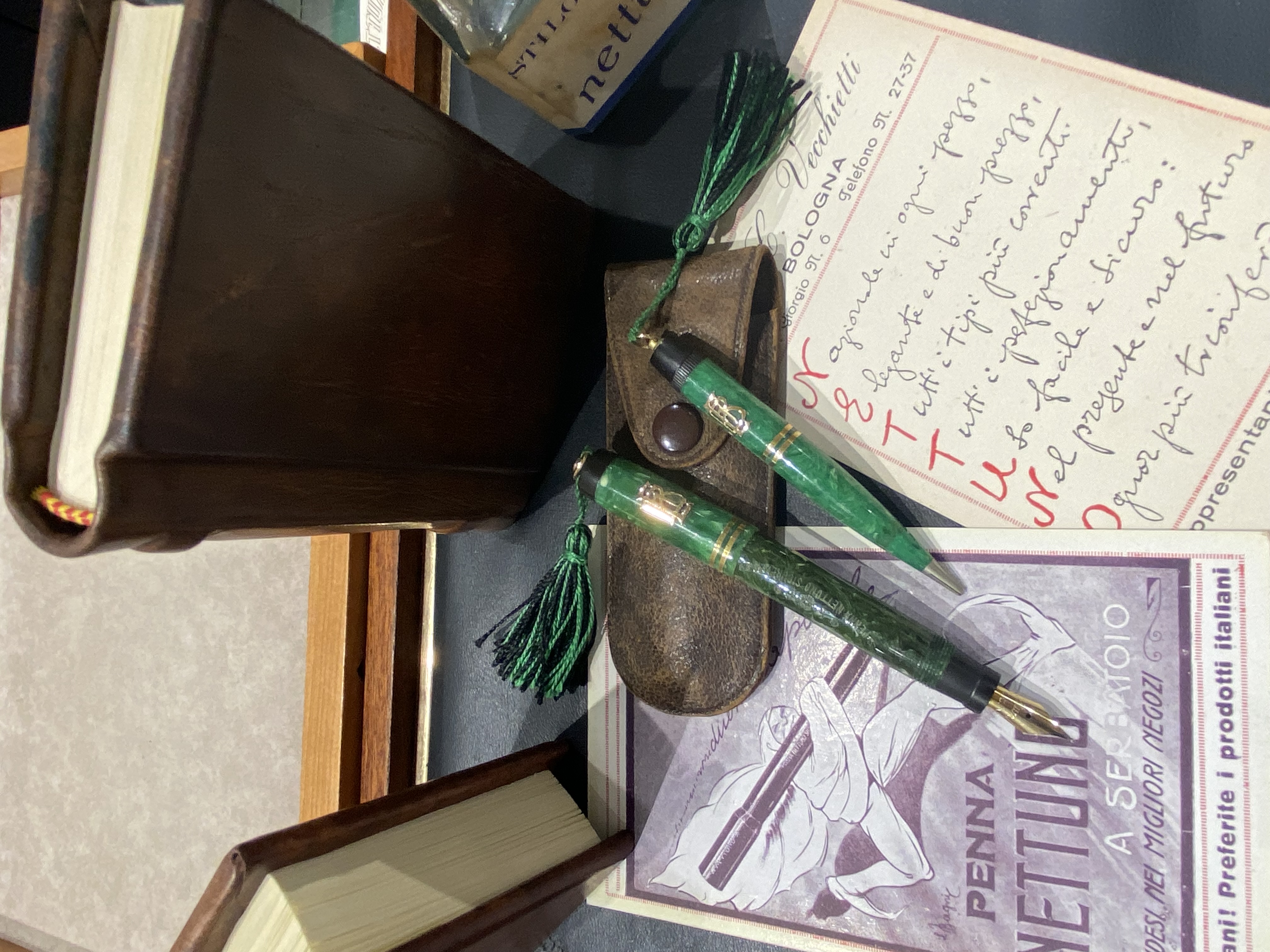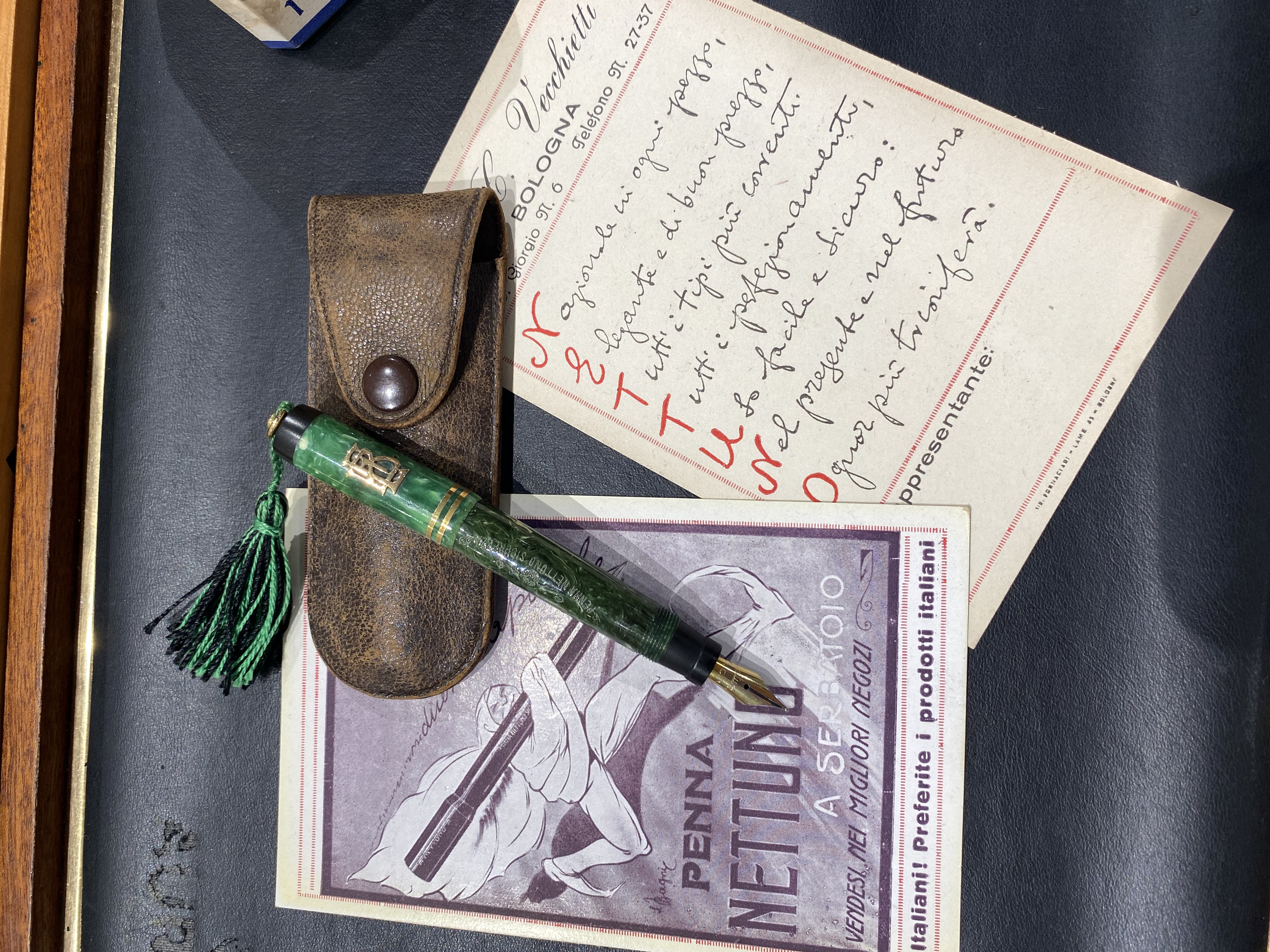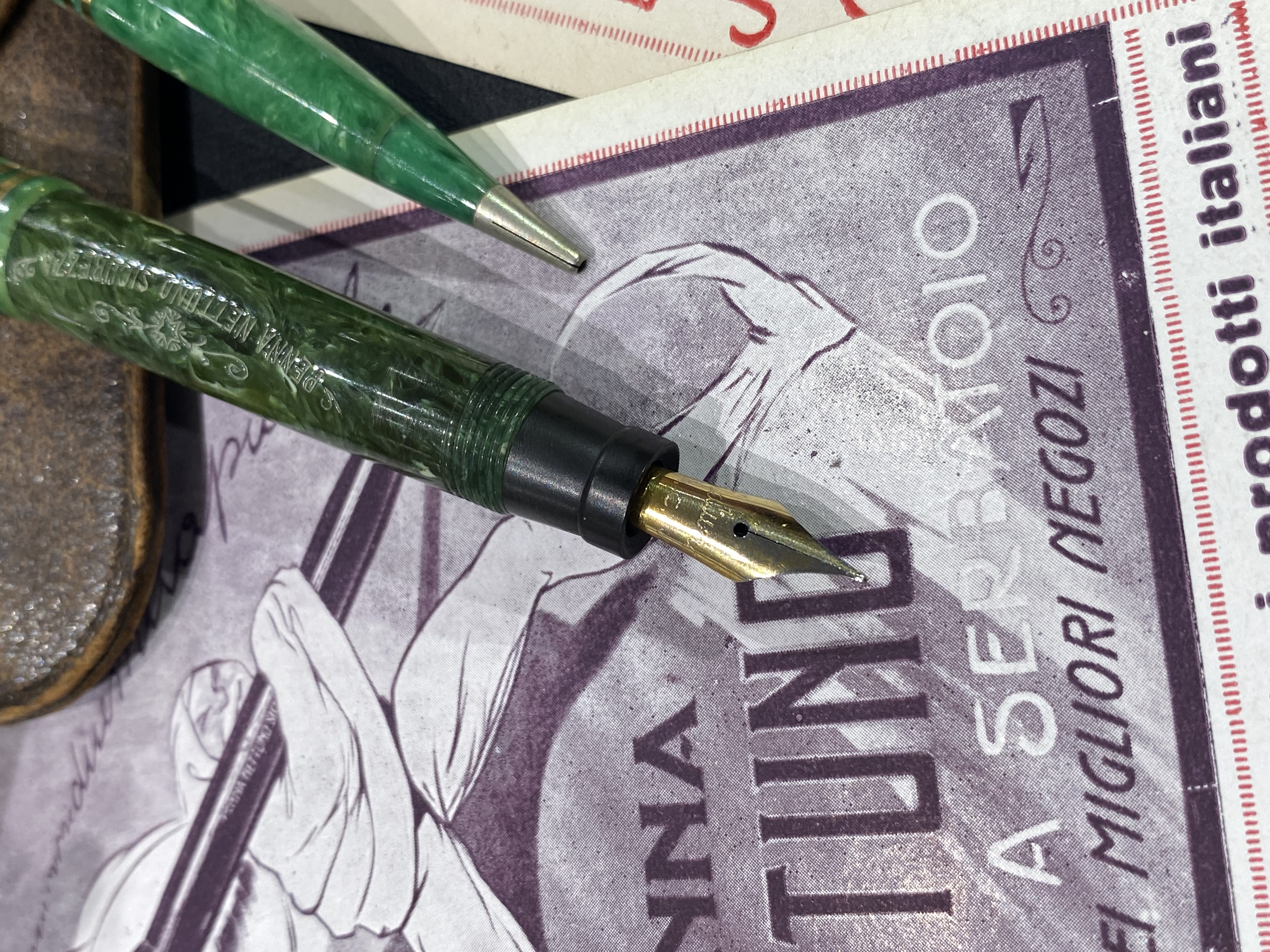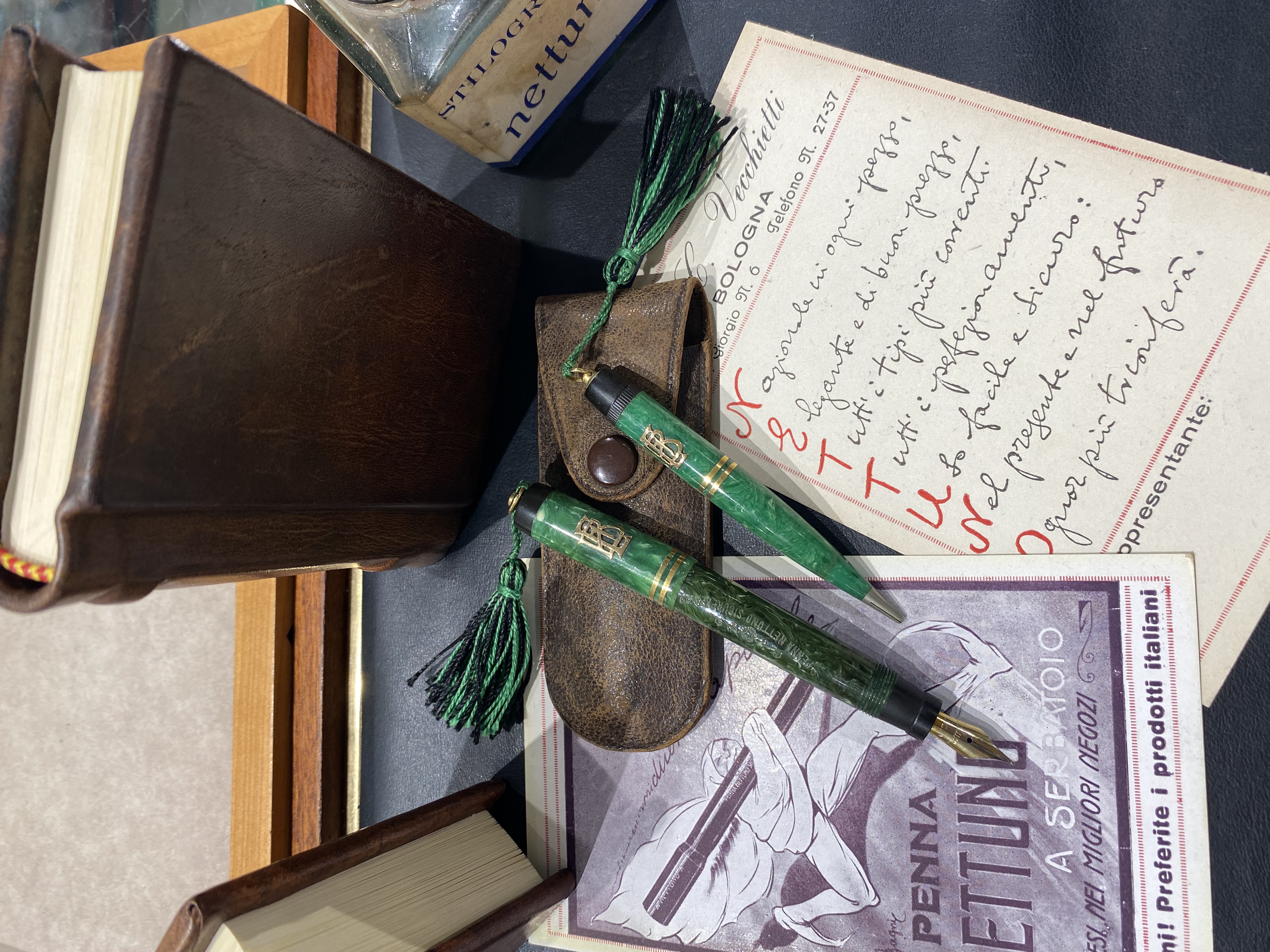 con ogni probabilità risalente agli anni ’30-’40 – ma come sempre mi affido all’esperienza di Simone per una datazione più precisa – vi presento questa parure Nettuno Sicurezza in celluloide verde, composta da penna e matita.