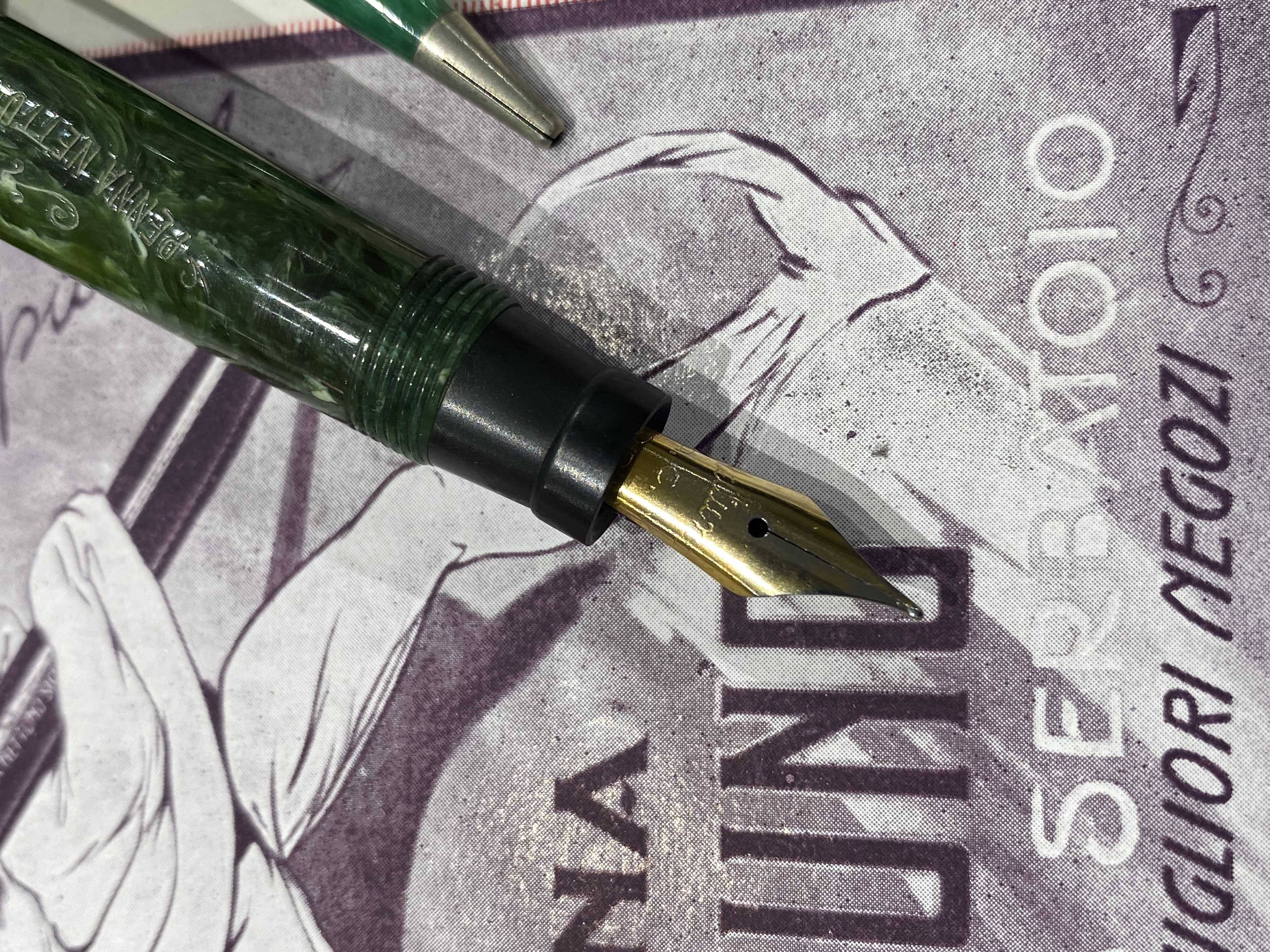 se è a pulsante penso si possa trattare della serie di modelli flat top in stille Duofold che vennero realizzati nel passaggio alla celluloide, prima che venisse lanciata la Superba. Purtroppo datazioni precise non si possono fare, ma molto a spenne direi dalla seconda metà degli anni '20 alla prima metà degli anni '30. Il fatto che mantenga la stampigliatura dei modelli in ebanite potrebbe suggerire più verso gli anni venti che i trenta.