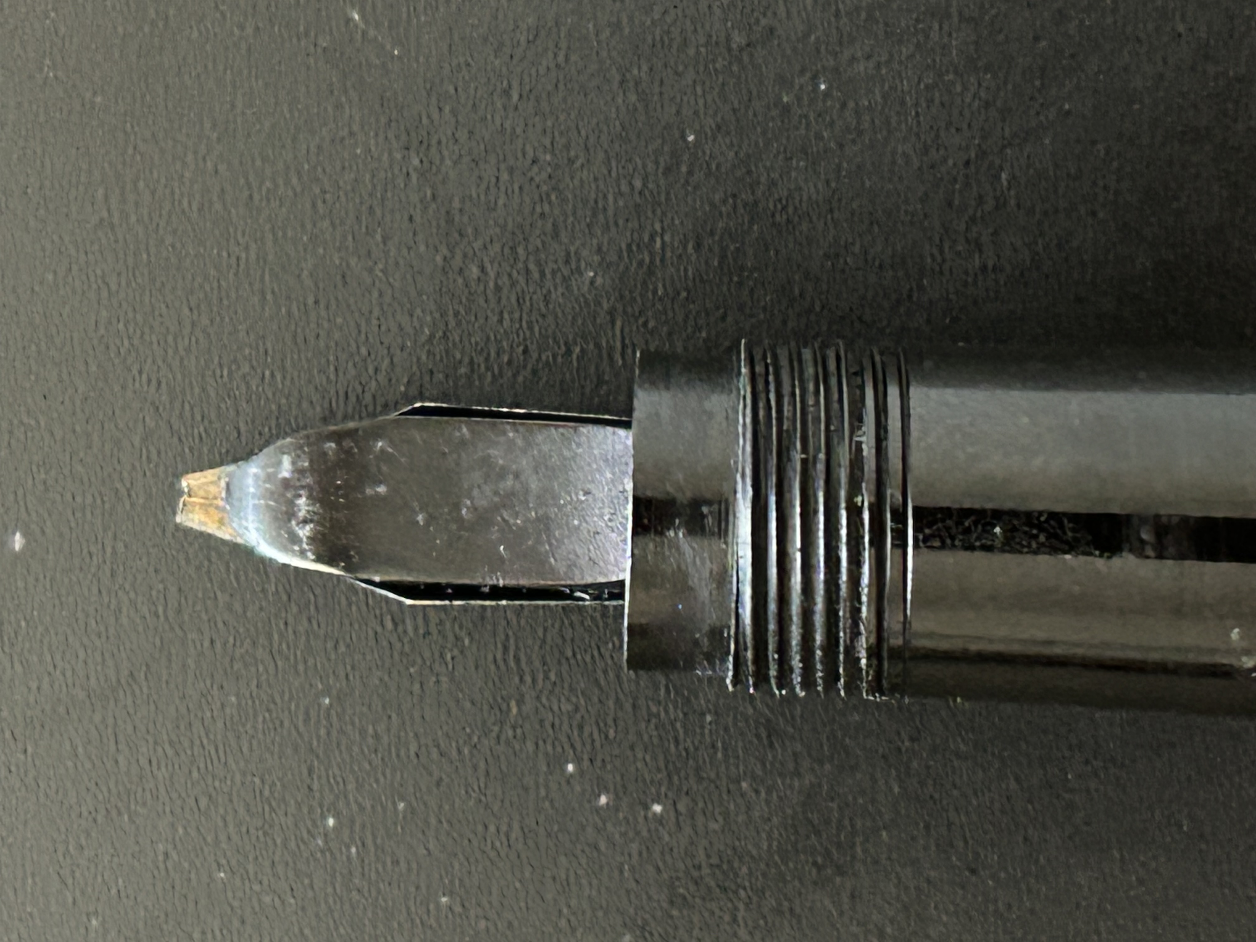 Ecco la foto dell’altro lato del pennino. Purtroppo il meccanismo di estrazione credo sia rotto perché, come scrivevo, il pennino esce e rientra senza alcuna resistenza. Per gravità, insomma. Anche il corpo non si apre. Senza forzare le parti, per evitare rischi di ulteriori danneggiamenti, vorrei consegnarla a qualcuno per il restauro.