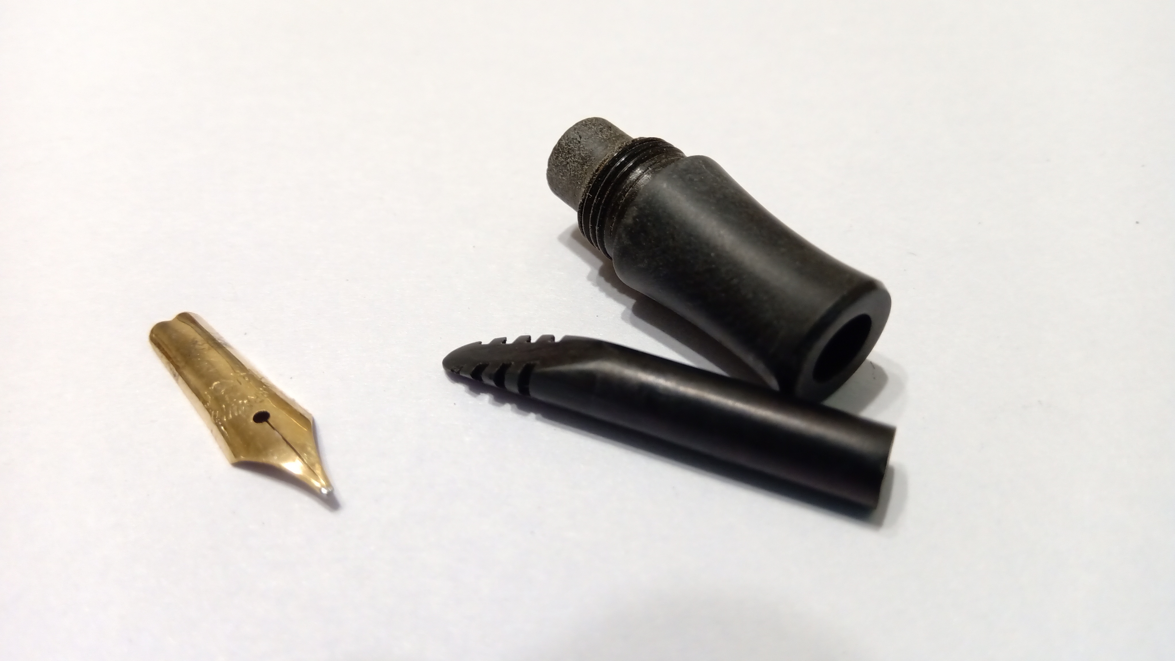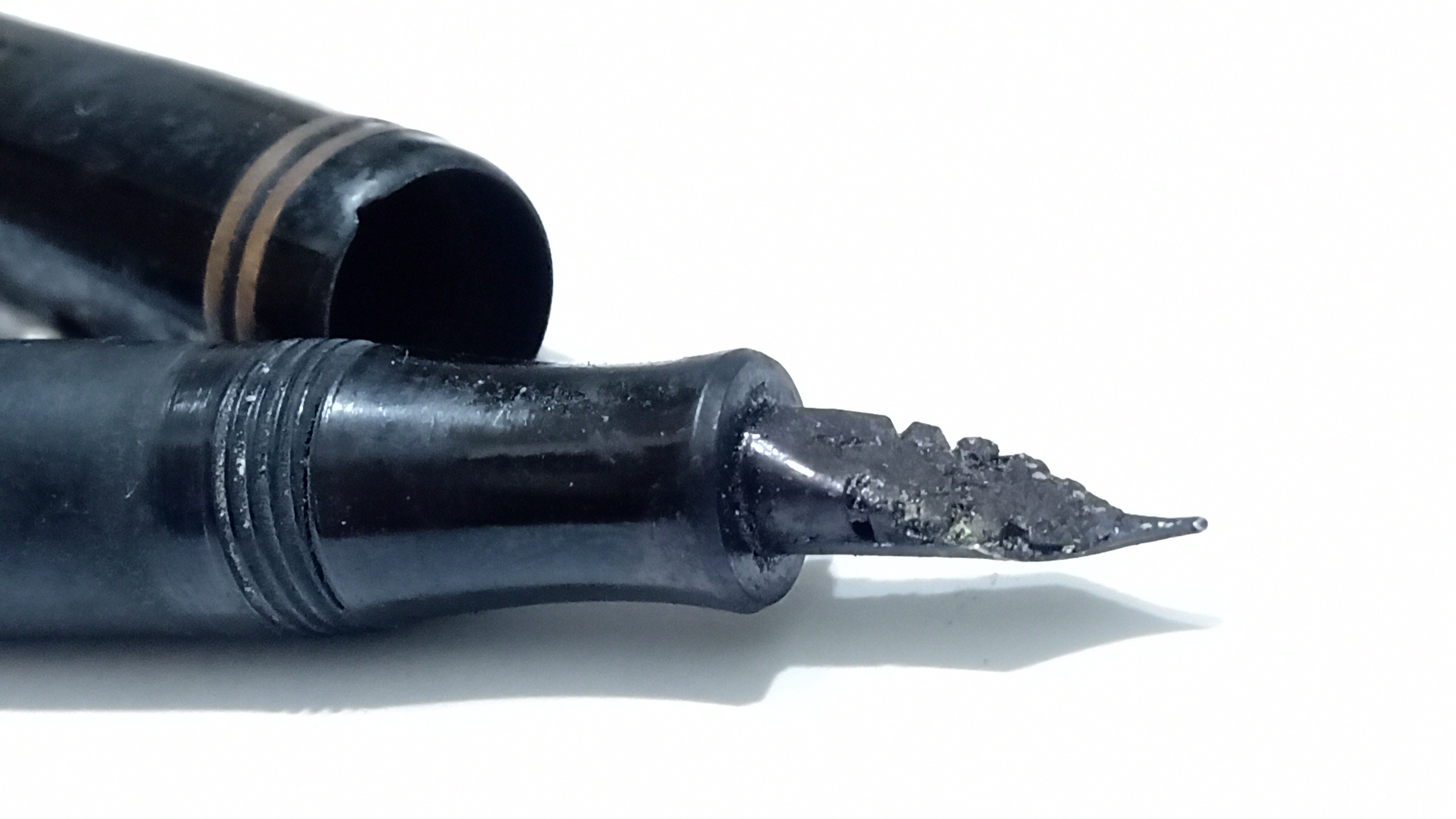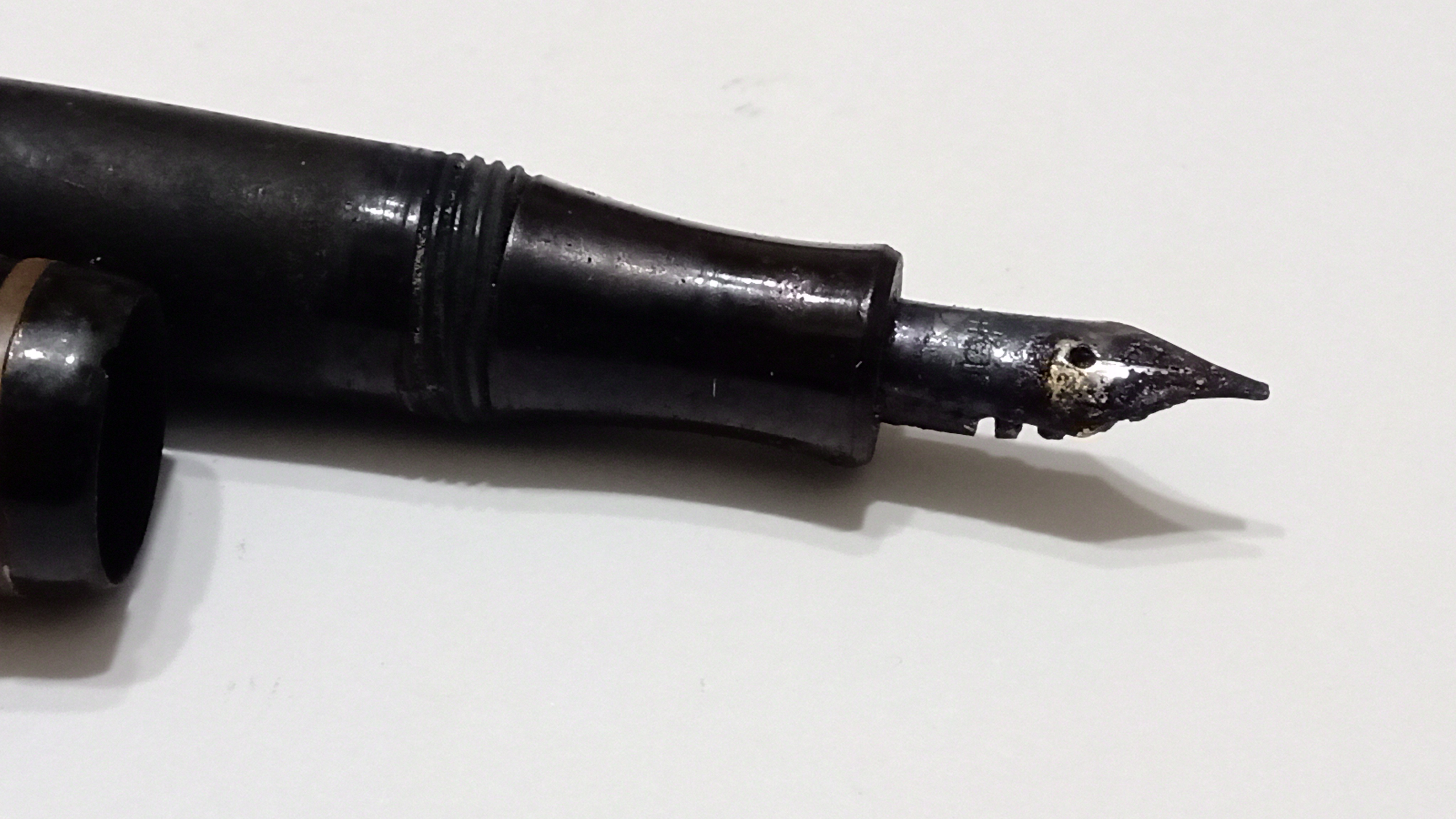 y tanto el plumín como el alimentador tenían tinta seca que formaba una sólida costra en ambas piezas...