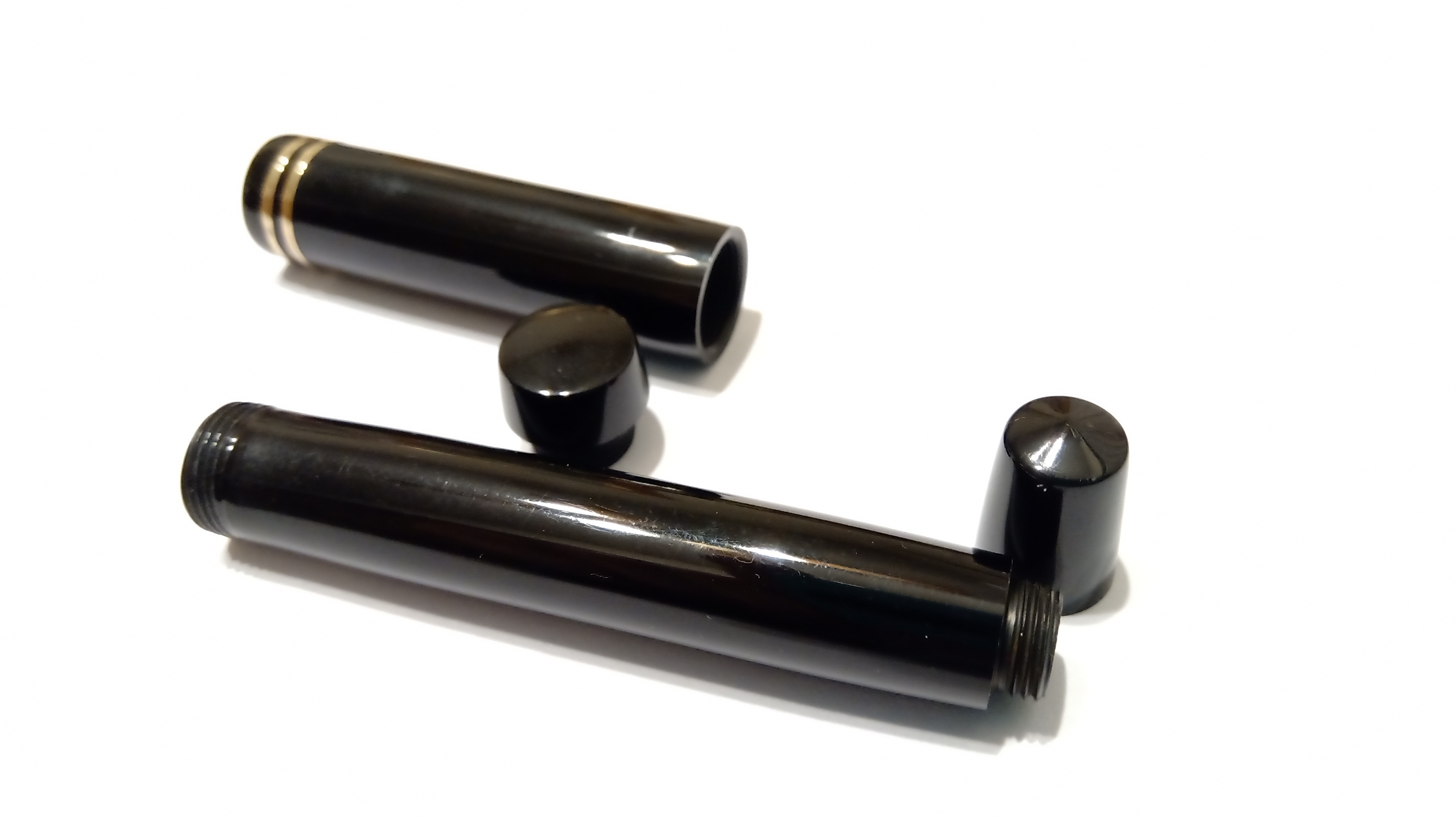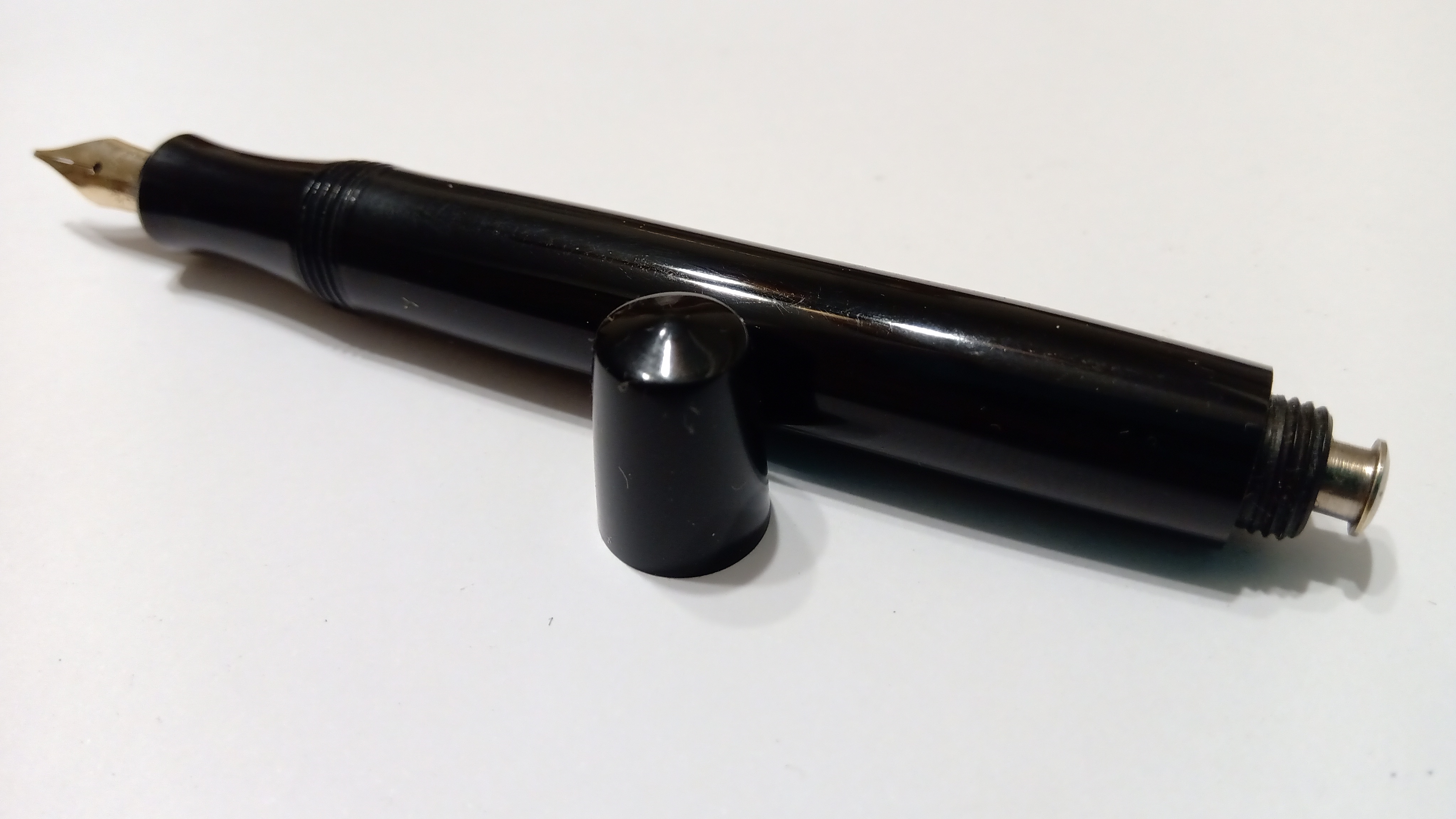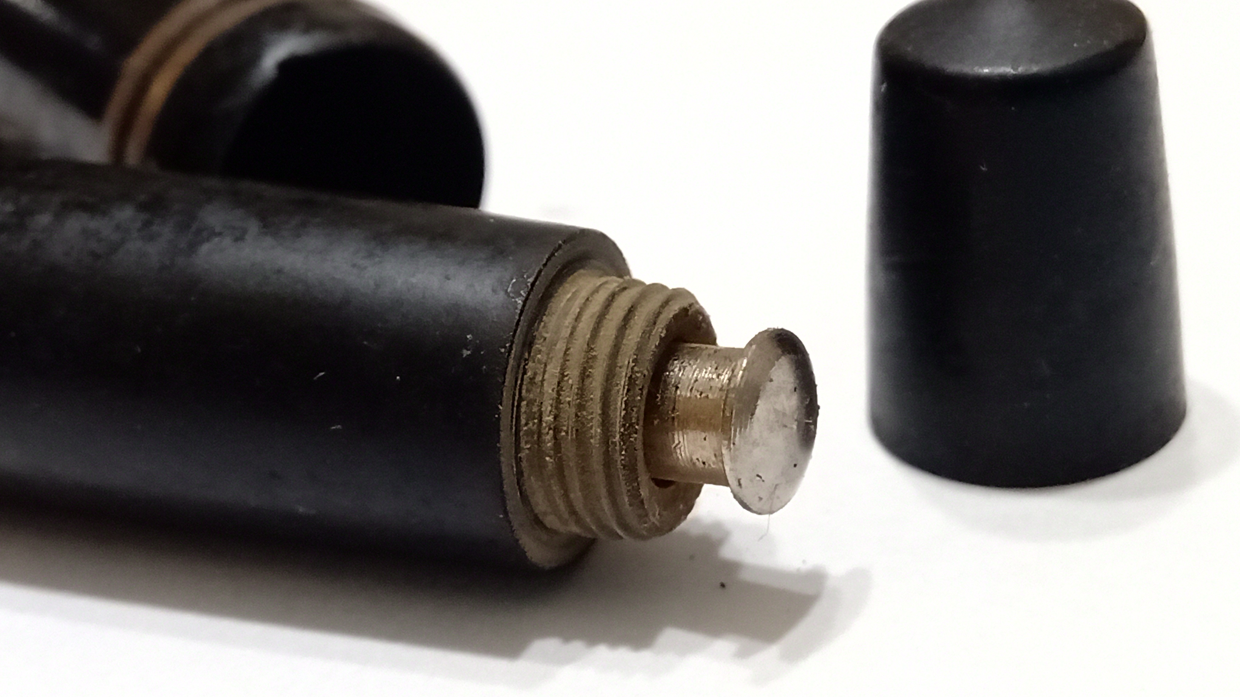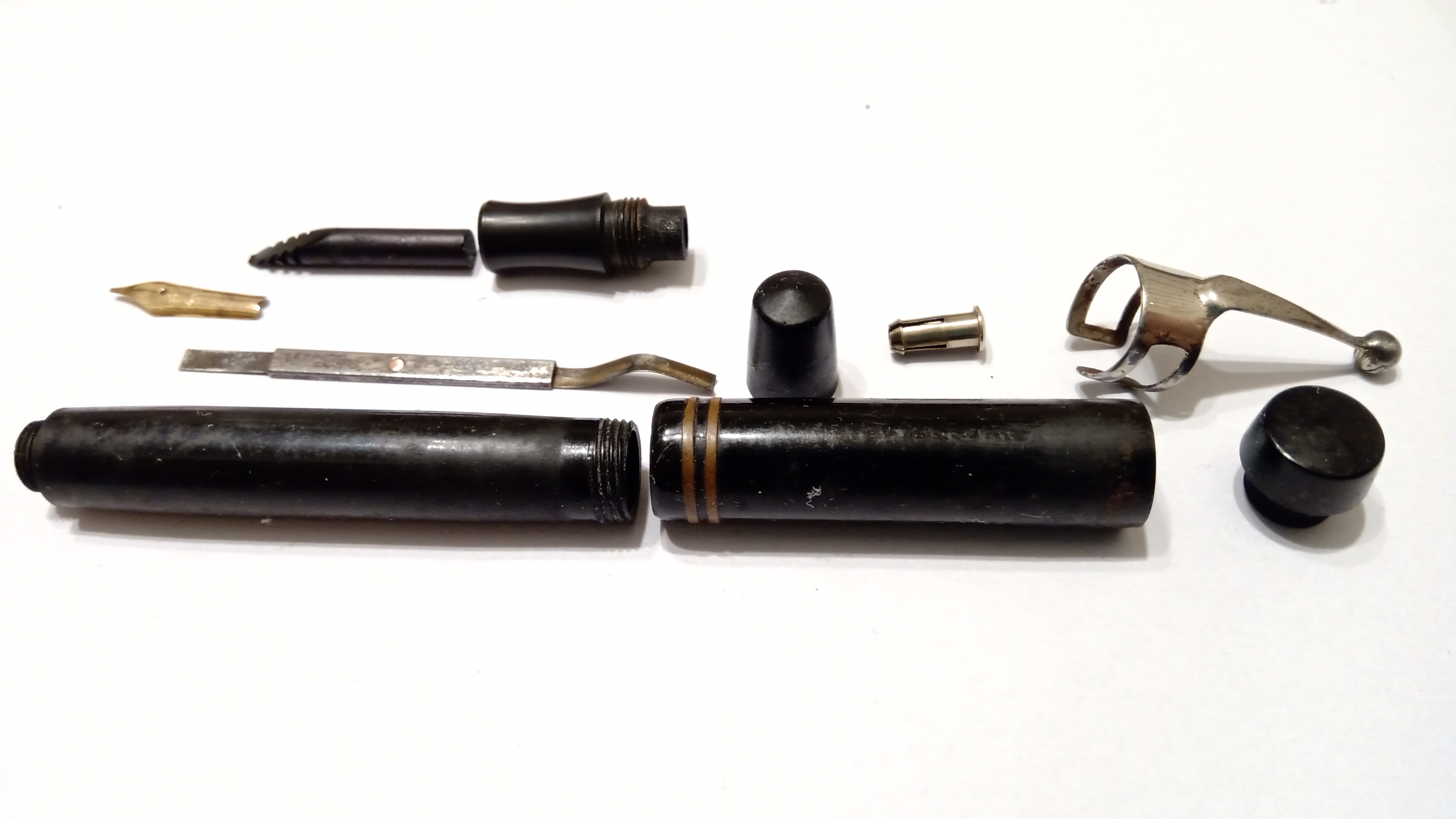 La cosa interessante è che l'artigiano che ha creato la penna, sicuramente consapevole delle caratteristiche dimensionali della caseina, ha lasciato un ampio gioco in tutte le filettature, in modo che il passare del tempo non causasse rotture o crepe dovute alle contrazioni e alle espansioni del materiale a causa dei cambiamenti di umidità. È stato quindi davvero facile svitare le diverse parti.