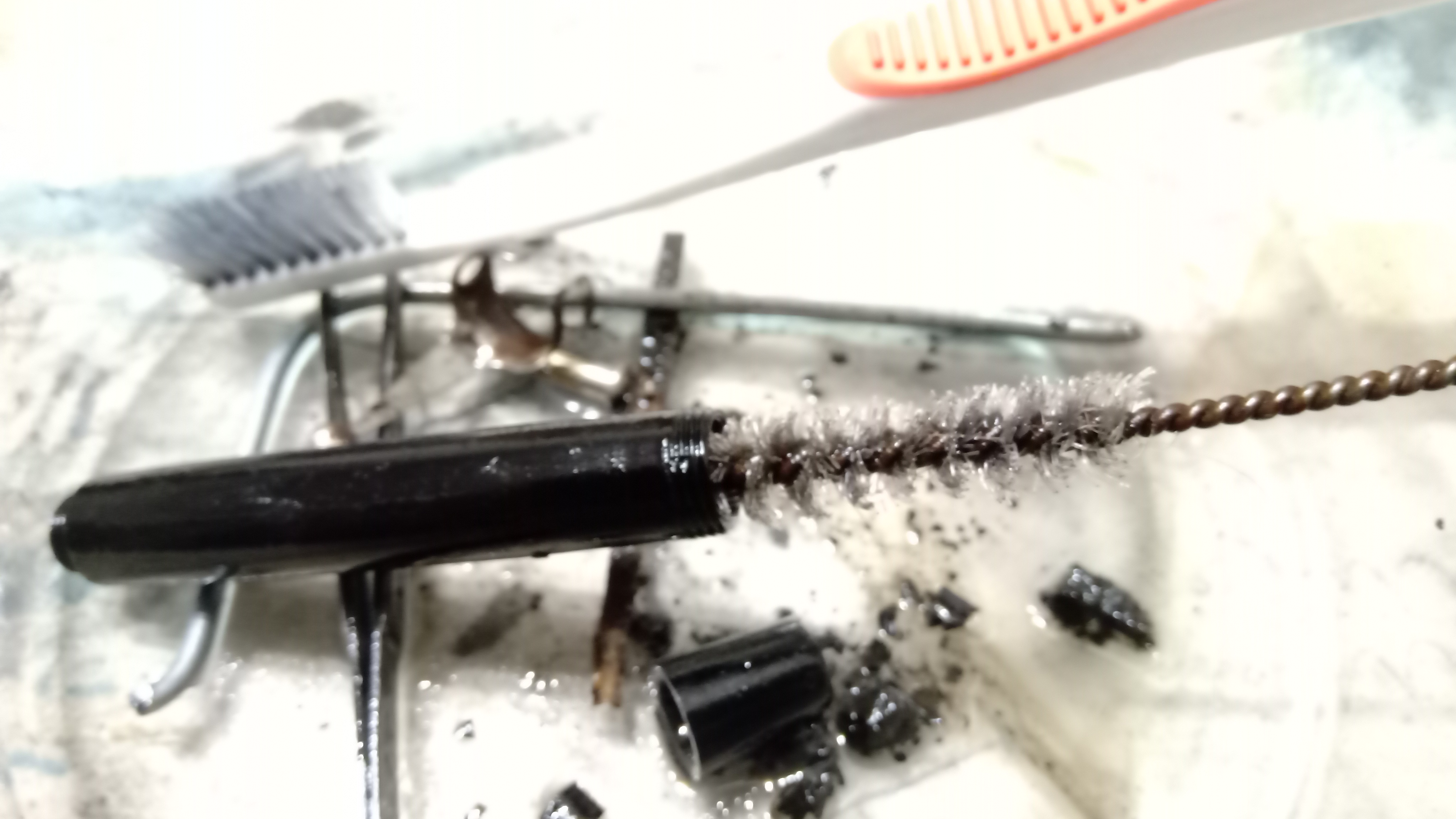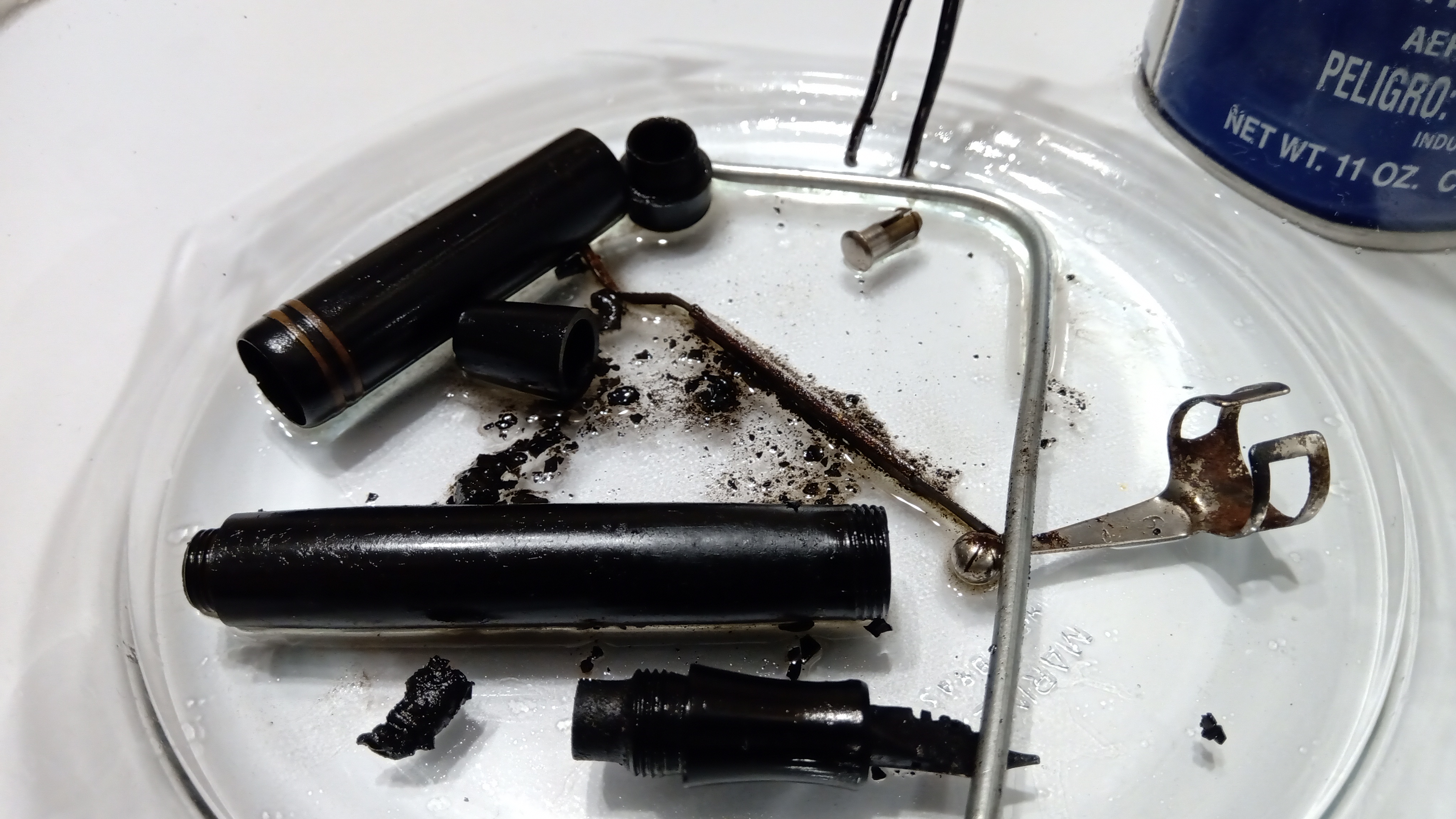 Así entonces, sabía que excepto por el grip y el alimentador, no podía tocar el resto de modo alguno con algo que tuviese ni por asomo agua en su composición, y por eso comencé la limpieza de todos los elementos bañando los mismos en WD40...
