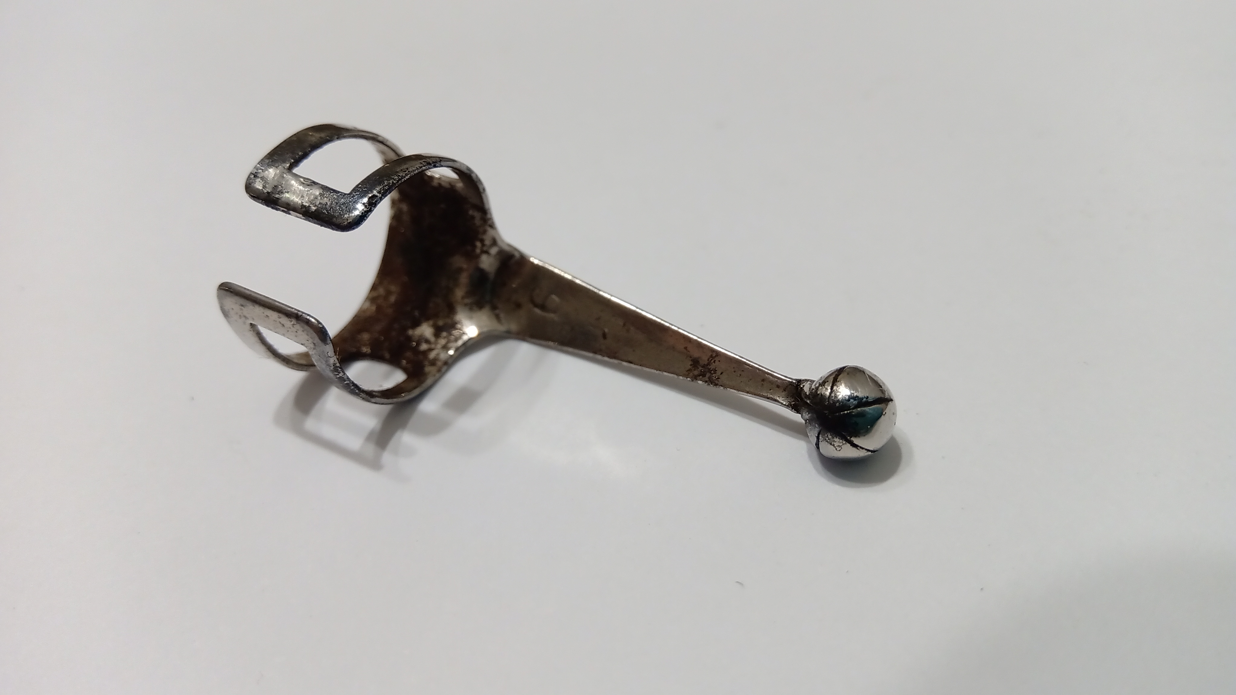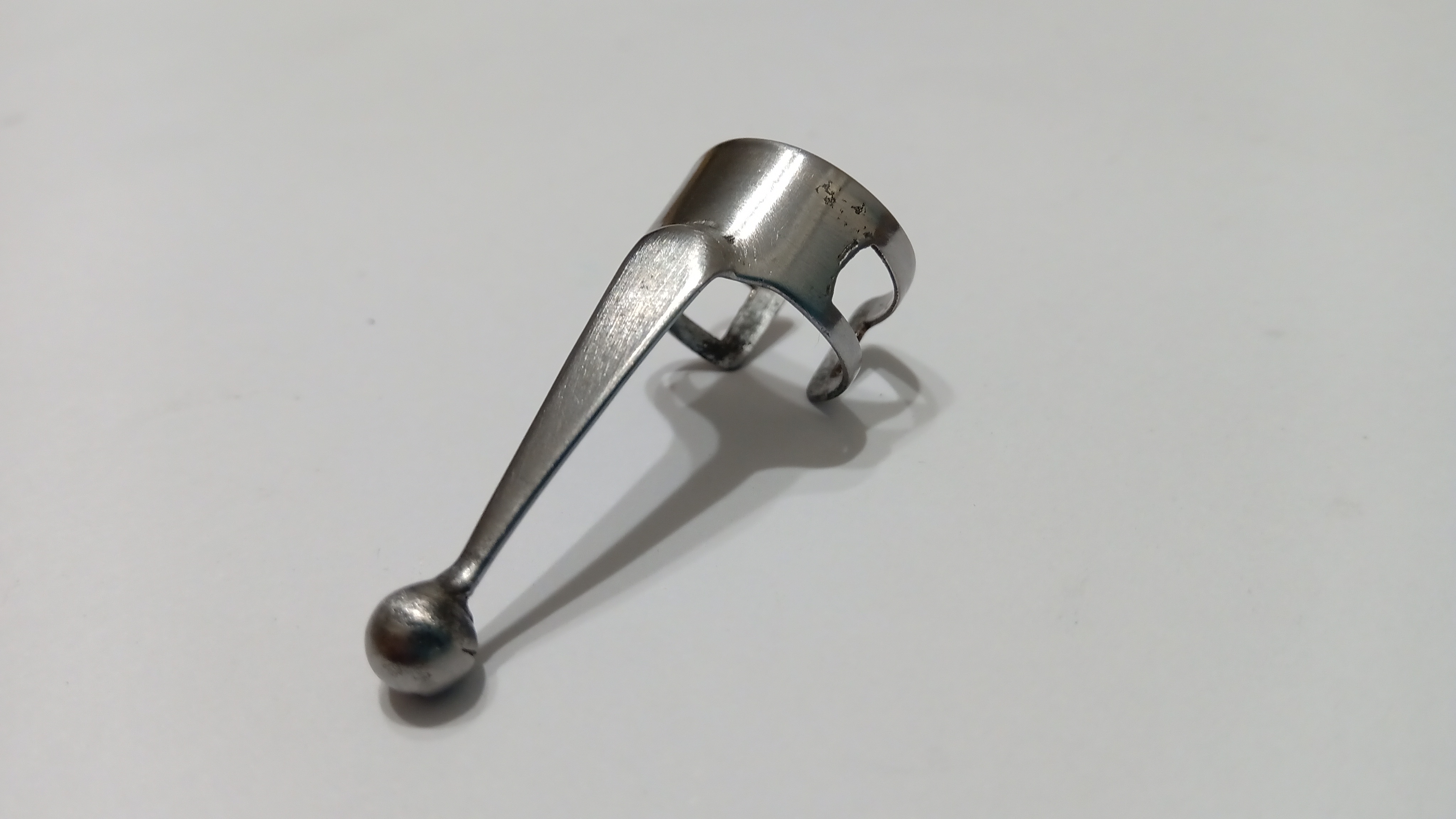Gli era stata applicata una clip di metallo rimovibile, piuttosto arrugginita, il cappuccio presentava due anelli molto opachi, con una frattura e una mancanza di materiale sul bordo...