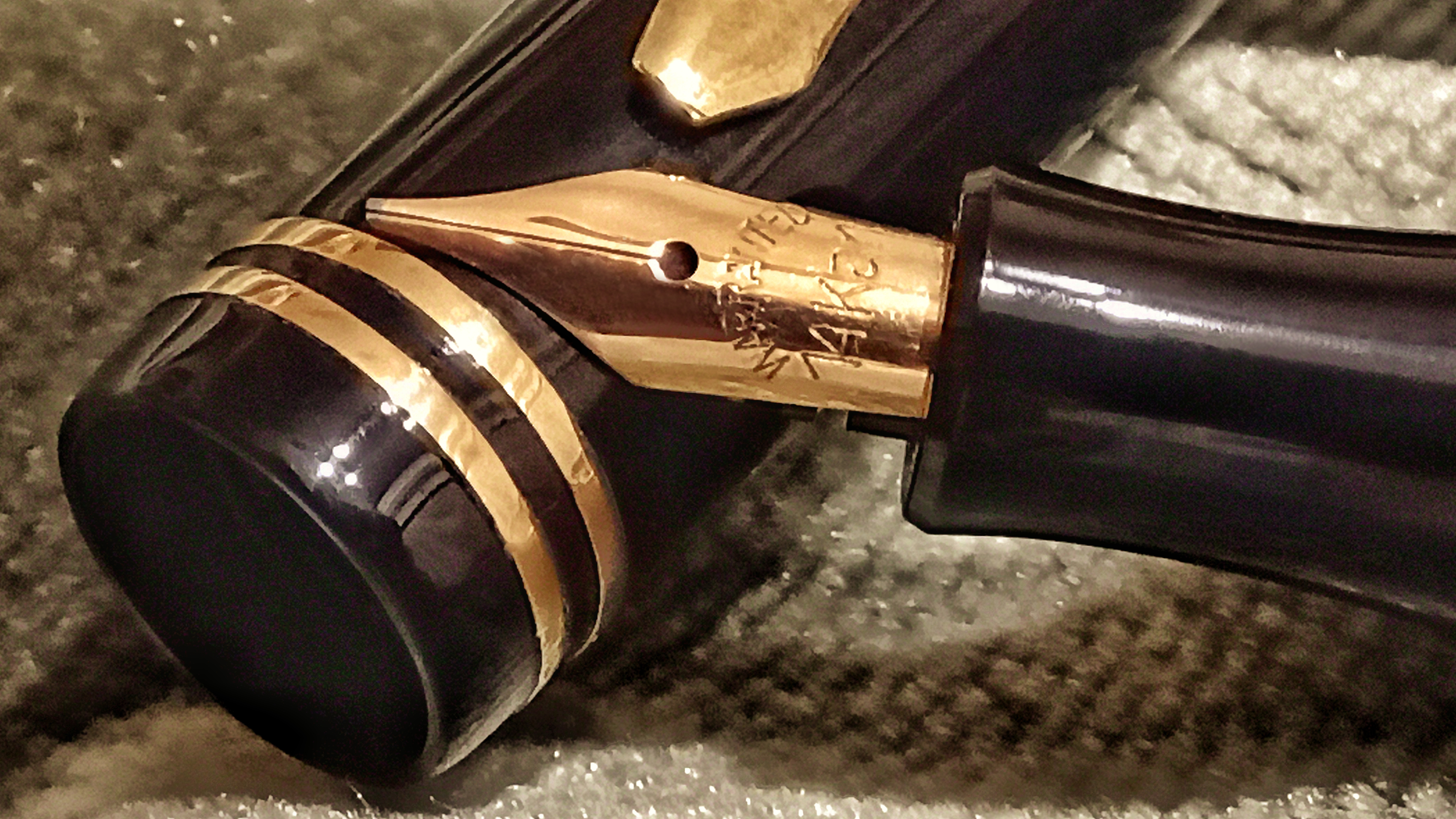 descubrí que esos dos anillos del capuchón habían sido colocados por el artesano en oro 14k...!!! Ya el plumín me había sorprendido, al develar debajo de toda esa tinta seca que se trataba de un hermoso Warranted 14k flexible, y ahora esos preciosos anillos...