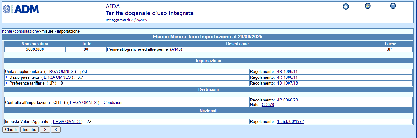 la tariffa doganale (TARIC) per le penne stilografiche è 9608300000