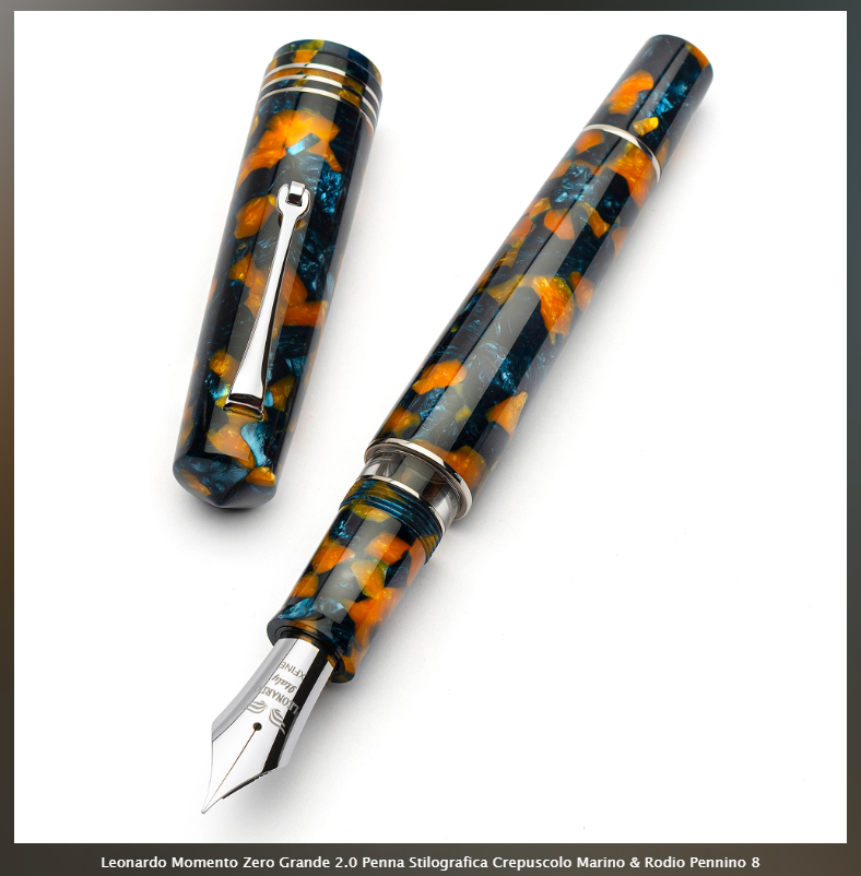La nuova Leonardo Momento Zero Grande 2.0, nella colorazione Crepuscolo Marino (che più la guardo e più mi sembra la bellissima resina scelta dal CSN per la versione in resina della suddetta The King) viene offerta con un (a me pare) finora mai visto sulle Leonardo pennino #8 in acciaio.