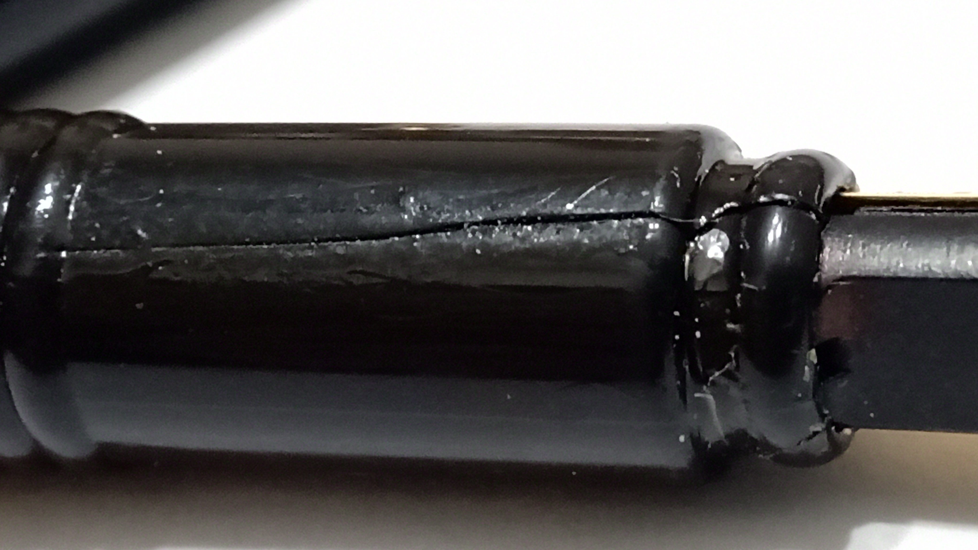 El principal problema se encontraba en el grip, con una tremenda rajadura, ya bien pronunciada, que se extendía a lo largo de todo el calce de alimentador y plumín, y que por mediana suerte se había frenado en la pared que separa el alimentador del depósito de tinta...