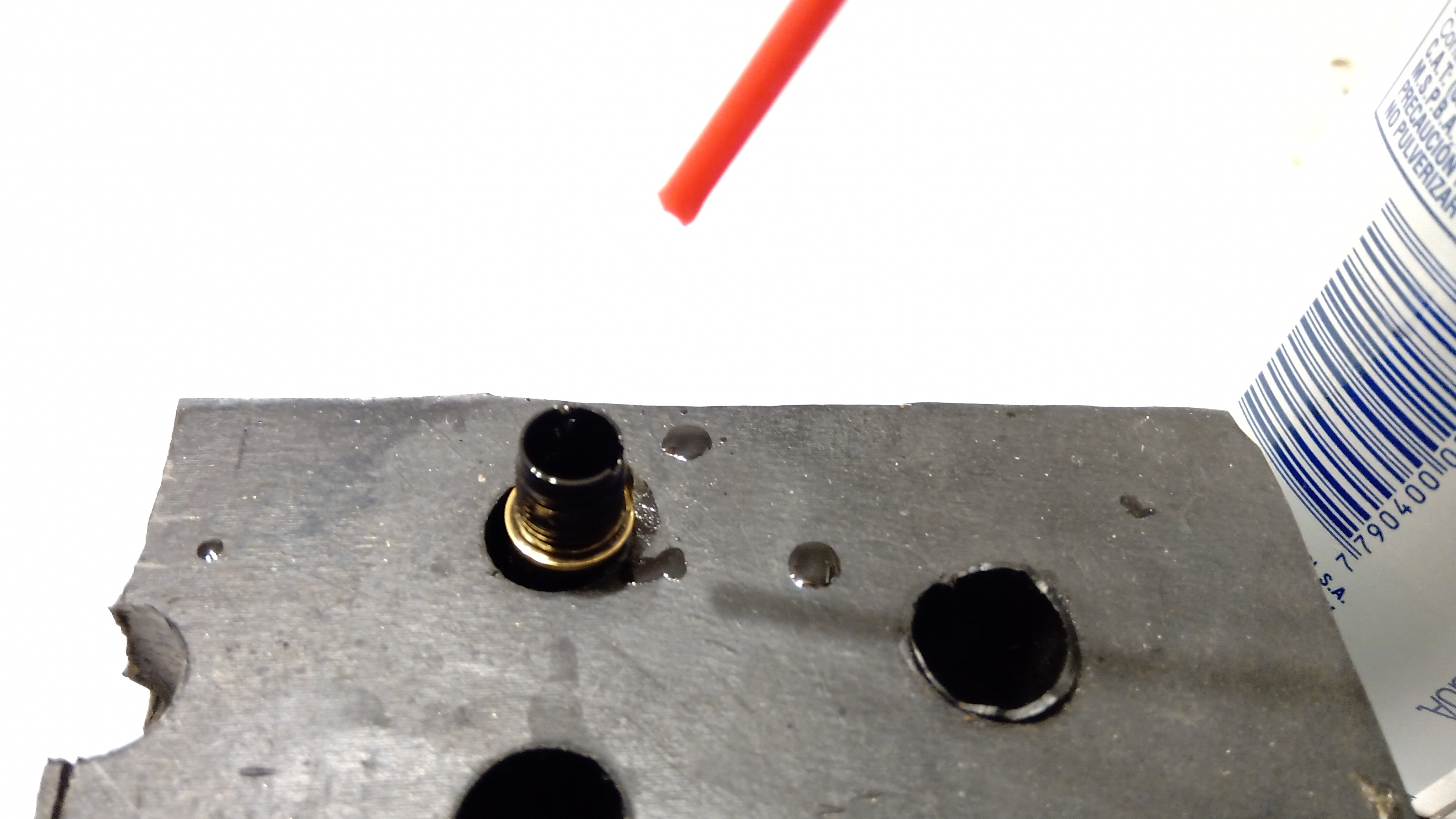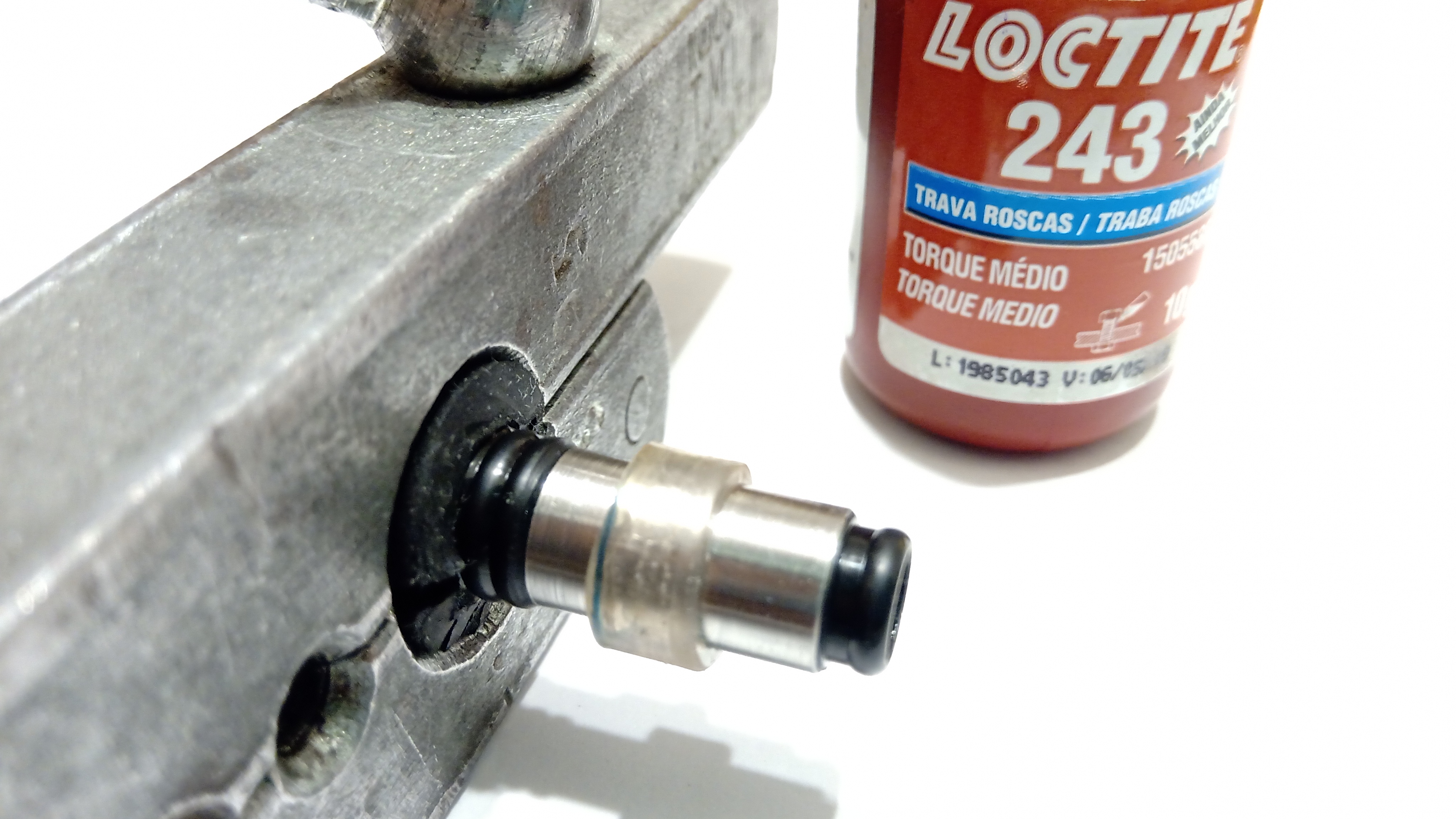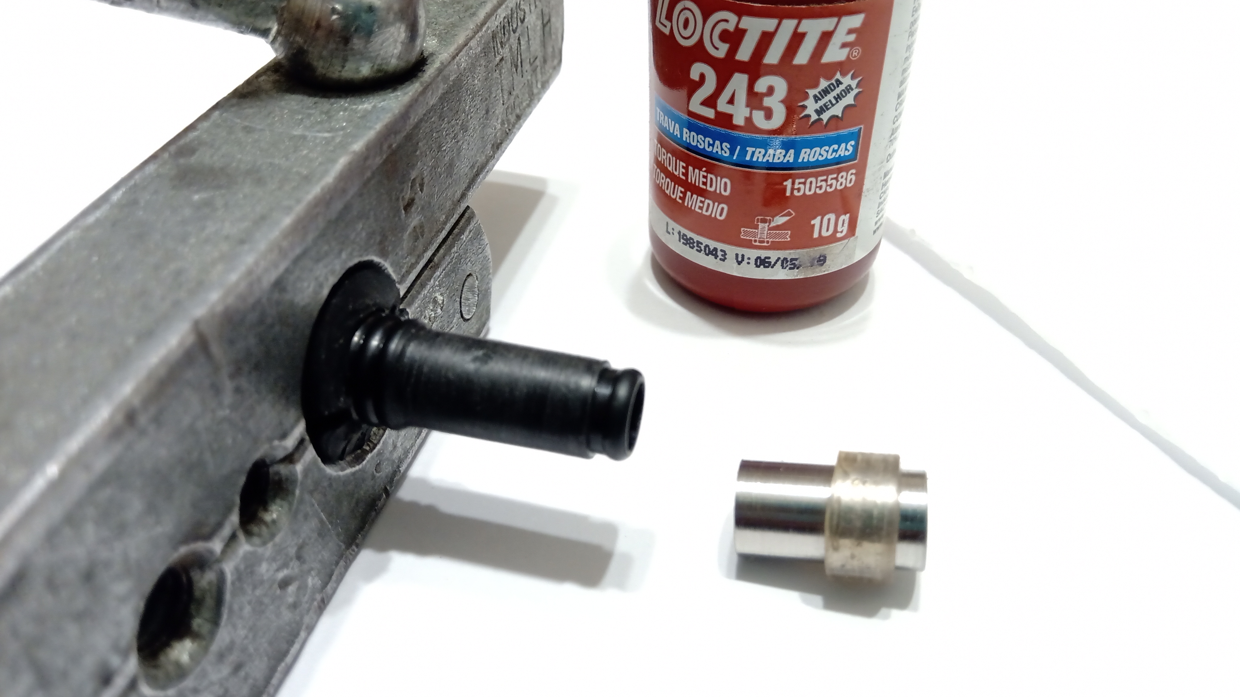 Una volta preparati i pezzi, ho fissato l'impugnatura in una morsa a sede curva con gomma dura e ho impregnato con Loctite 243 l'area in cui avrebbe dovuto essere inserita la camicia, che avevo precedentemente fissato con una rondella di plastica per facilitarne la manipolazione.