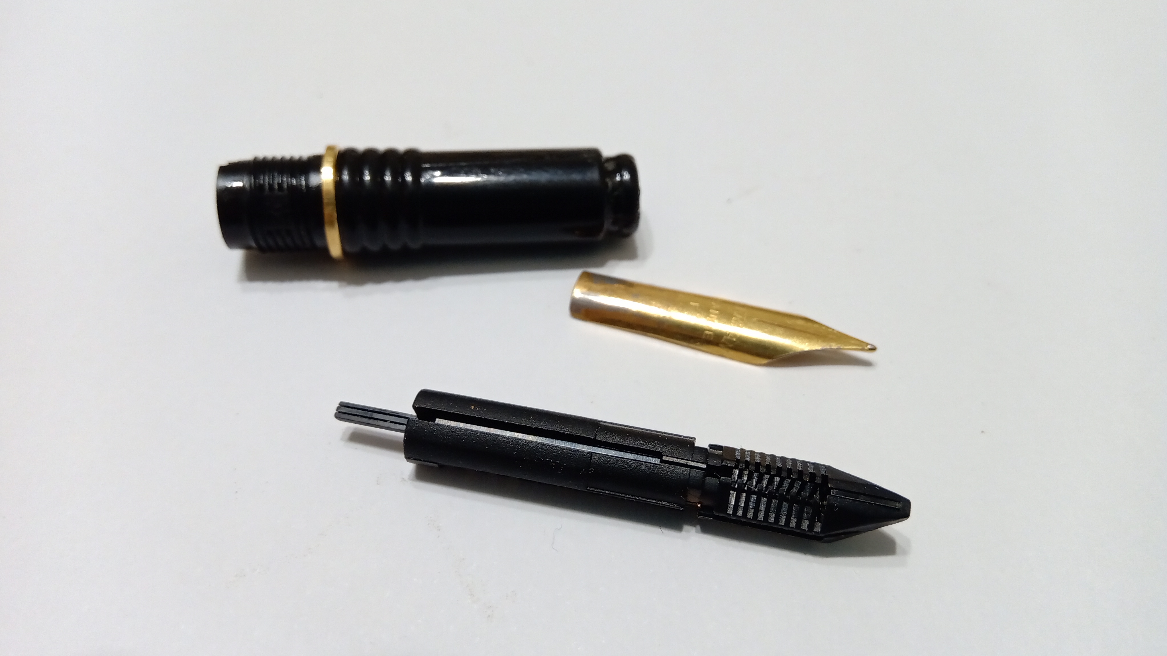 El plumín original estaba perfecto con respecto a su conformación e iridio, pero el enchapado presentaba graves fallas, de modo que con sólo tocar con los dedos se comenzaba a saltar y perder el mismo, realmente muy extraño en un plumín de la marca...