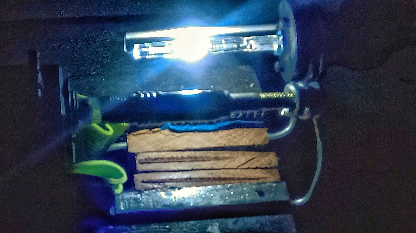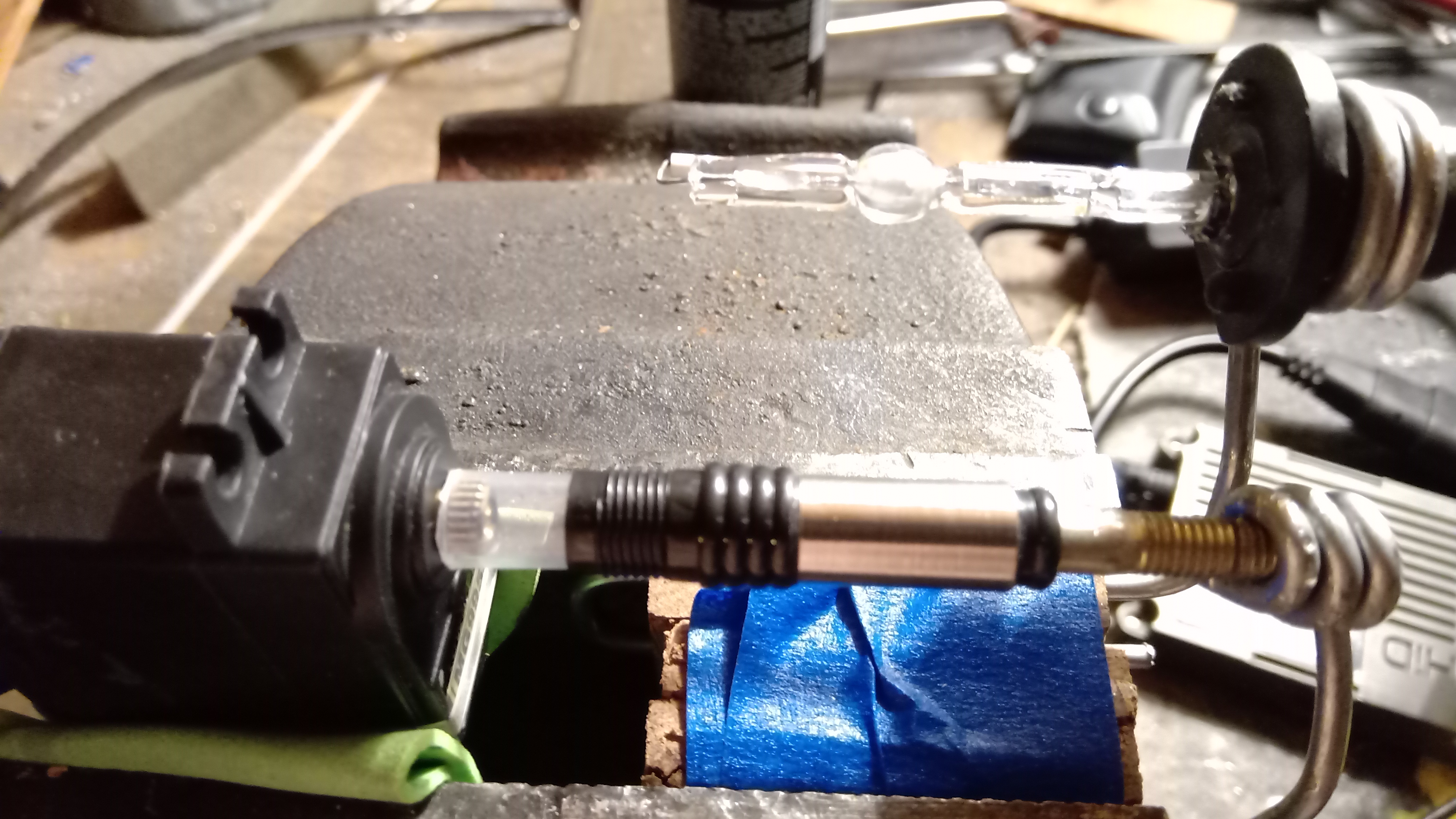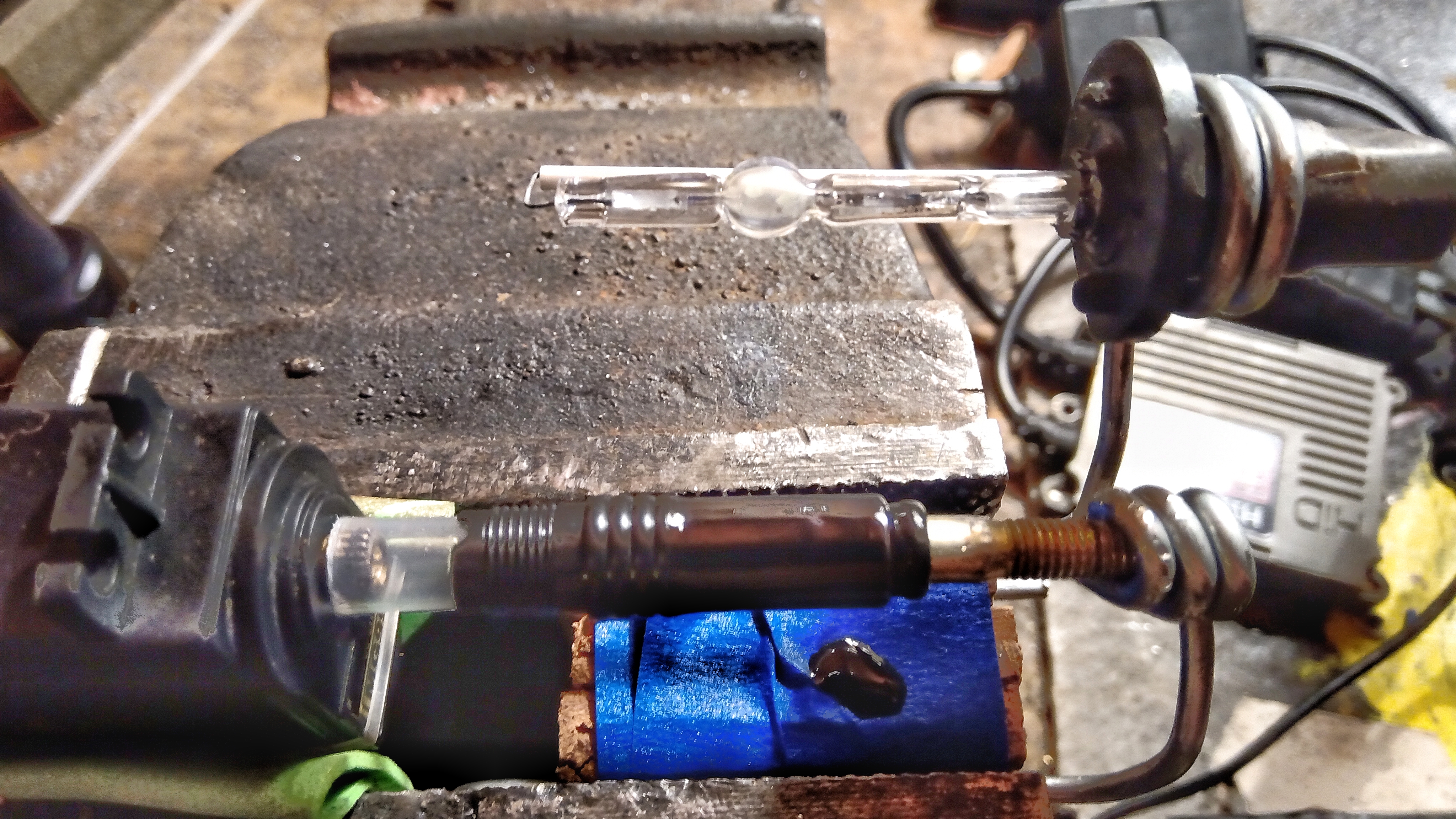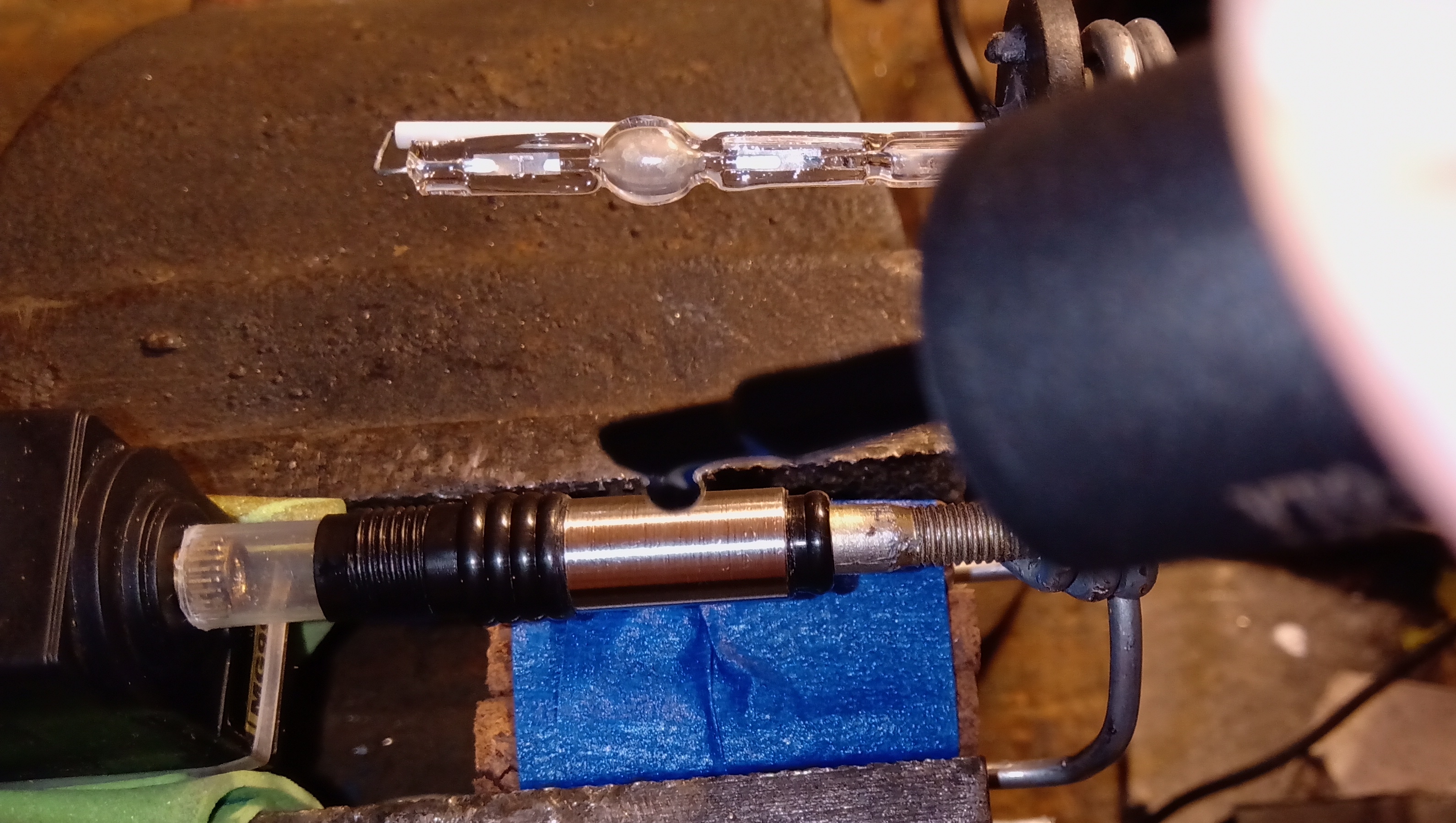 Come si può vedere, avevo rimosso la capsula di quarzo che normalmente viene posizionata per filtrare le radiazioni UV, poiché l'obiettivo era quello di ottenere una lampada con il massimo carico “sporco” di radiazioni.