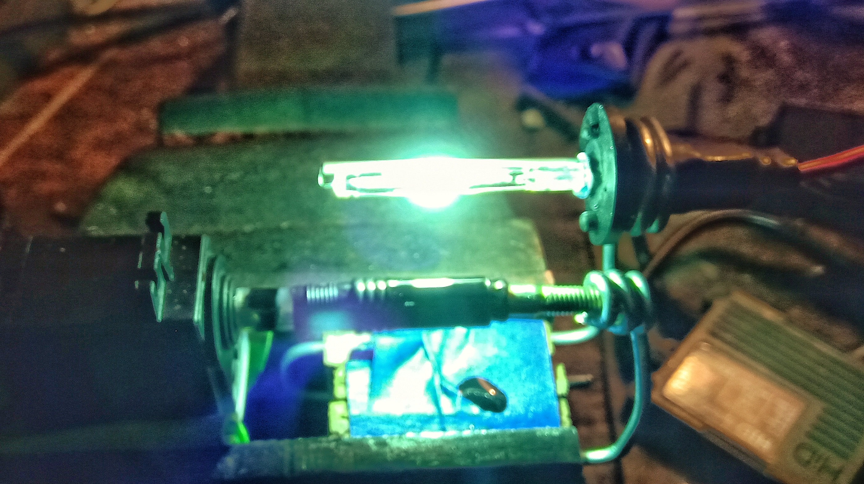 Ho cercato innanzitutto una fonte di radiazione UV, provando con una lampada alogena, ma la sua potenza non era sufficiente...