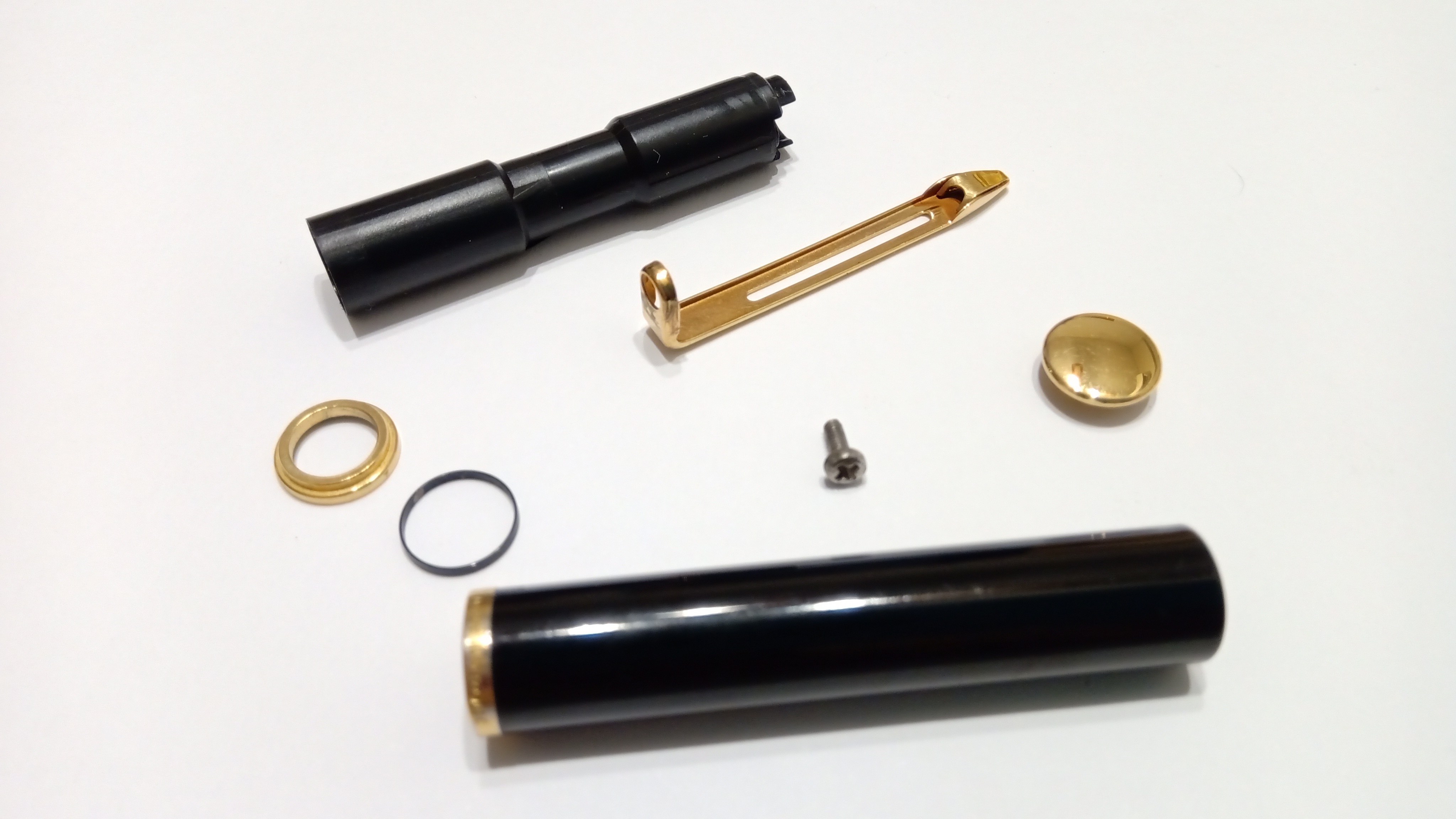 Ho quindi iniziato a smontare il cappuccio rimuovendo la clip, l'inner-cap e il tappo placcato...
