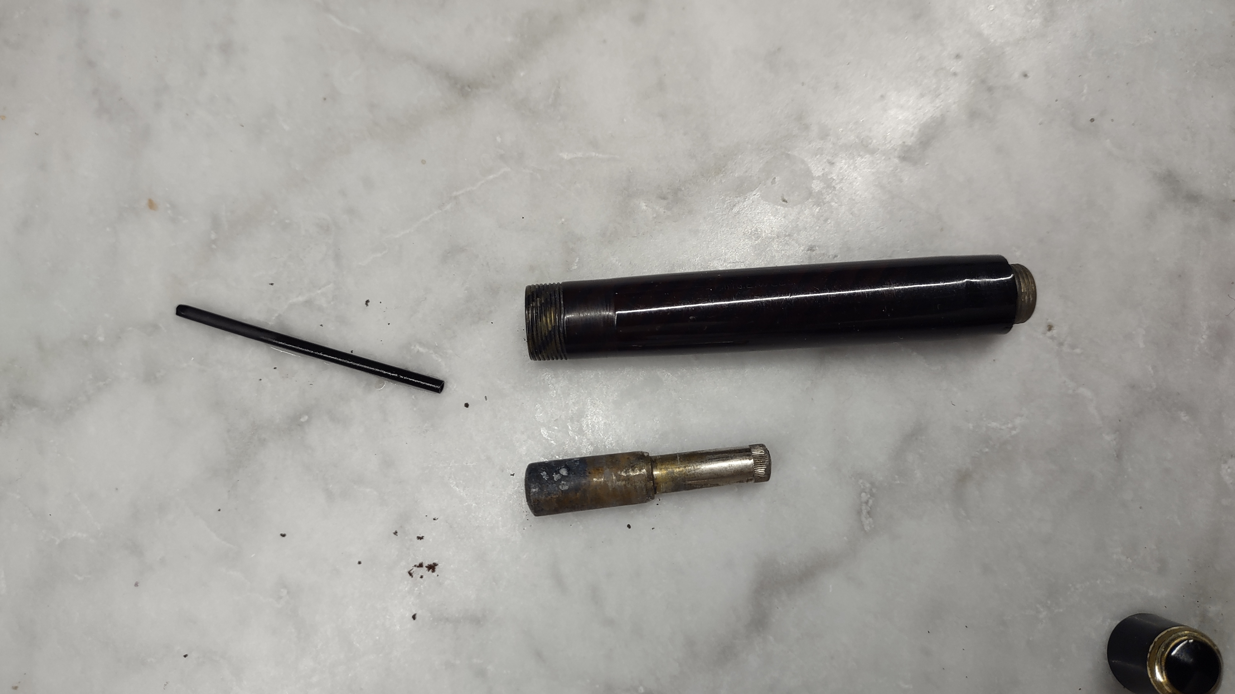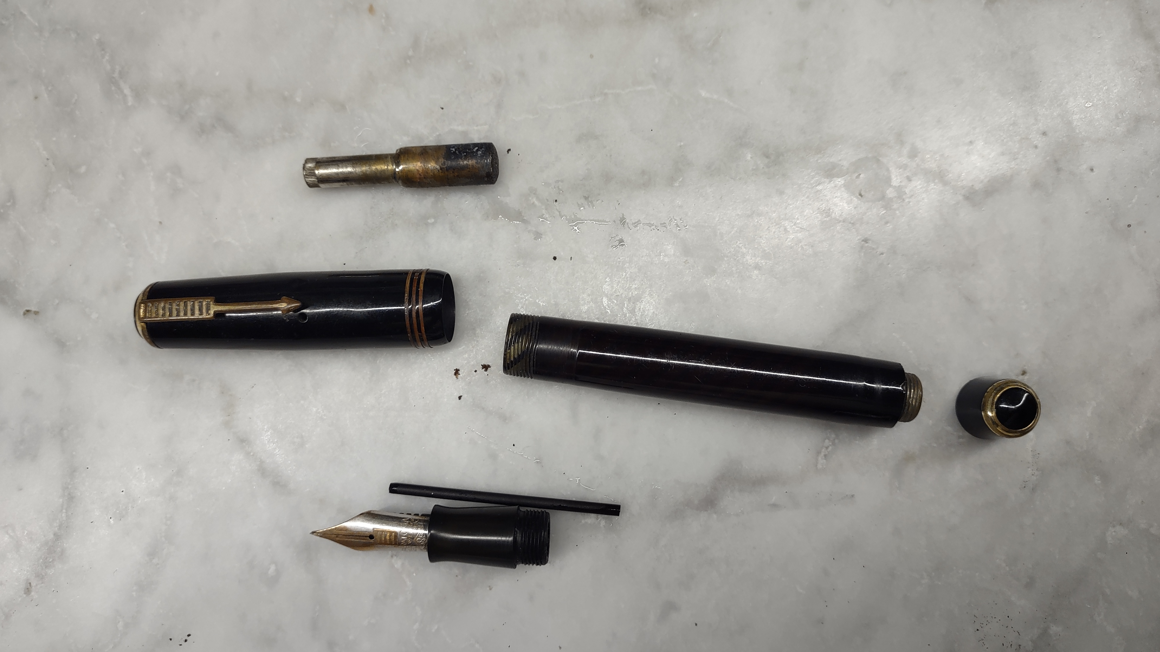 Ho recuperato oggi da una bancarella, questa Saratoga Ing. E. Webber Ha un sistema di caricamento misterioso che sembra una specie di Vacumatic che funzioni ruotando il pistone di di alluminio invece che premendolo. Non riesco a capire come farlo funzionare. Suggerimenti?