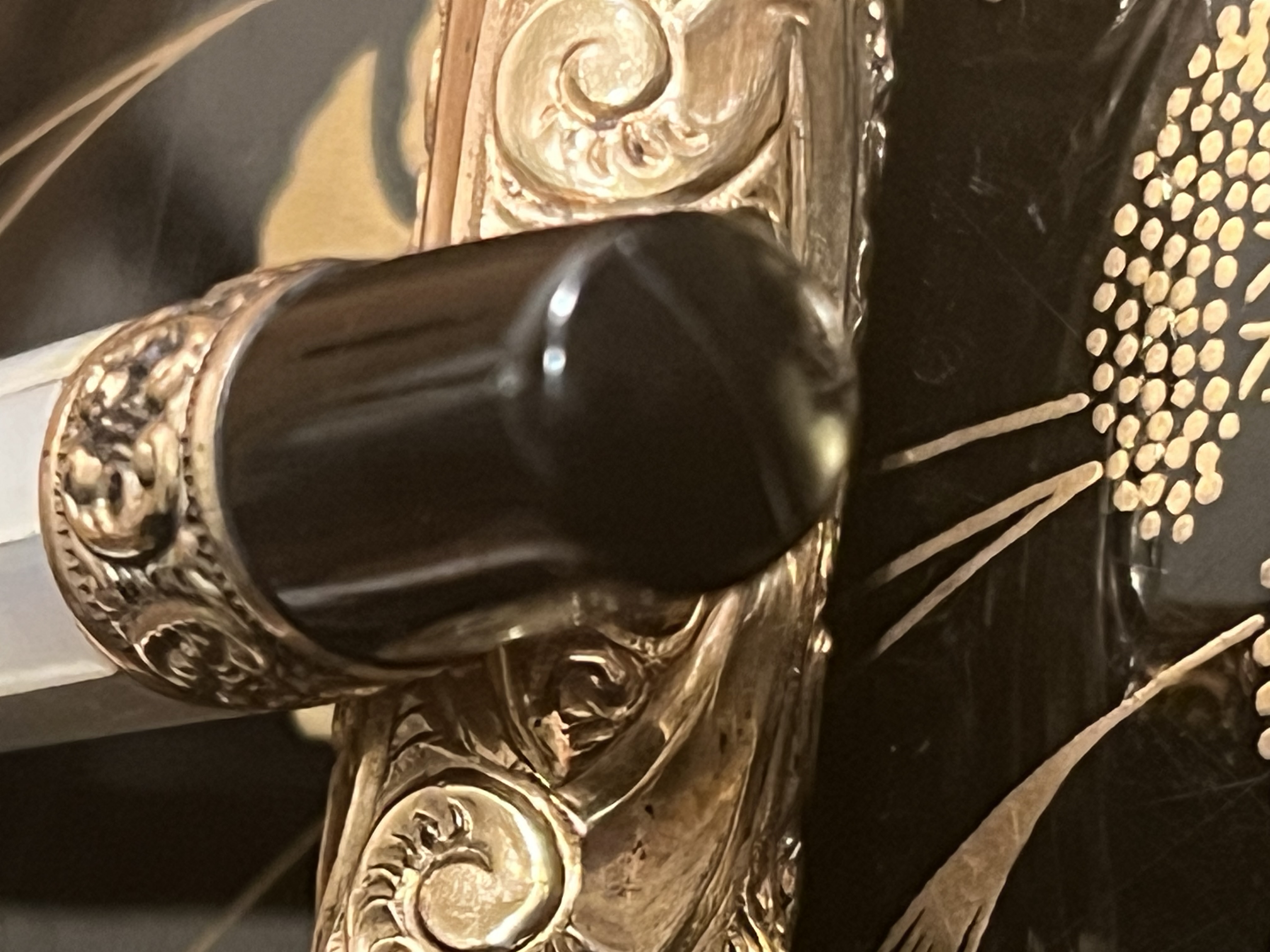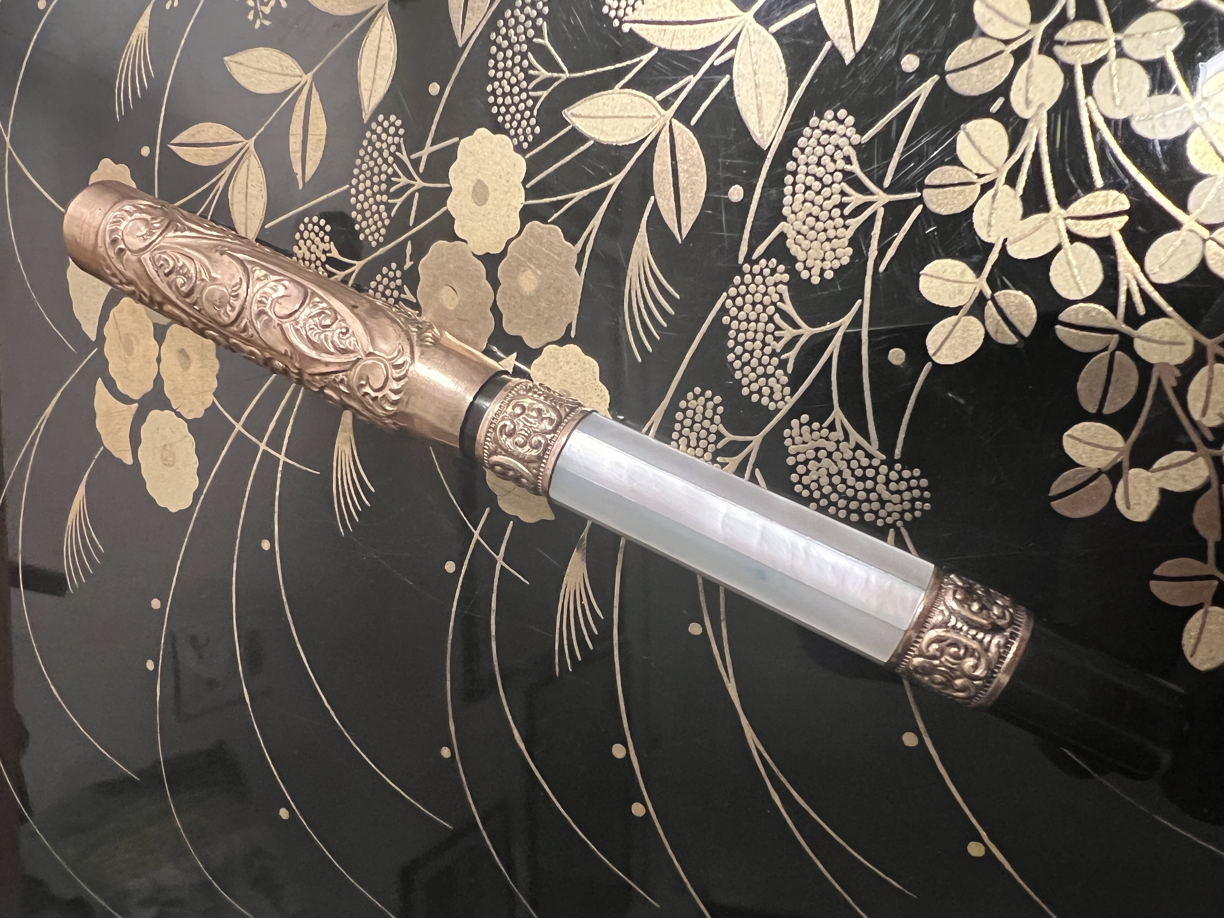 Buonasera, ecco alcune fotografie della mia ultima penna. È una penna stilografica in madreperla senza marchio del produttore, per quanto posso vedere. Non ho idea di chi l'abbia realizzata, ma è una penna bellissima. Non aveva il pennino, quindi ho montato un pennino Parker Lucky Curve e scrive molto bene. Qualsiasi aiuto per identificarla sarebbe molto apprezzato. Grazie.