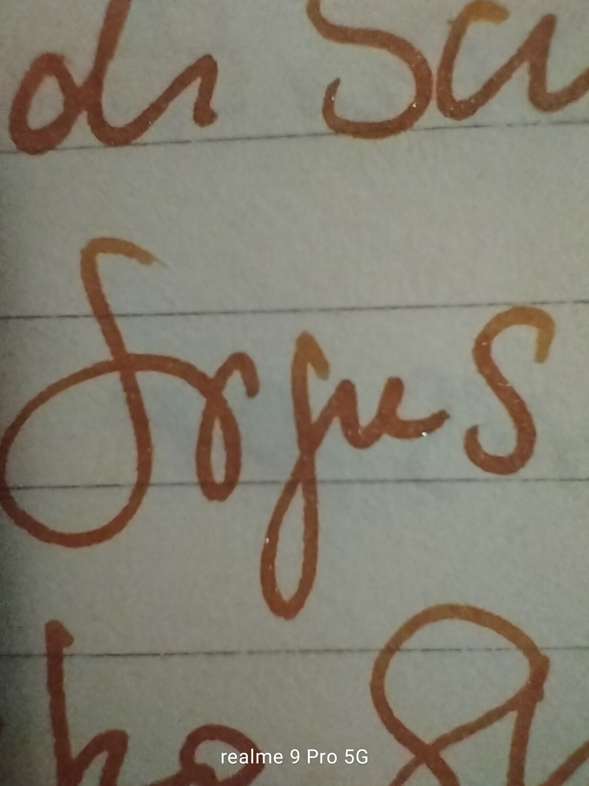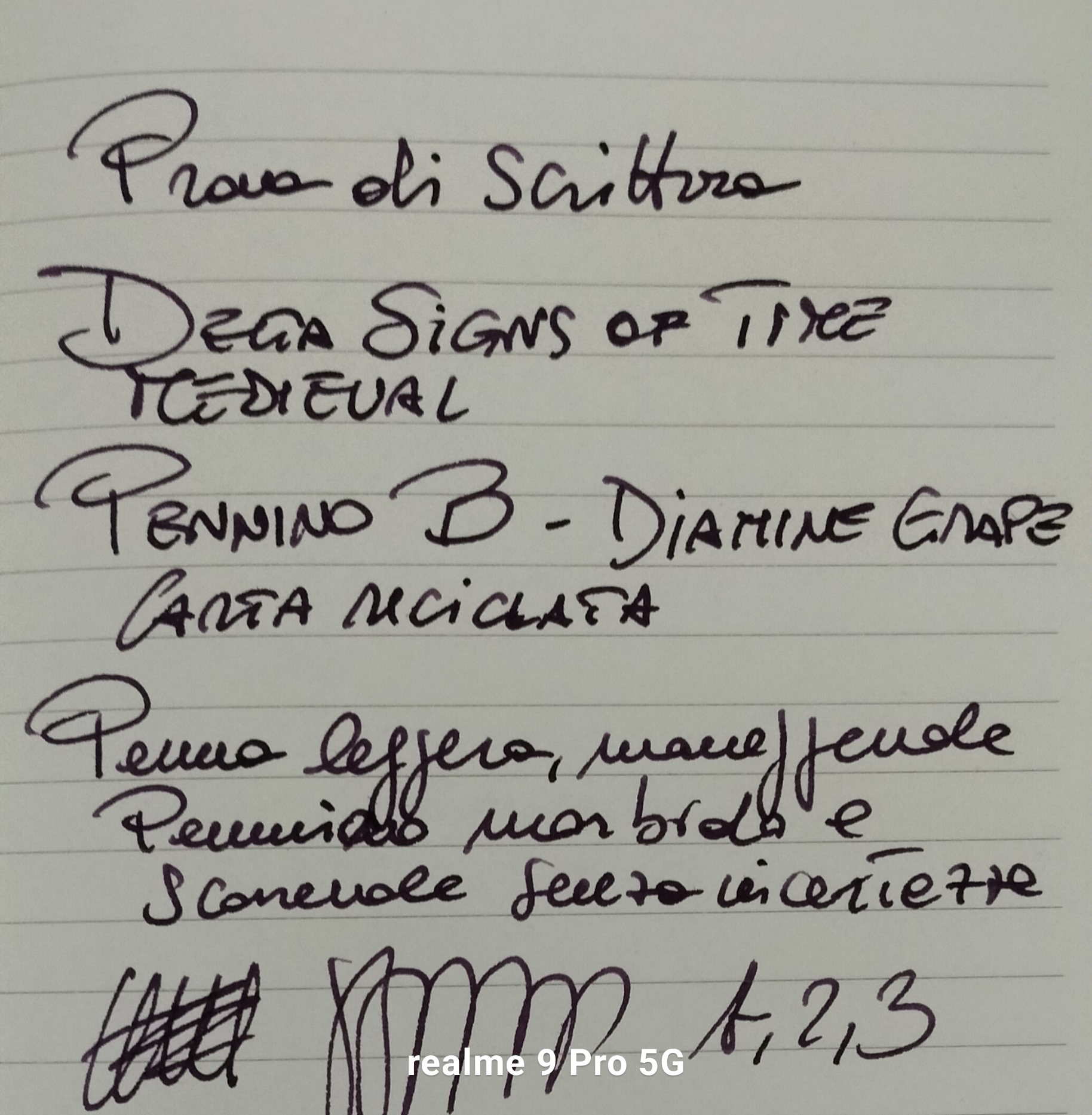 Dopo tanto tempo mi accingo nuovamente a una recensione. Si tratta del modello "Medieval" della nuova serie Segni del Tempo della Delta. La penna è contenuta in un piccolo scatolo di cartone leggero. Al suo interno troviamo anche la brochure su tutta la serie. La penna è dotata di converter. Esteticamente mi piace molto, ricorda le vetrate gotiche con il gioco di colori scuri. Ho preso un pennino B, risultato morbido e scorrevole. Penna leggera e maneggevole, della giusta lunghezza e peso, almeno per le mie mani. Il cappuccio calzato non comporta nessuno squilibrio. Allego le foto della penna e di due prove di scrittura: stessa carta, due inchiostri diversi, di cui uno shimmer lo splendido J.Herbin Cornaline d'Egypte (con tanto di particolare)