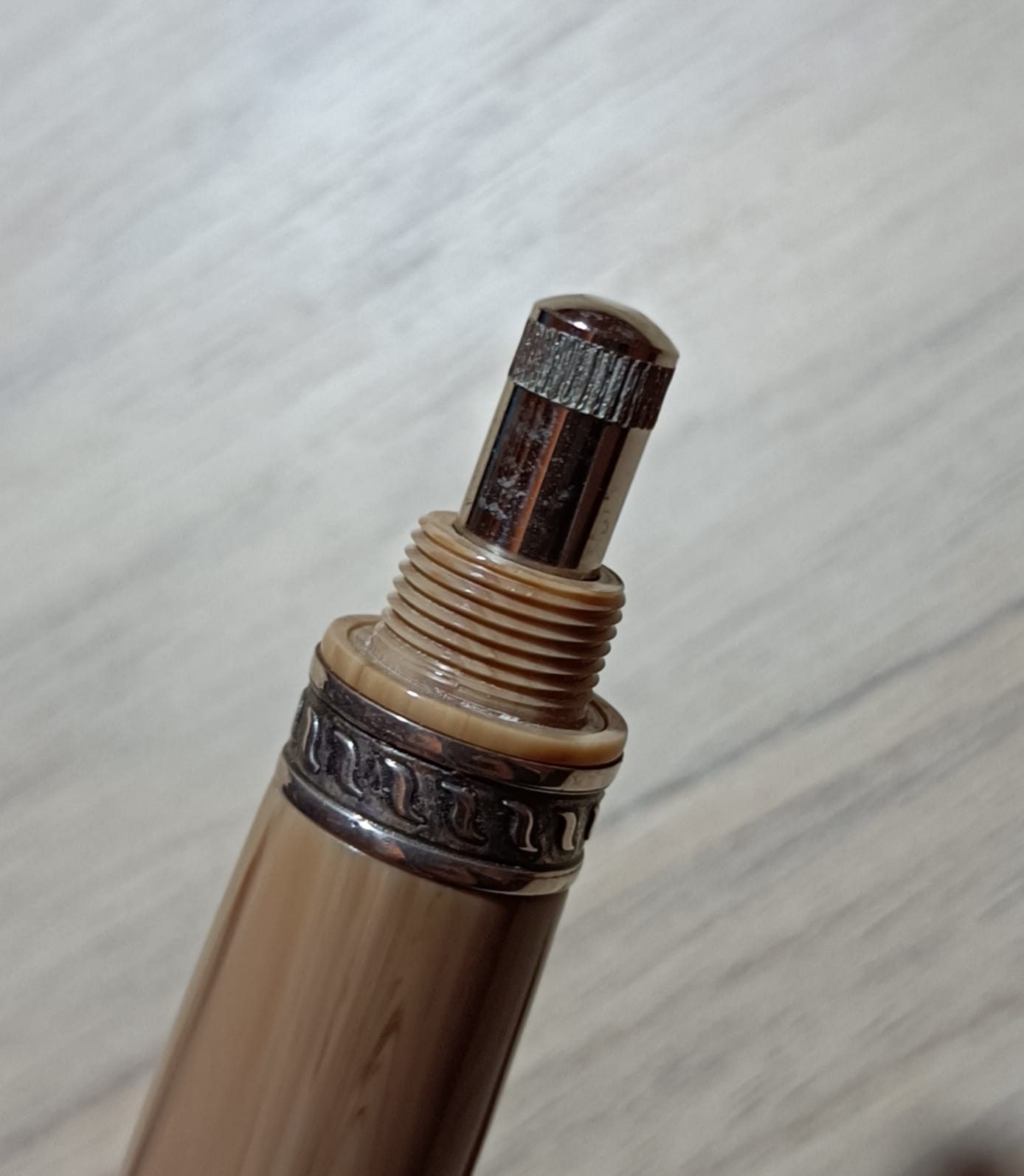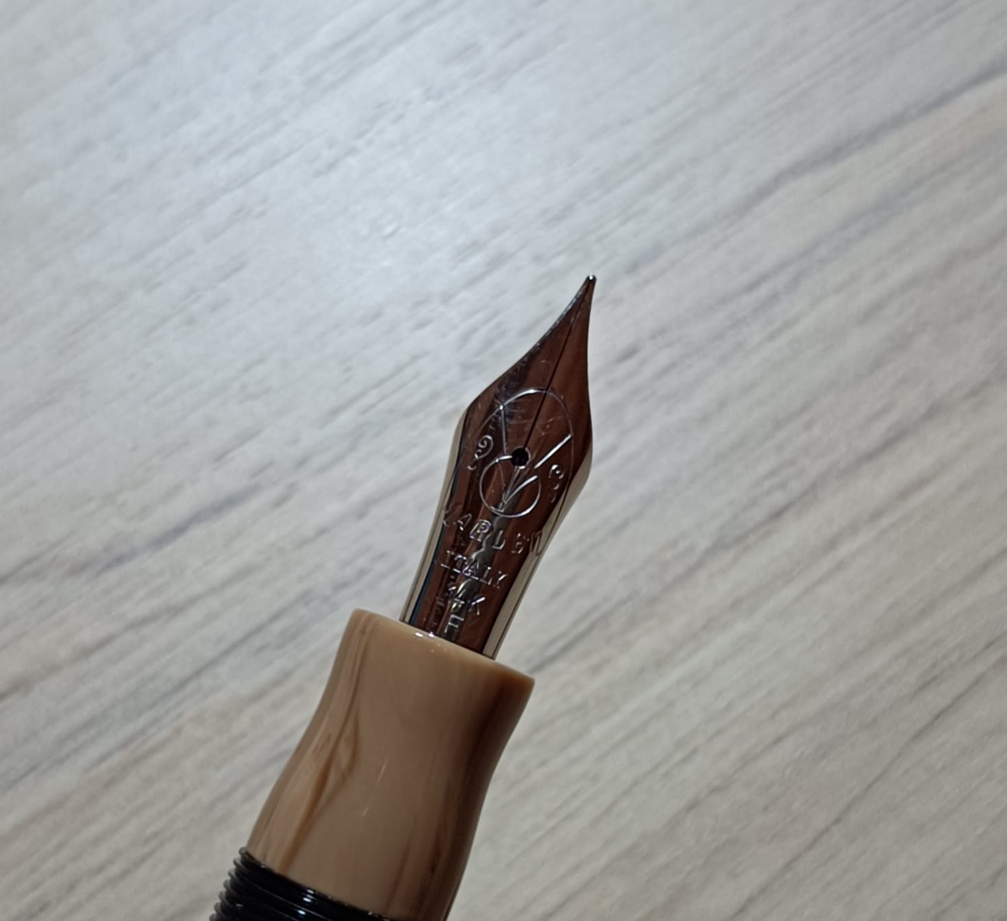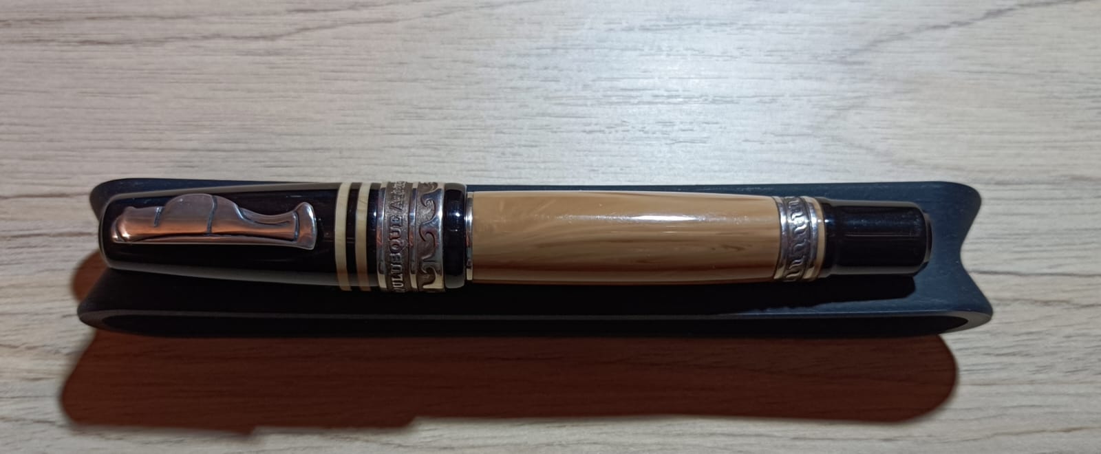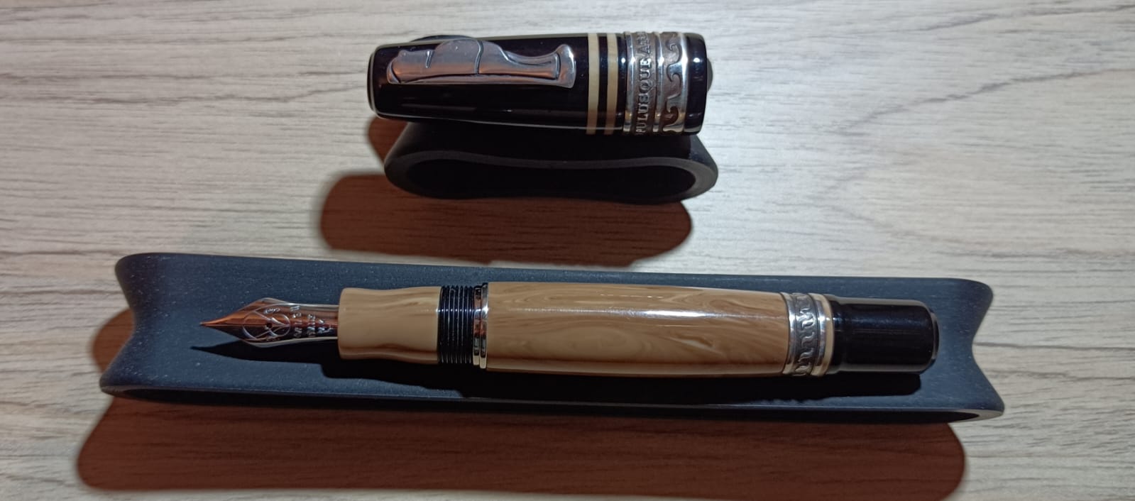 Cominciamo dunque con la descrizione esteriore: si tratta di una penna dalle estremità tronche, in resina italiana tornita da barra piena e minuterie in parte in metallo rodiato, in parte in argento sterling. Il cappuccio in resina nera ha sommità piatta con un leggero scalino che forma un disco in rilievo di diametro di poco inferiore a quello del cappuccio, poco sotto il bordo del cappuccio troviamo l'attaccatura del fermaglio a forma di figurina umana, che secondo quanto riportato dalla stessa Marlen rappresenta Maccus, maschera tipica della fabula atellana, un tipo di commedia popolare italica (questo è l'unico elemento che non sono sicuro se sia argento o meno: esteticamente mi pare argento, ma non riesco a individuare il punzone da nessuna parte, neanche guardando con una torcia sotto, quindi o è molto piccolo e ben nascosto, o non c'è), poco dopo la fine del fermaglio la resina nera è interrotta da due anelli in resina marrone chiaro con venature più scure (la stessa in cui è realizzato il corpo, ne parlerò meglio dopo), dopo le quali troviamo una spessa fascia in argento. Questa grossa fascia presenta due anelli lisci in mezzo ai quali troviamo in altorilievo la scritta “ordo populusque atellanus”, al di sotto c'è un'ultima fascia alla cui base vi è un motivo a onde stilizzate. Il cappuccio termina poi con un labbro di nuovo in resina nera. Sulla parte opposta al fermaglio, appena sopra ai due anelli in resina colorata, vi sono le incisioni “Marlen” (in corsivo), “Italy”, “Aderl” e infine il numero di serie, in questo esemplare il numero 623. Subito dopo il cappuccio inizia il fusto in resina marrone con un sottile anello metallico, per poi proseguire con una leggera entasi al centro, cui segue un restringimento verso il fondello. Mi soffermo un attimo sulla resina: il marrone chiaro con venature più scure mi ricorda molto il legno d'ulivo, e questo potrebbe essere un altro rimando ai territori da cui trae ispirazione la penna (ma questa è una mia supposizione, il produttore non lo dice). Poco prima della fine del fusto e dell'inizio del fondello vi è un'altra fascia in argento, con due fasce lisce alle estremità e un motivo a “S” al centro. Troviamo infine il fondello, in resina nera come il cappuccio, che presenta un restringimento all'inizio e termina in modo speculare al cappuccio con il piccolo scalino che forma il disco. Una volta svitato il cappuccio si scopre il resto dell'anellino metallico che si vedeva appena sotto il cappuccio, una fascia in resa nera in cui è ricavata la lunga filettatura e infine la sezione dello stesso materiale del fusto, la quale presenta un leggero restringimento appena prima di allargarsi nuovamente verso il labbro con cui conclude. Le dimensioni sono 133mm chiusa, 121mm aperta (pennino compreso). Il peso è di 37 grammi con cappuccio e 22 grammi senza.