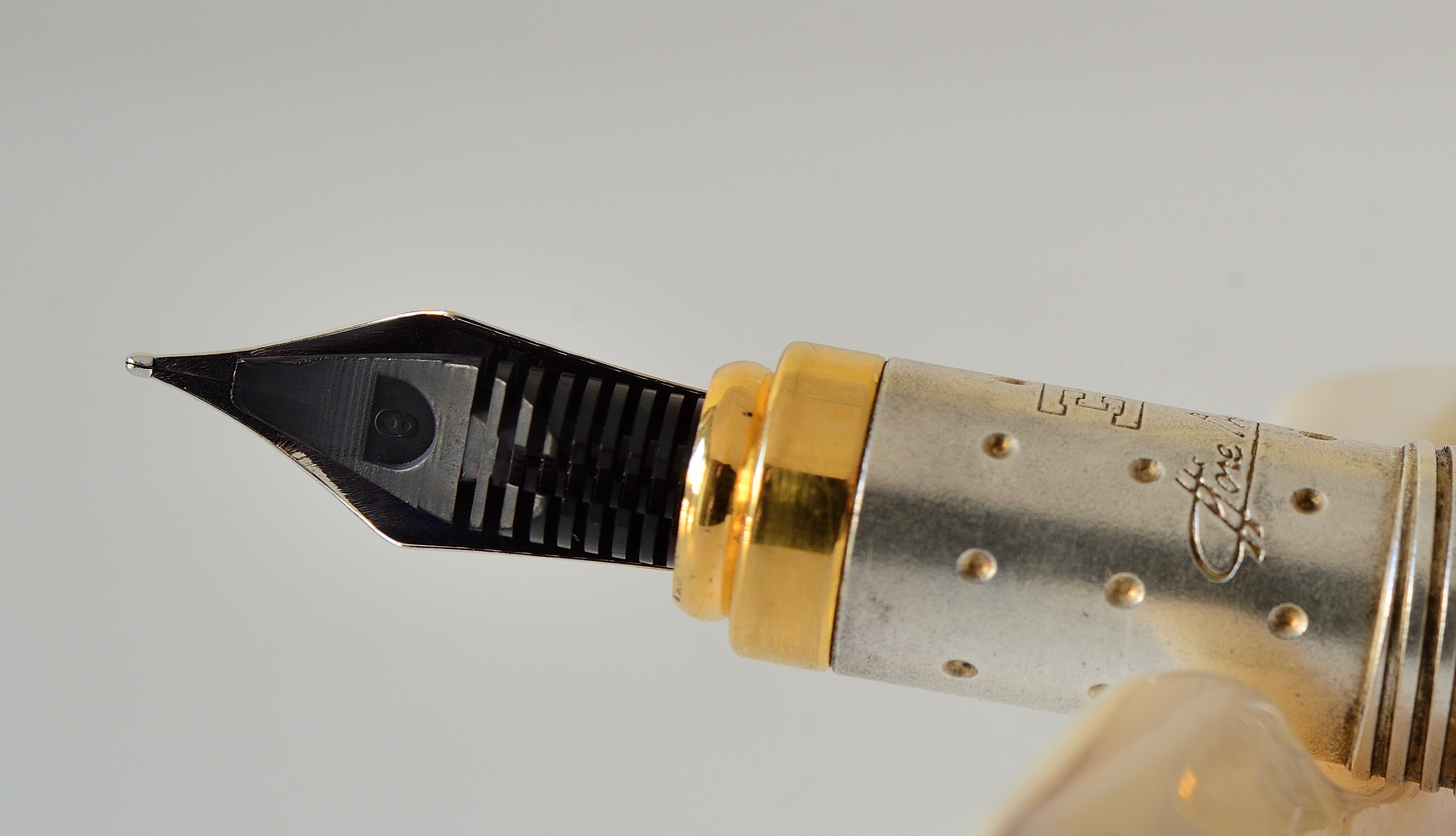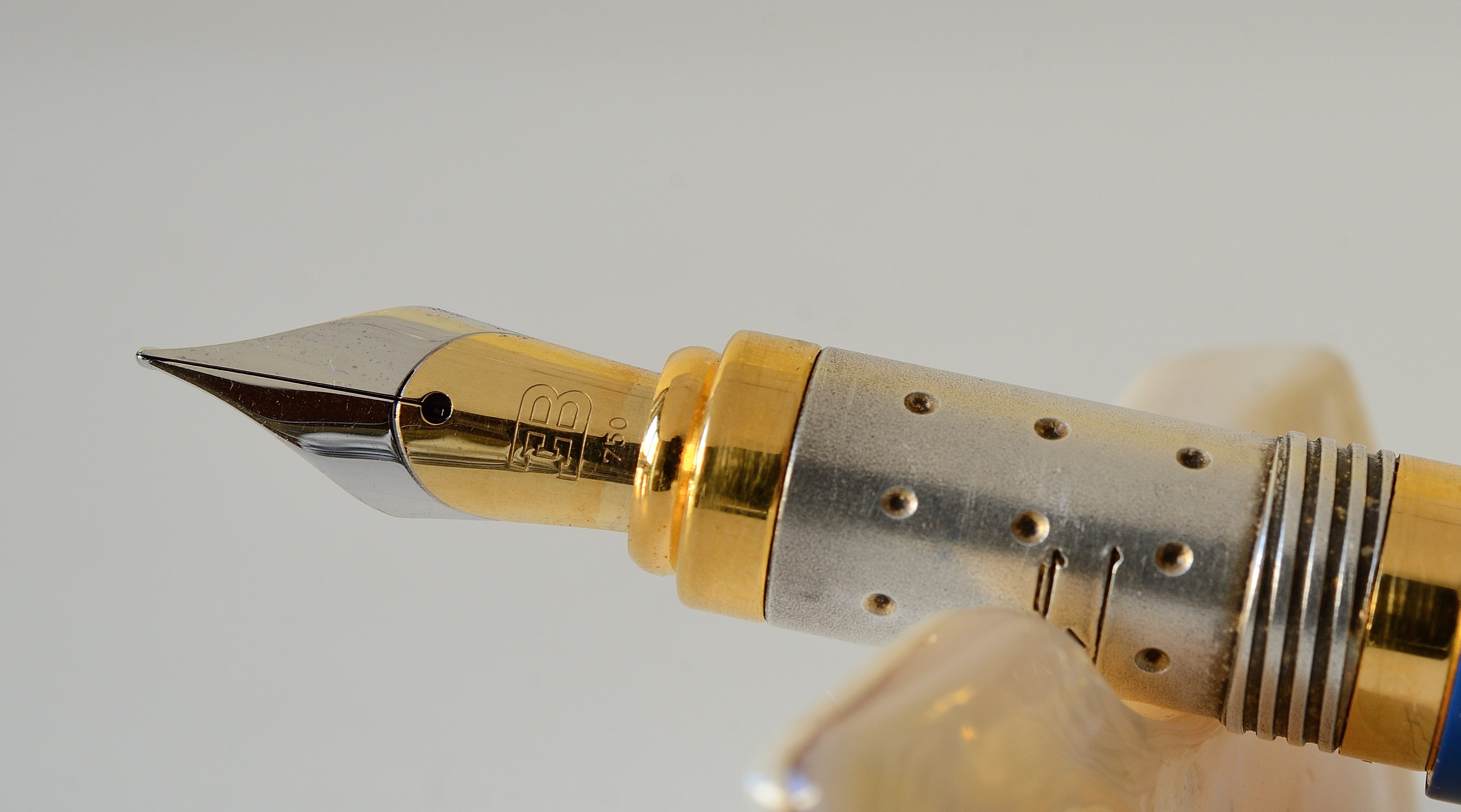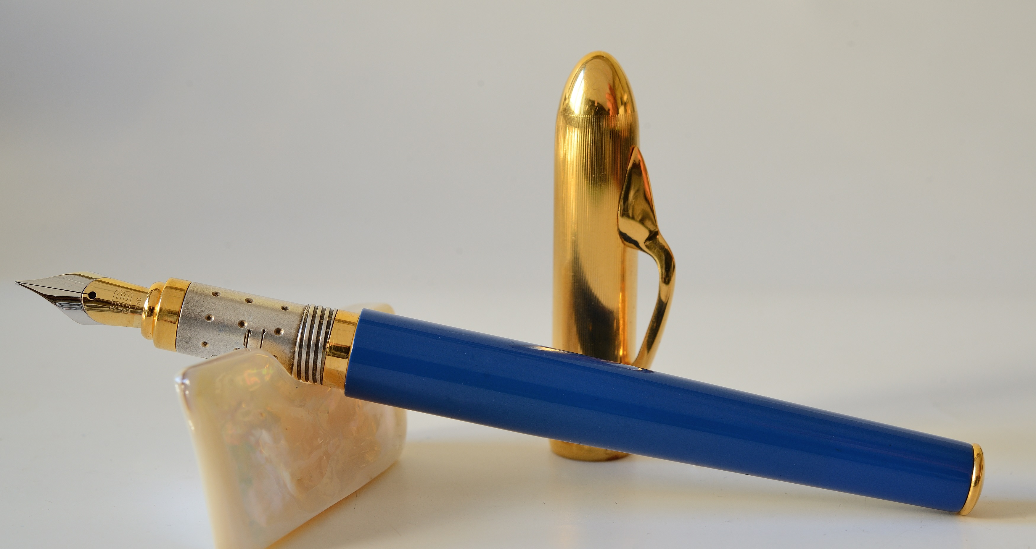 Questa volta dovrebbe trattarsi di una stilografica Ettore Bugatti Type 50. Dalle poche informazioni reperite in rete, dovrebbe essere stata prodotta, credo negli anni 90, dalla Montegrappa, in esclusiva per le boutique Bugatti (mai vista una). Ha fusto in ottone laccato blu, cappuccio dorato, la clip ha la forma dell’automobile Bugatti T 50 (da cui il nome), alcuni, invece, la fanno risalire alla Bugatti T 57 Atlantic. La giunzione fusto-sezione realizzata metallo su metallo, assicura ottima stabilità. Sezione argentata con fossette, a riprendere il motivo della tappezzeria classica Bugatti. Il pennino, tra F ed M, è bicolore, in oro18K, alimentatore credo in ebanite. Caricamento cartuccia/converter di tipo Pelikan. Come al solito NOS, mai inchiostrata, completa della sua scatolina prismatica in legno.