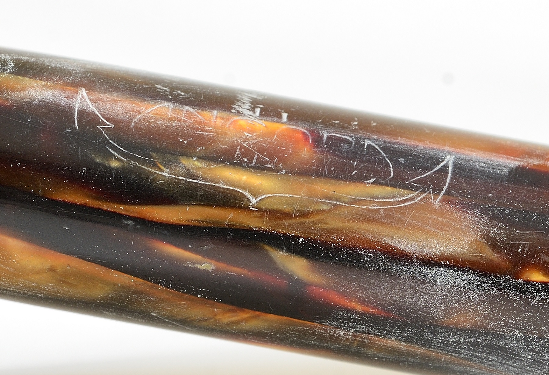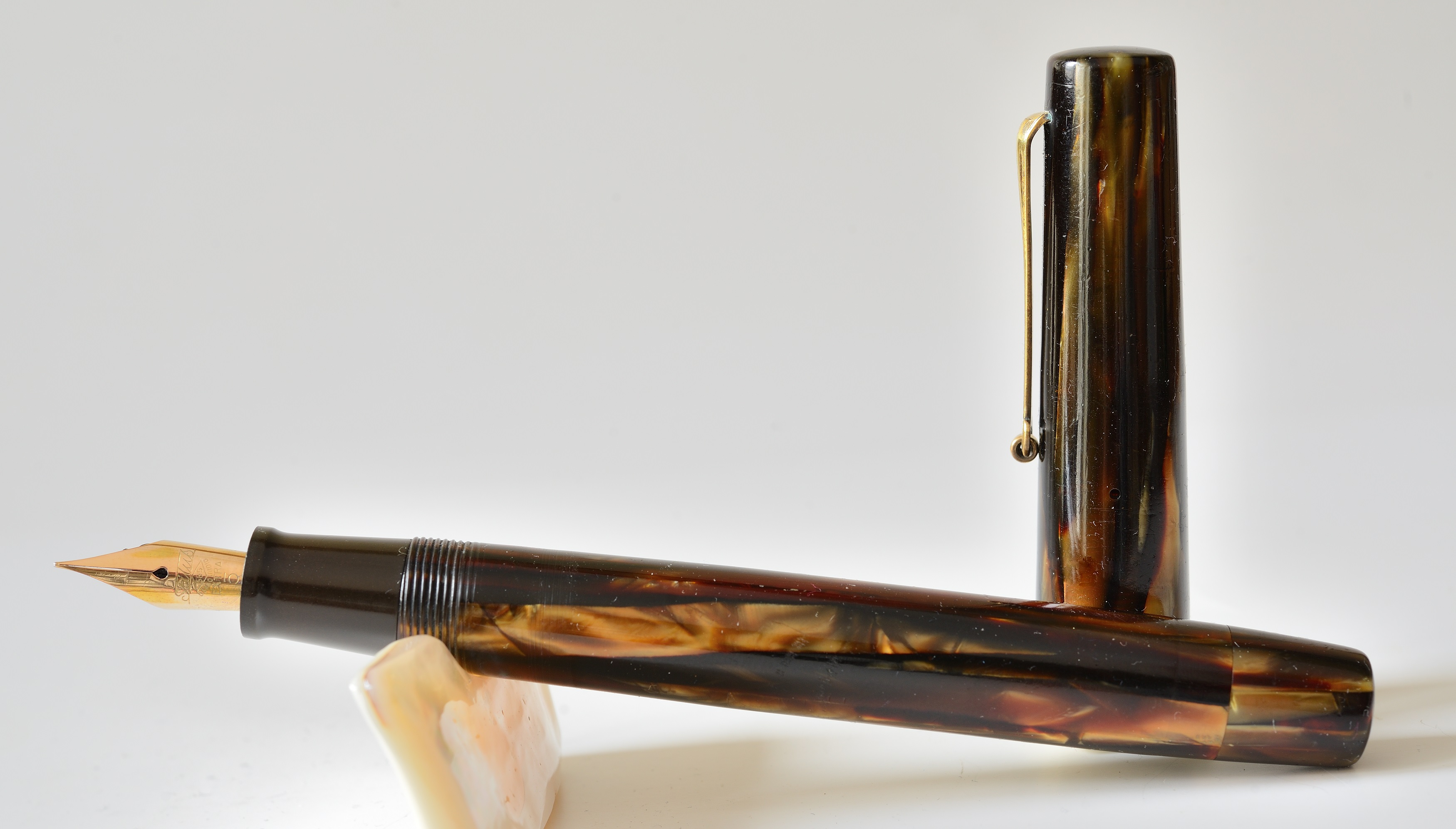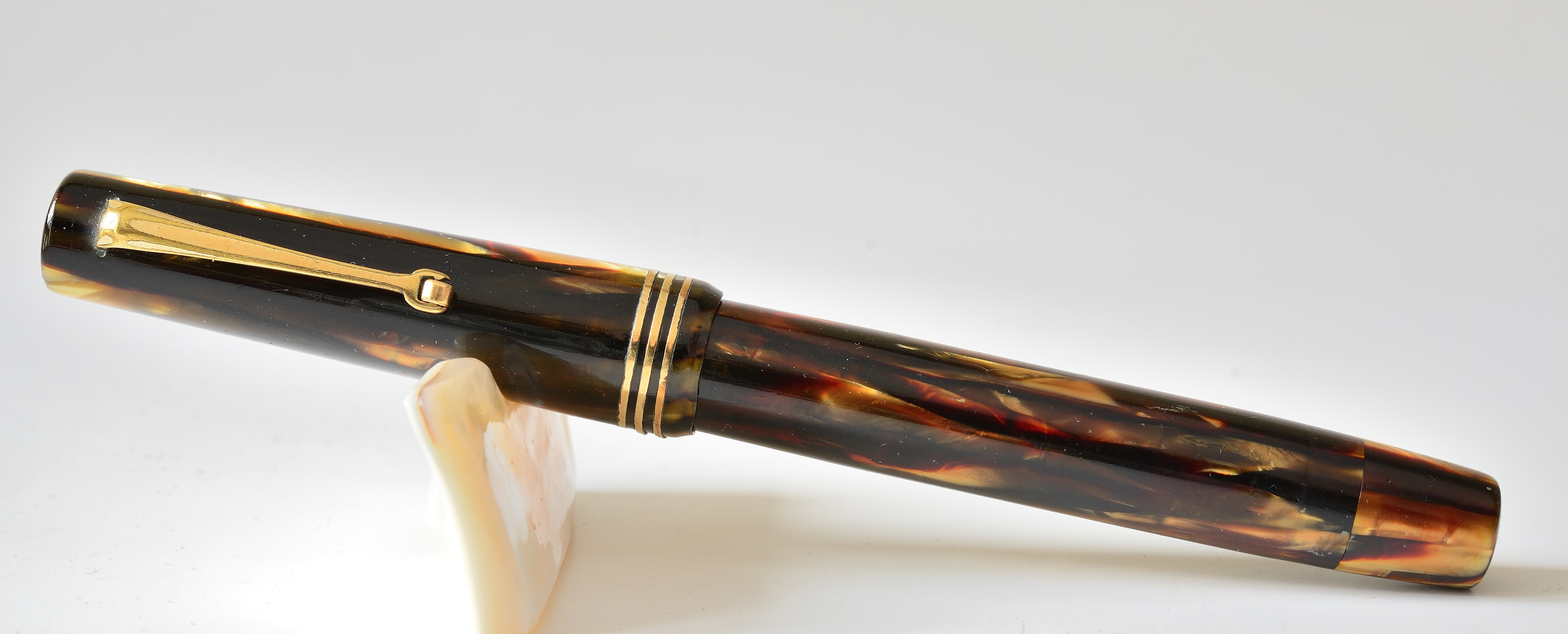 Si tratta di una stilografica Ancora 4 prodotta, probabilmente, nella seconda metà degli anni 30, in una splendida celluloide tartaruga
